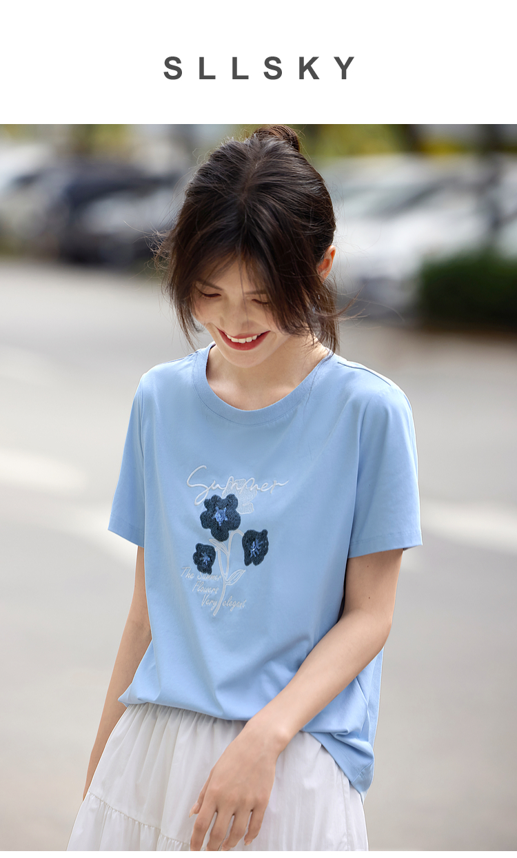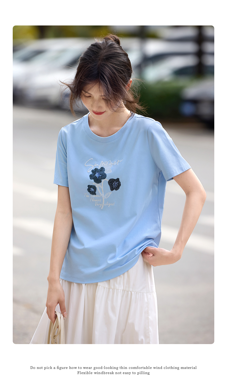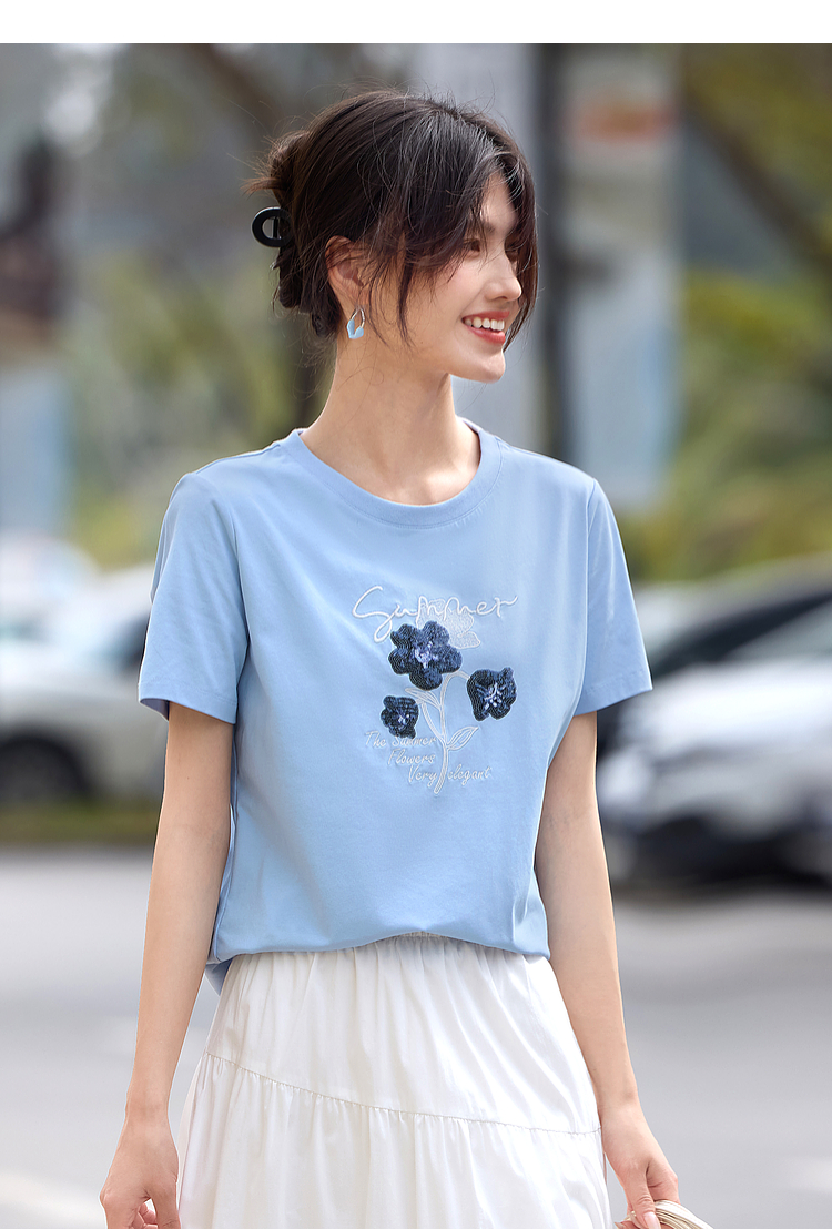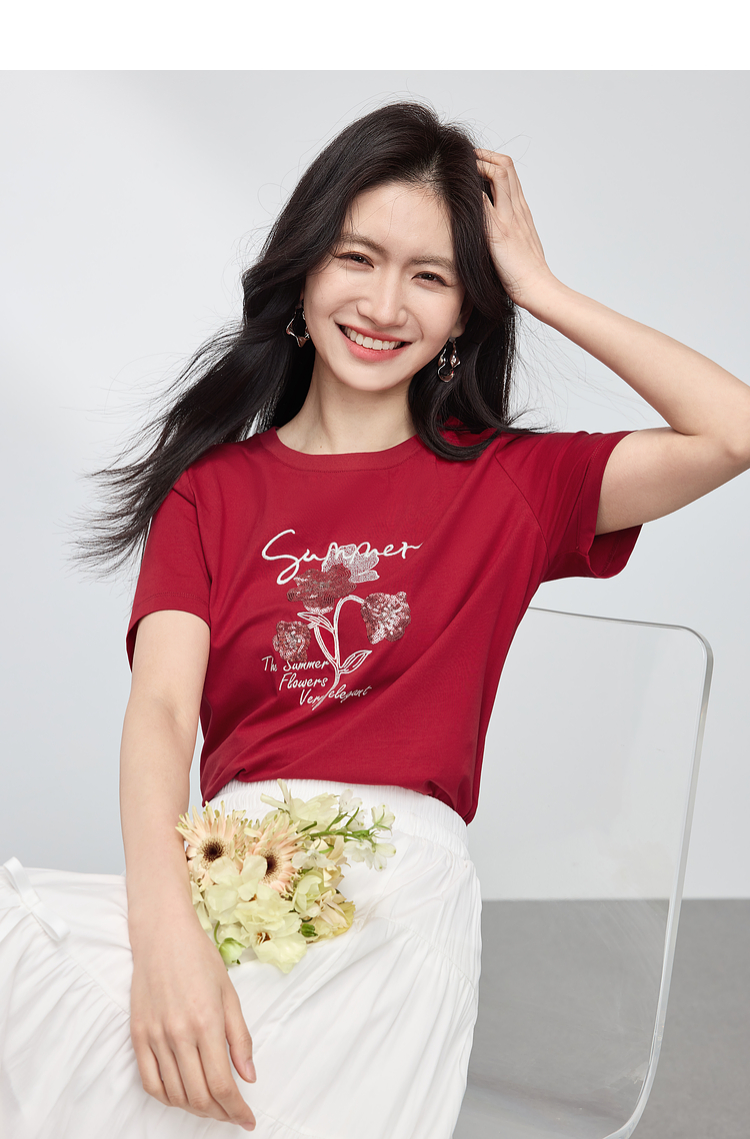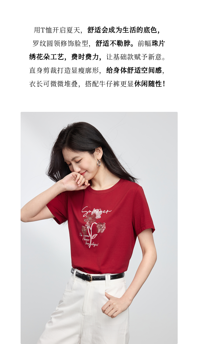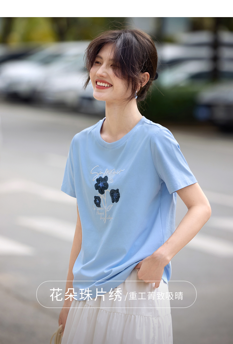 【专属特价】熙世界珠片刺绣正肩T恤女小众设计圆领短袖体恤上衣2025夏装新款