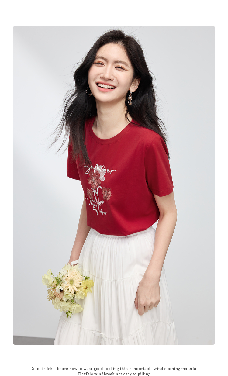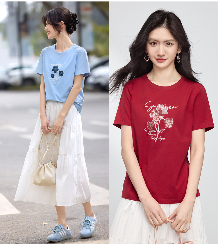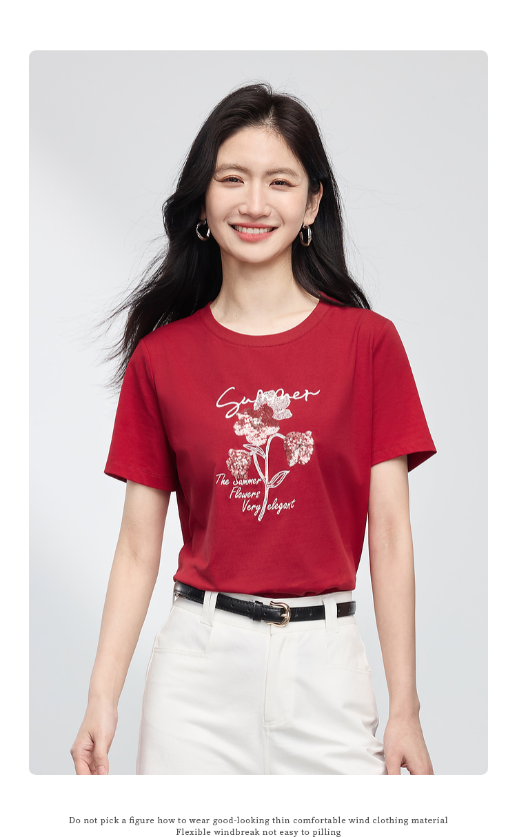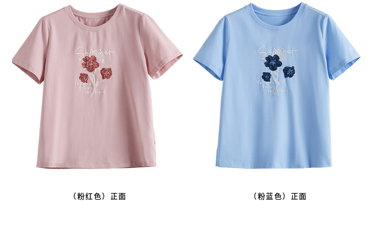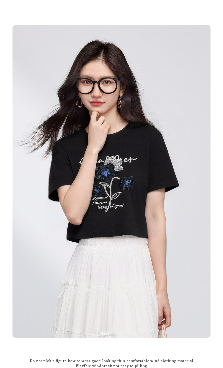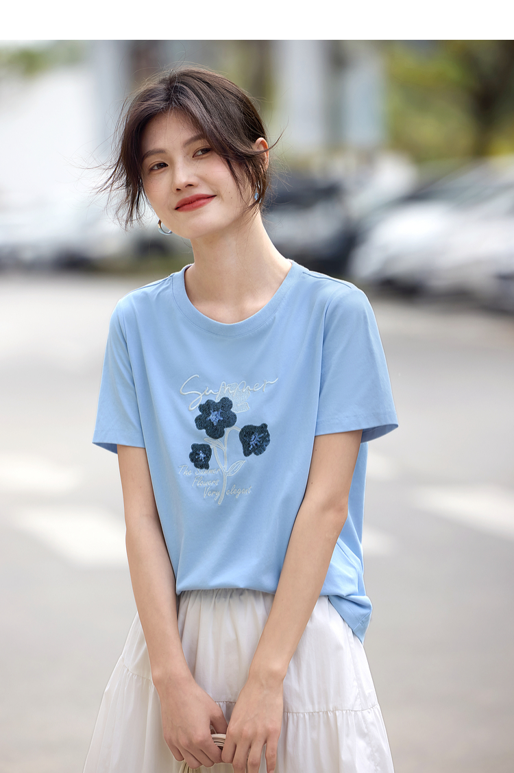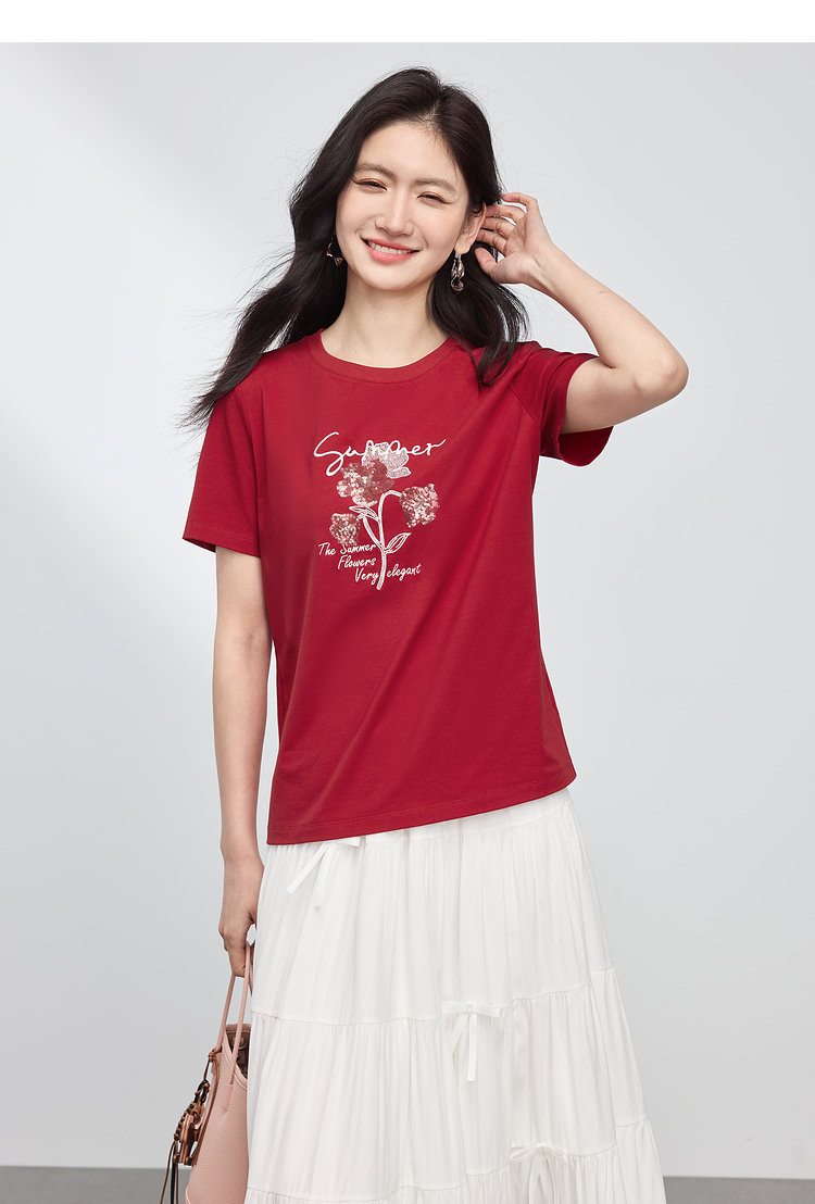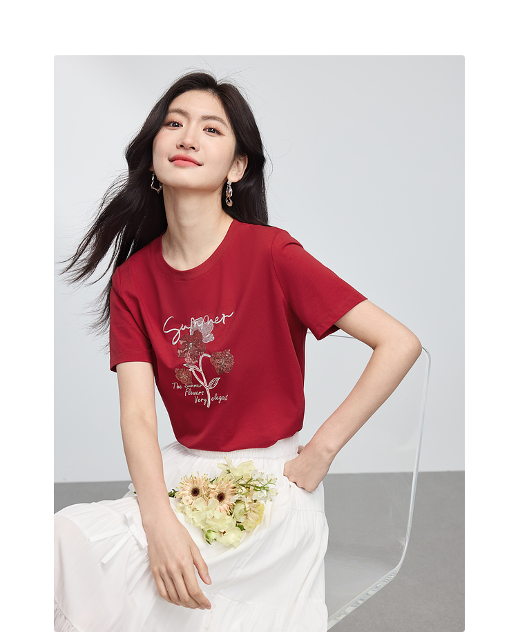 【专属特价】熙世界珠片刺绣正肩T恤女小众设计圆领短袖体恤上衣2025夏装新款