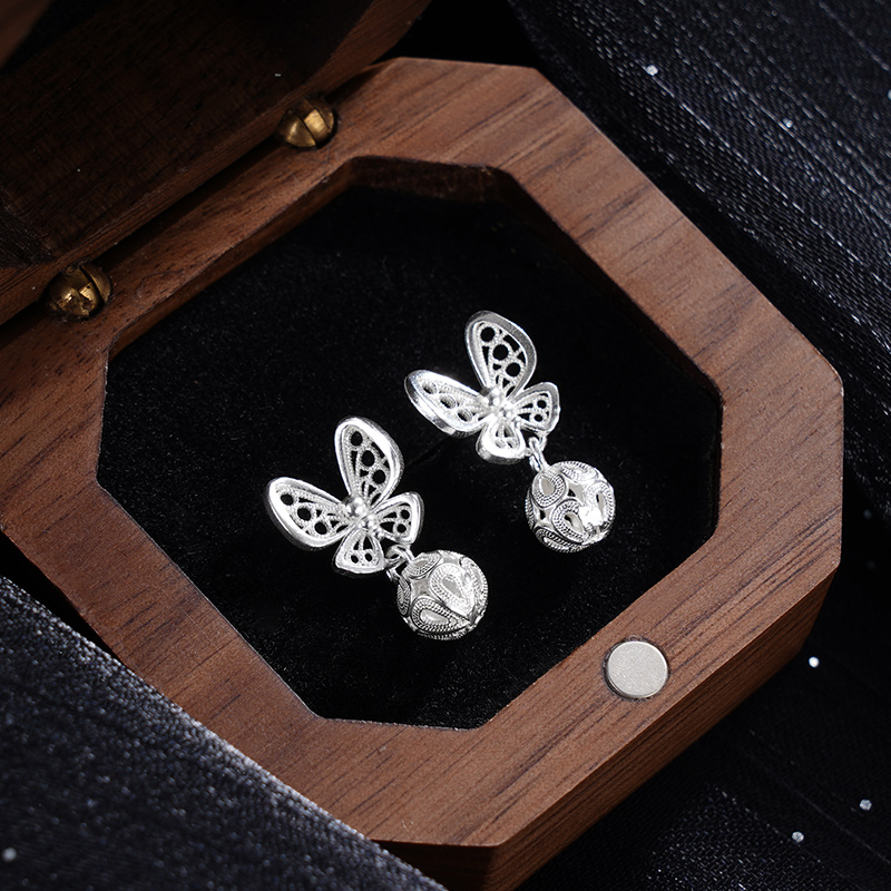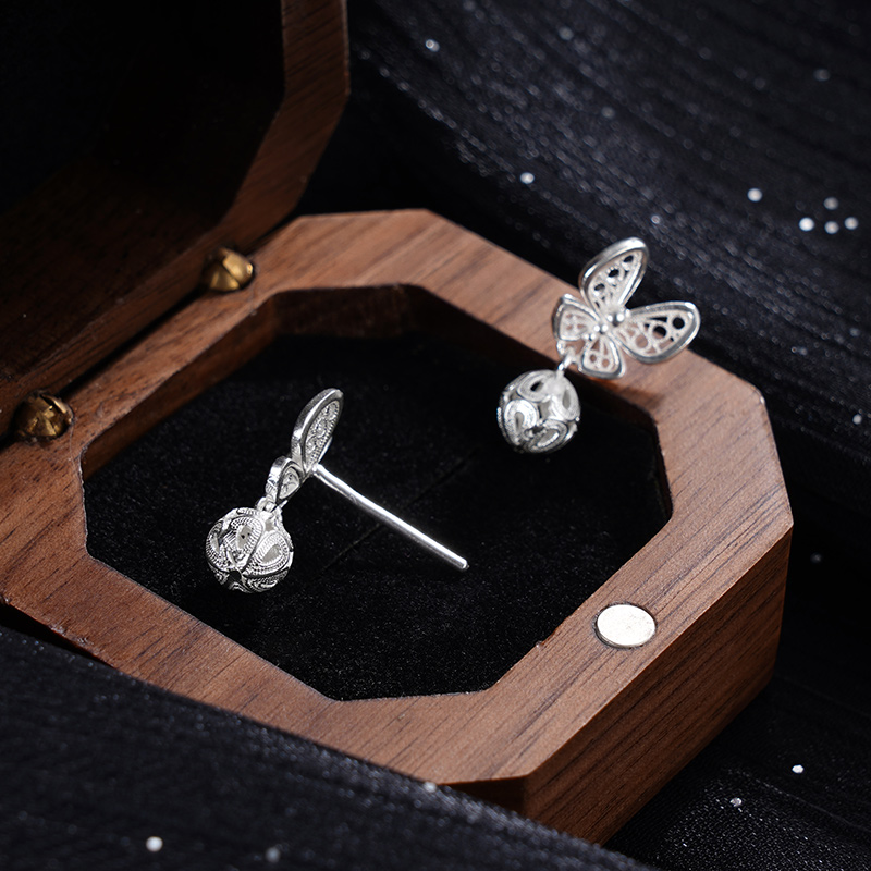 【寓意】:耳钉灵感源自蝴蝶,银花丝缠绕编织,尽显优雅与灵动。蝴蝶下方点缀小圆珠,清雅灵动,寓意福气叠加,好运绵绵。