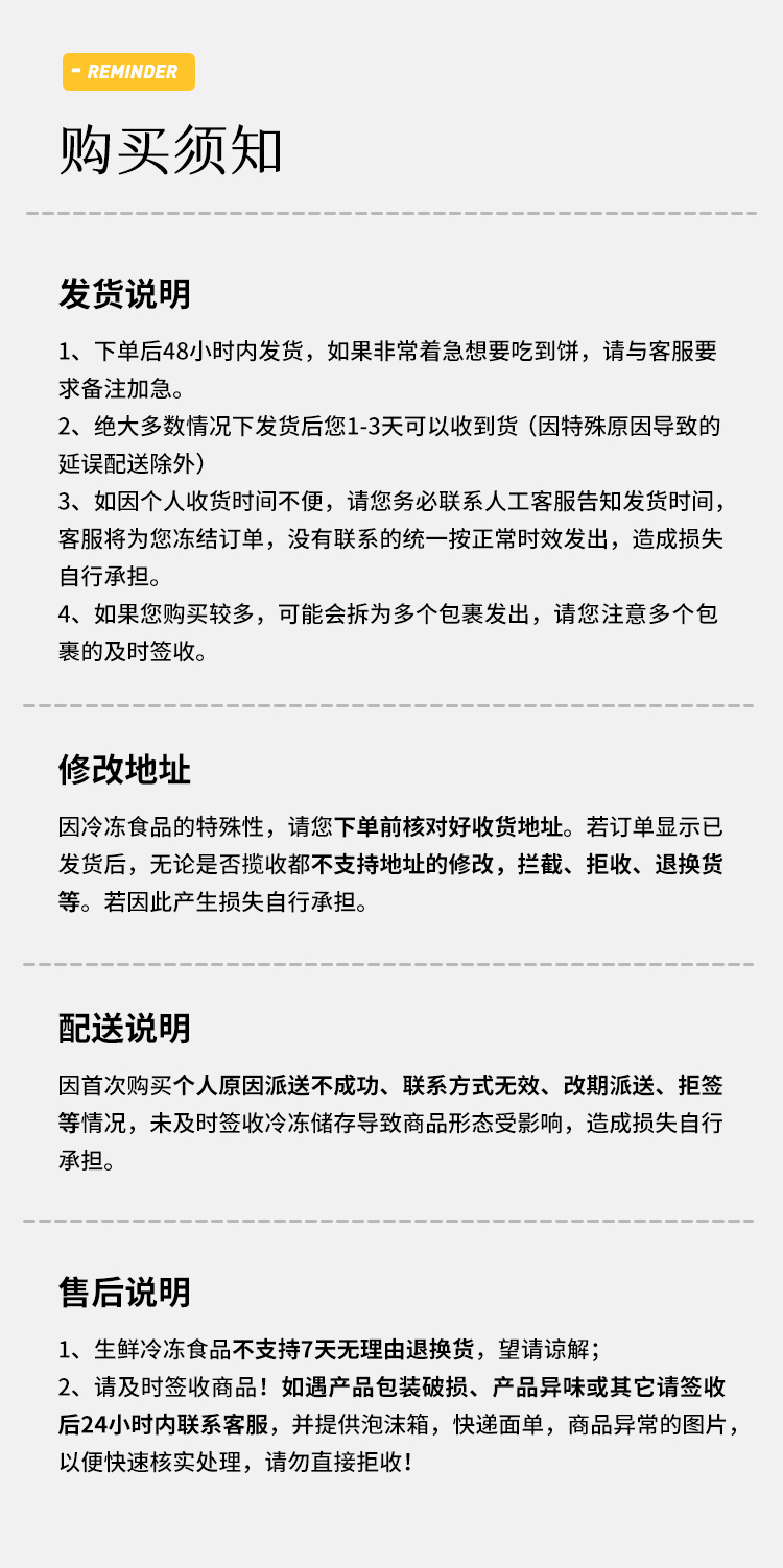 【售后】生鲜冻品,不支持改地址,不支持拦截拒收,不支持无理由退换货,有质量问题请联系客服