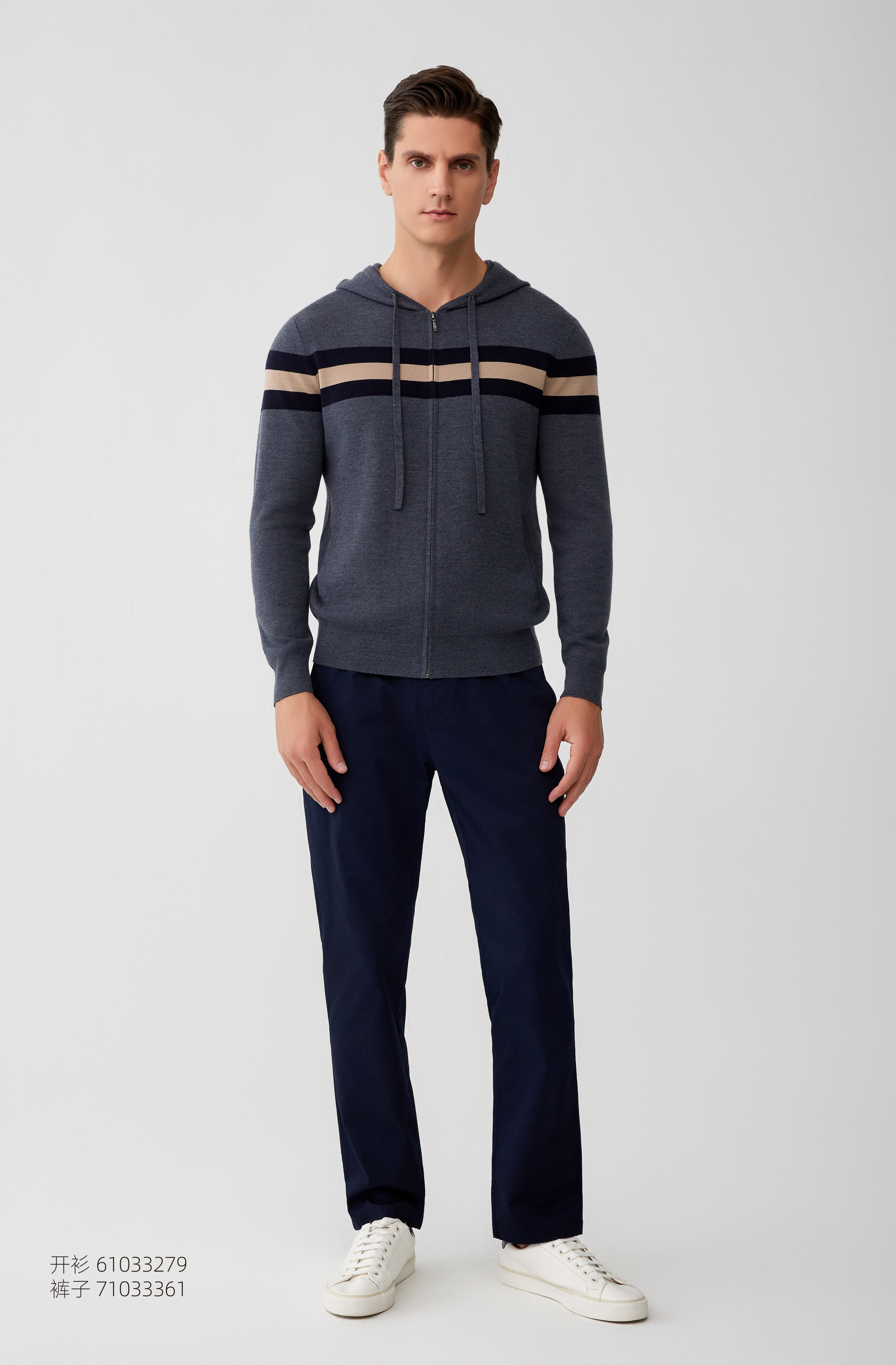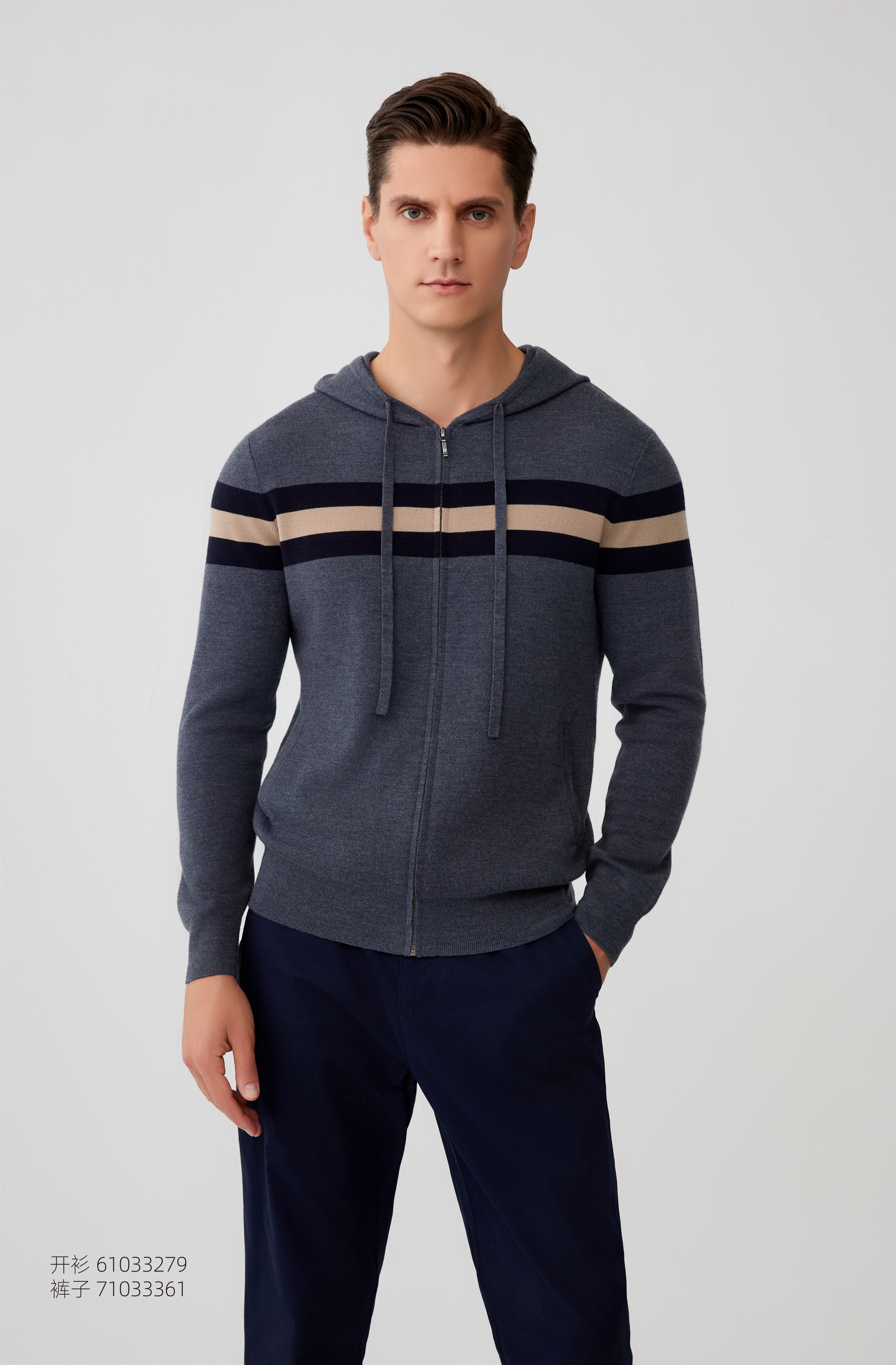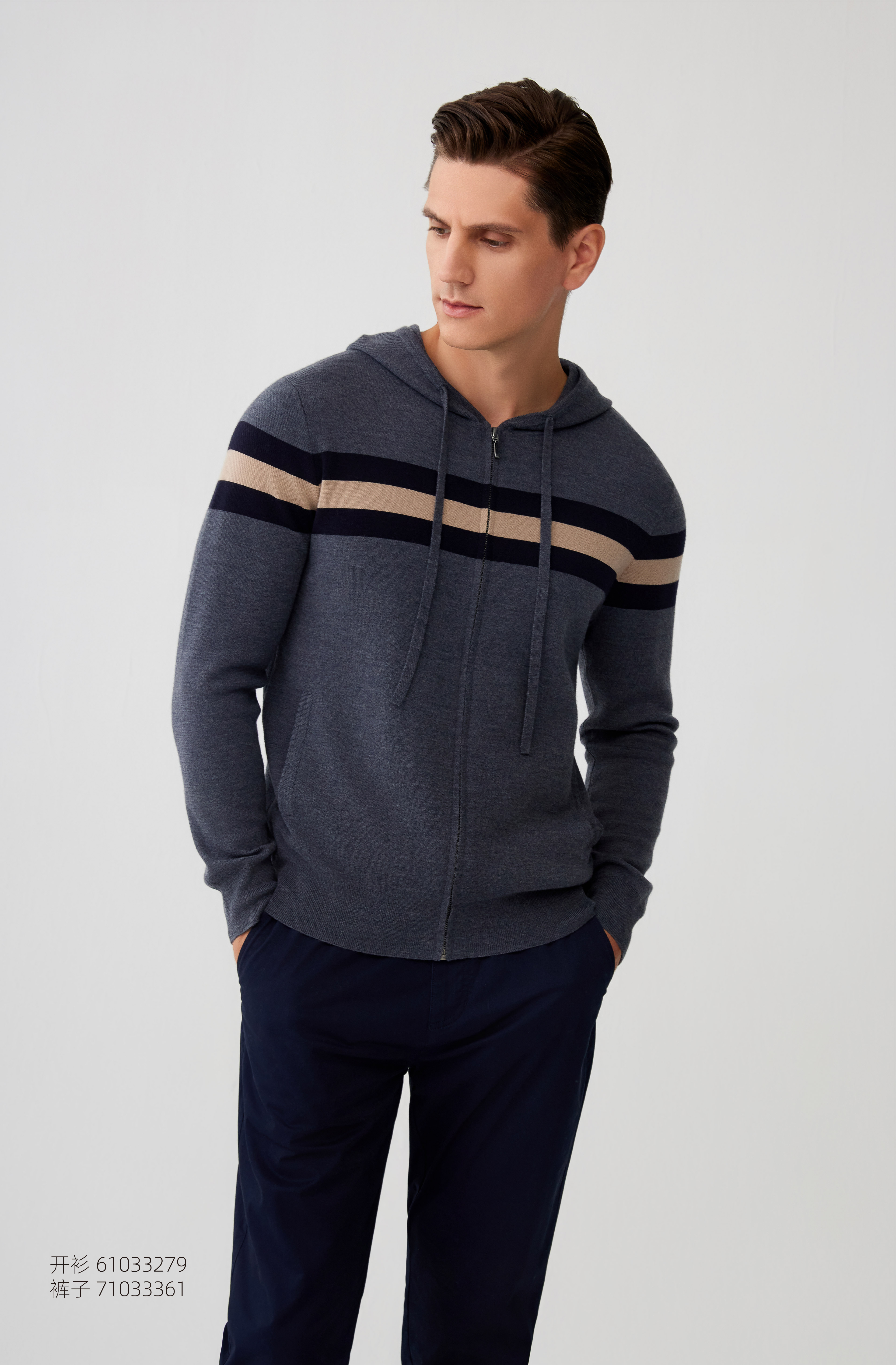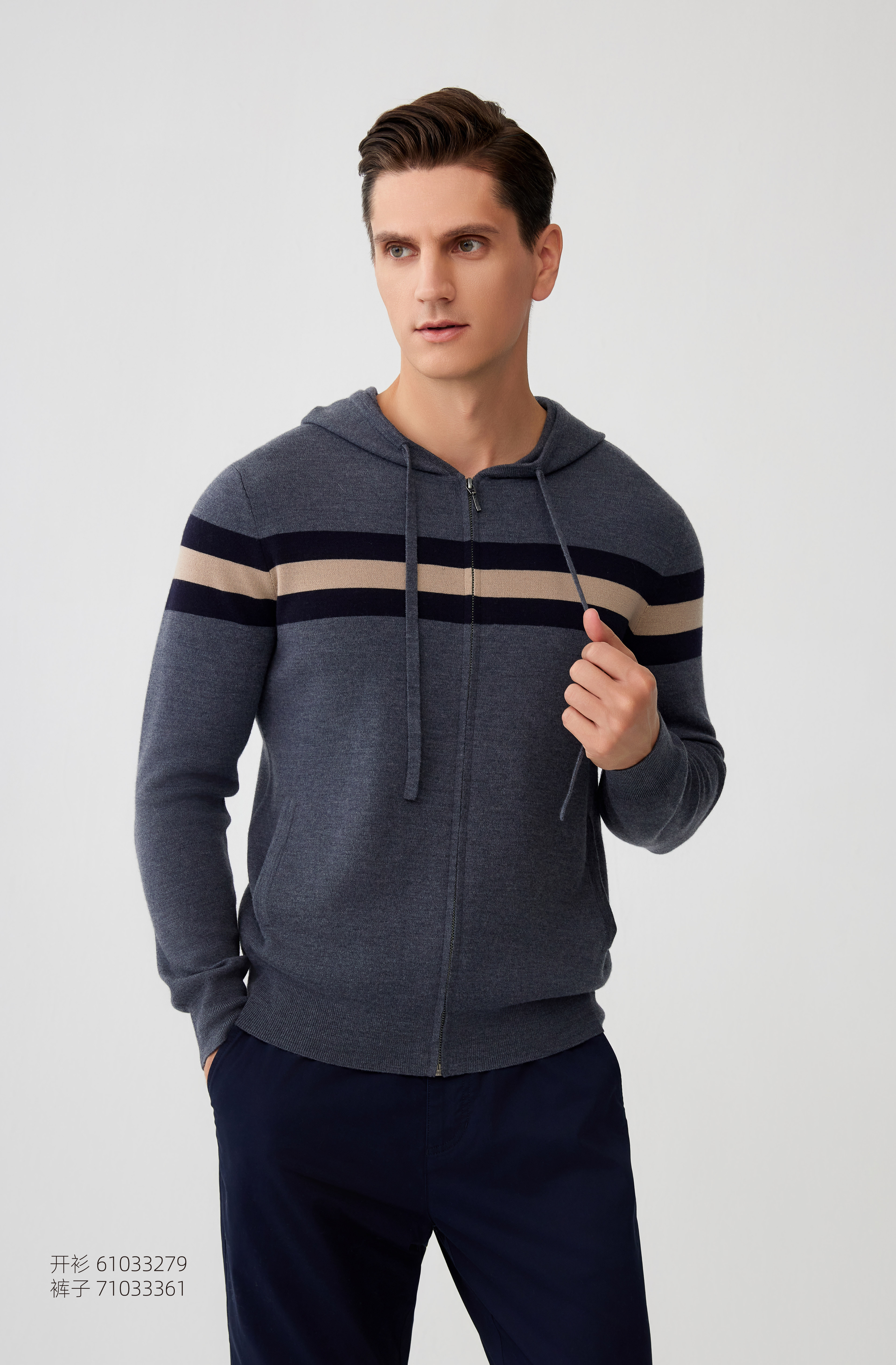 【纯羊毛连帽运动外套】23年秋冬新品男士100%羊毛针织外套时尚条纹撞色运动外套