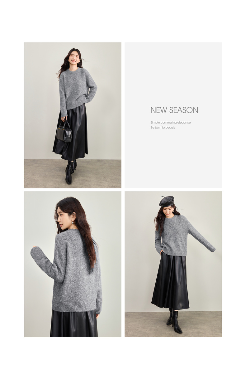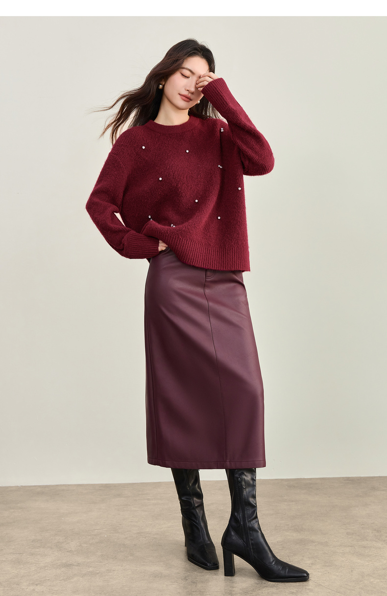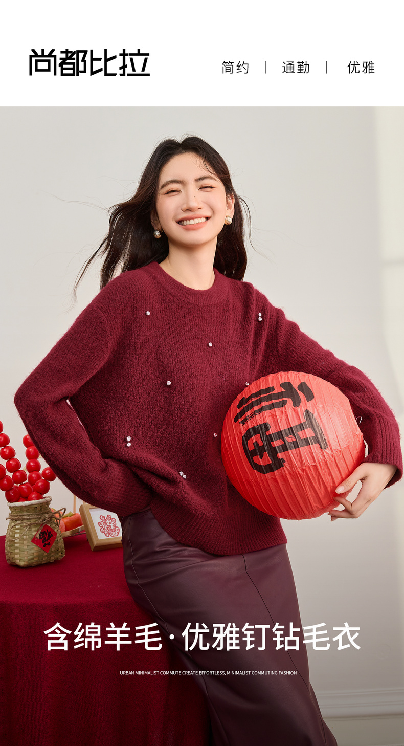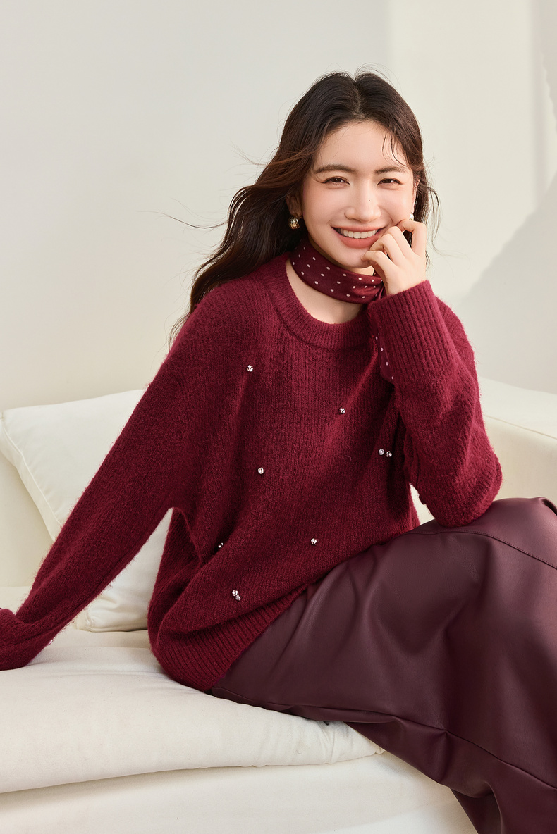 【内购】【含绵羊毛】优雅通勤聚会手工钉钻圆领落肩宽松显瘦毛衣-W53EE3375