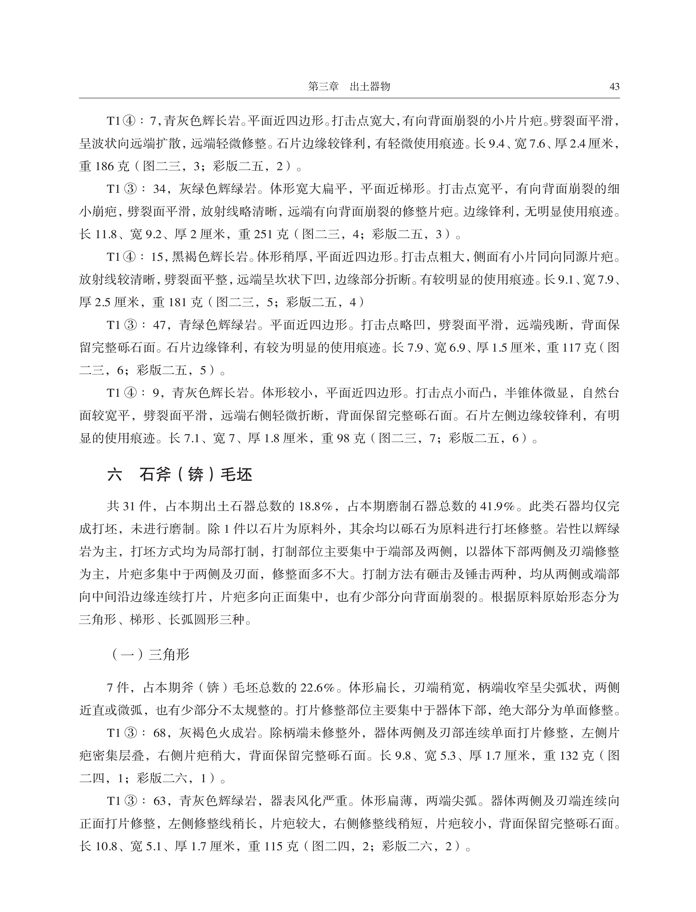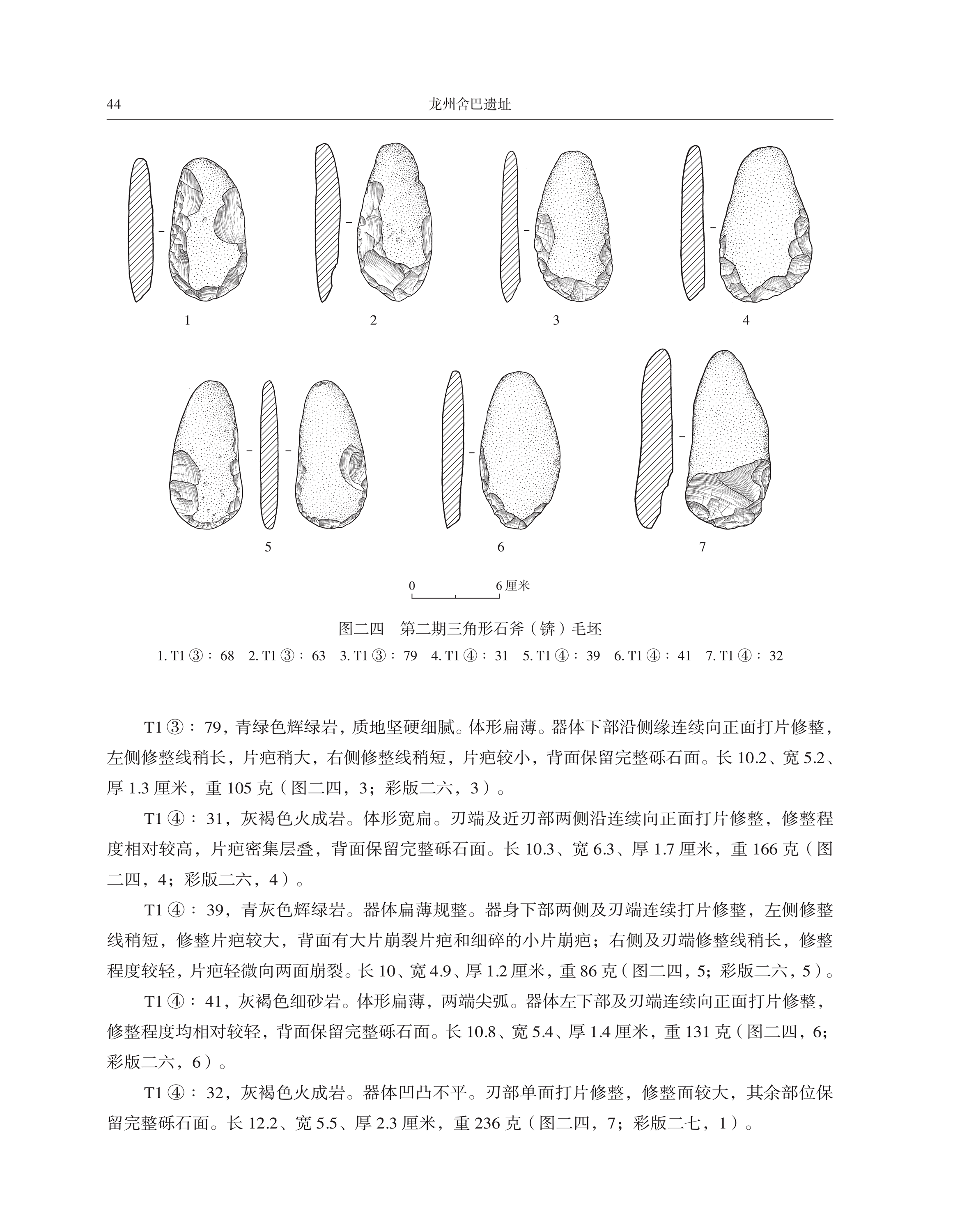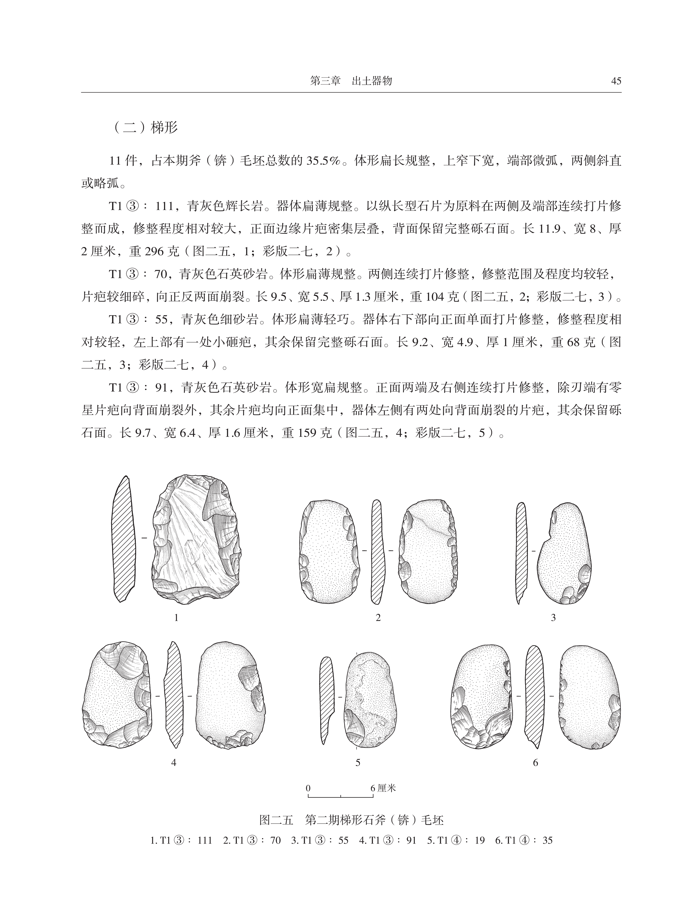 第二期为非贝丘堆积,石器特征与第一期差别不大,但生业模式发生了渔猎捕捞向渔猎采集的转变。出土遗物亦较为丰富,除大量石器外,亦包含大量动物骨骼,但依然不见陶器。石器类型主要有砍砸器、刮削器、手镐、石核、石片等纯打制石器及大量斧、锛、凿一类的先打坯后磨制的磨制石器,以石片简单修整制作的砍砸器、刮削器、手镐一类石器最具特色,年代大致在距今8000~7000年。