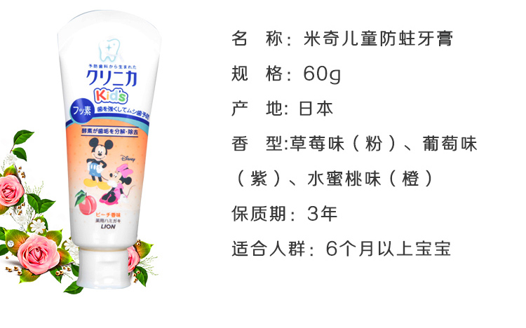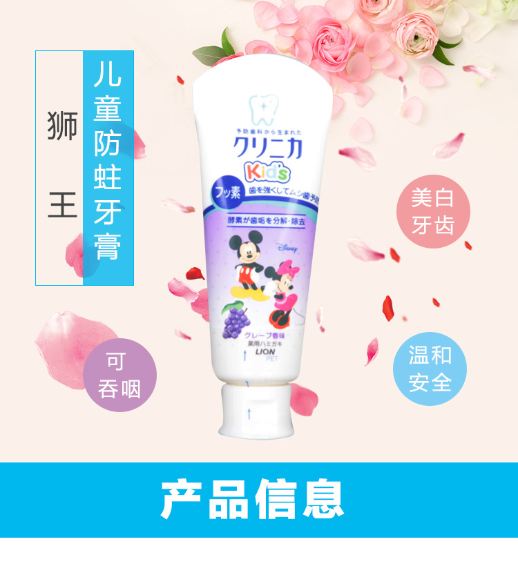 【一般贸易】日本 Lion狮王迪士尼儿童防蛀可吞咽牙膏 60g (葡萄味)