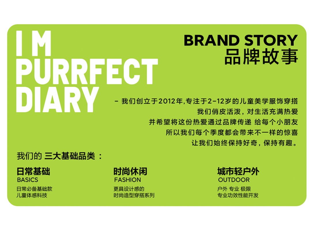 - Purrfect-Diary专注于贴近自然随性的穿着概念,轻奢平价的童装文化传播,在产品设计上更加注重婴童穿着的舒适性、安全性、更出众的国际化品牌,将欧美的育婴文化在中国进行深入的传播与推广。