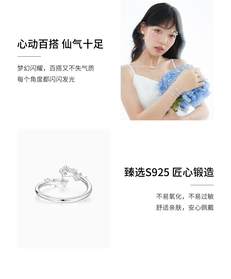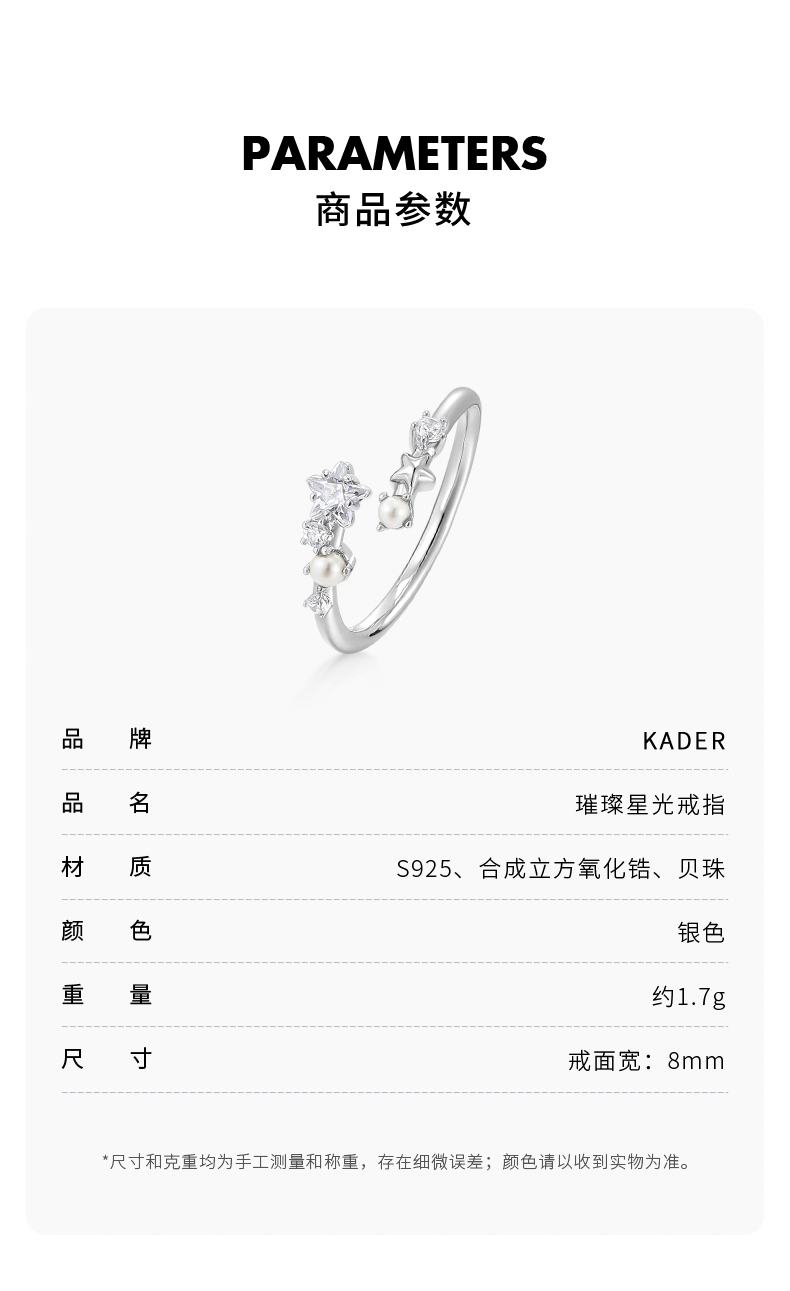 KADER卡蒂罗 璀璨星光戒指 925银闪耀流星璀璨吸睛开口可调节女戒一只 仙气百搭约会穿搭配饰 闺蜜款礼物礼盒装