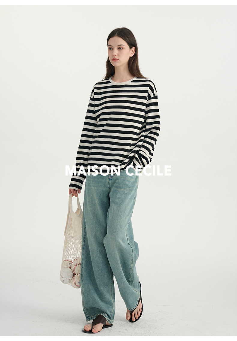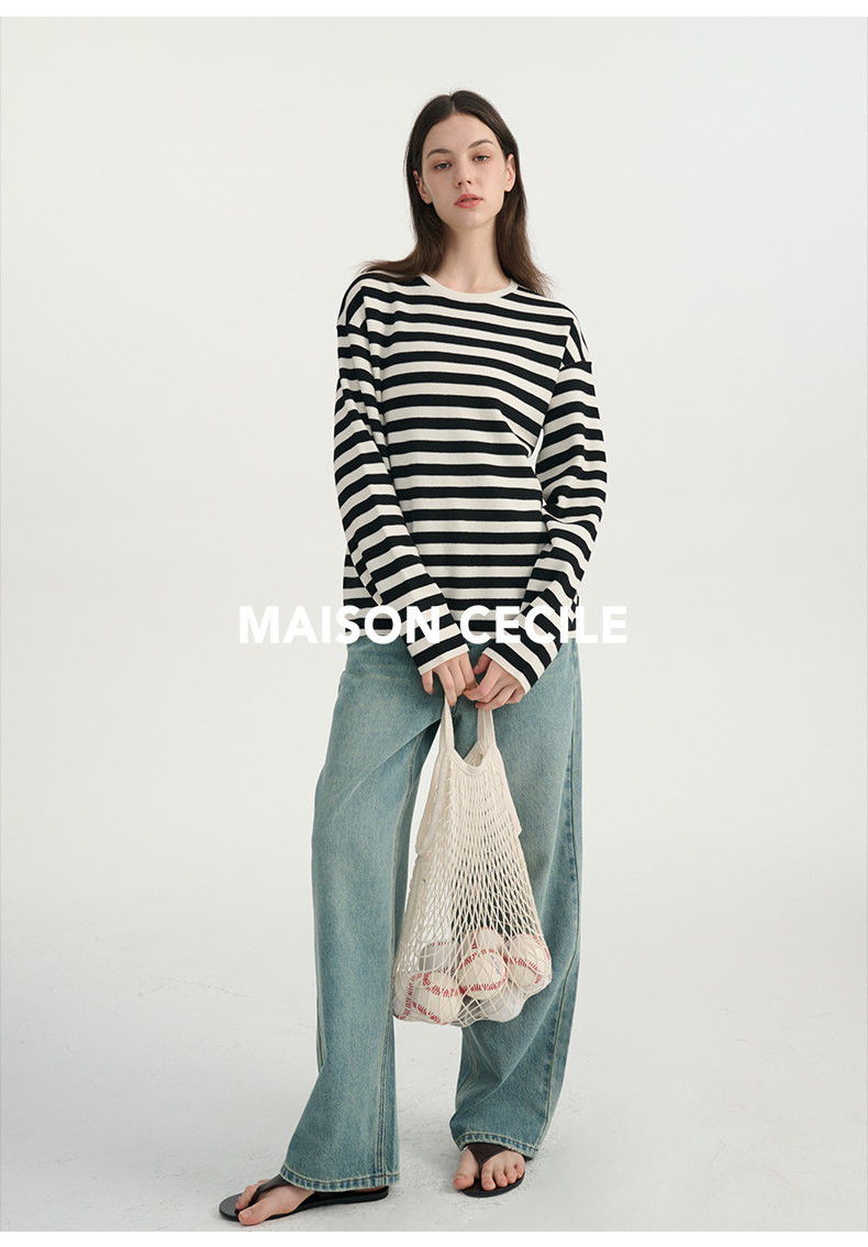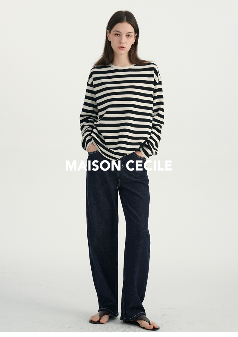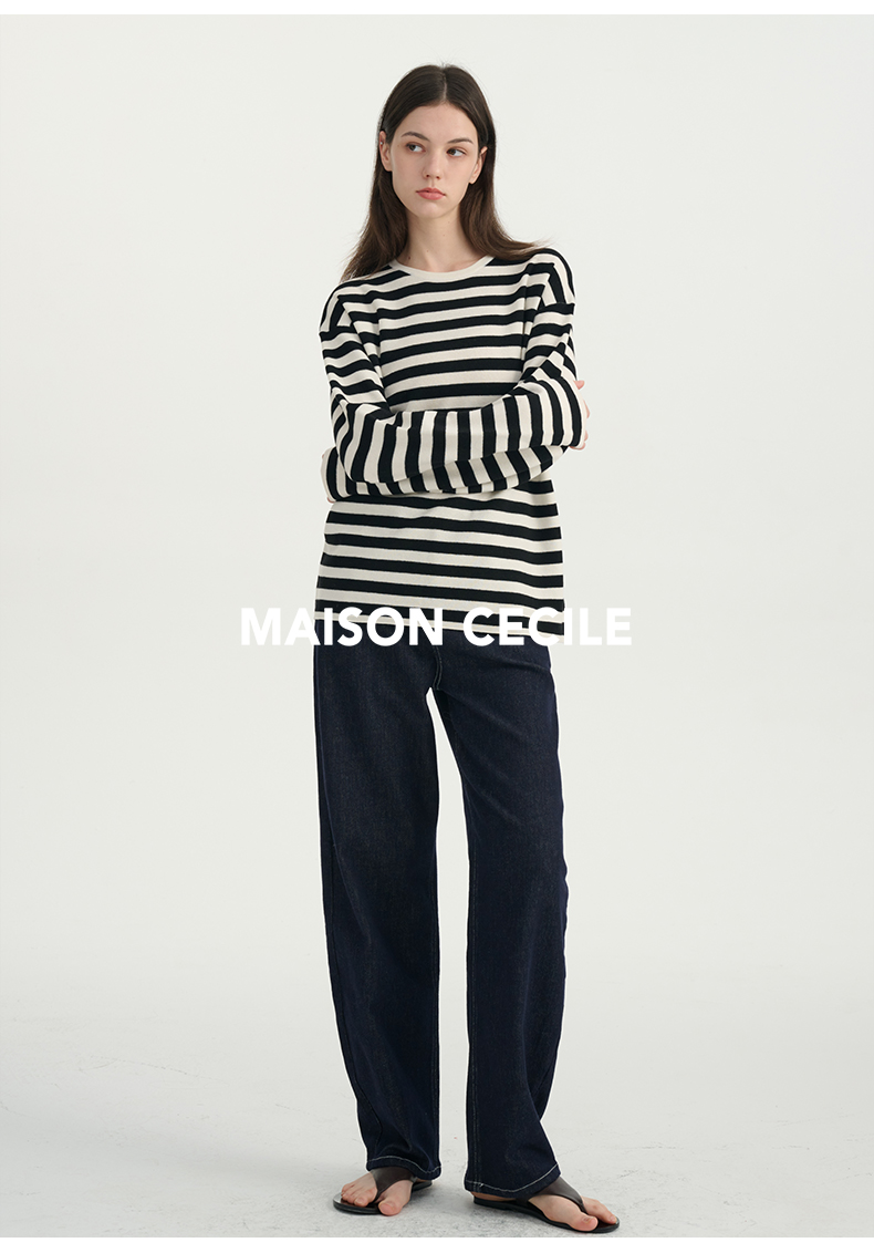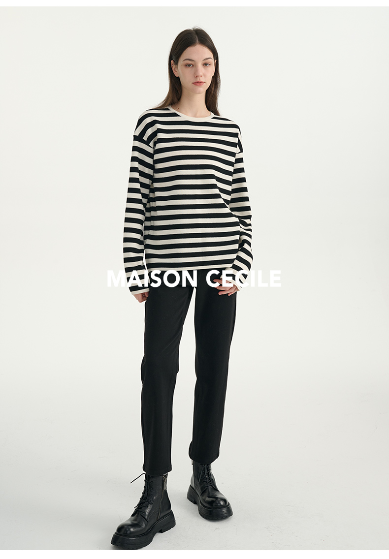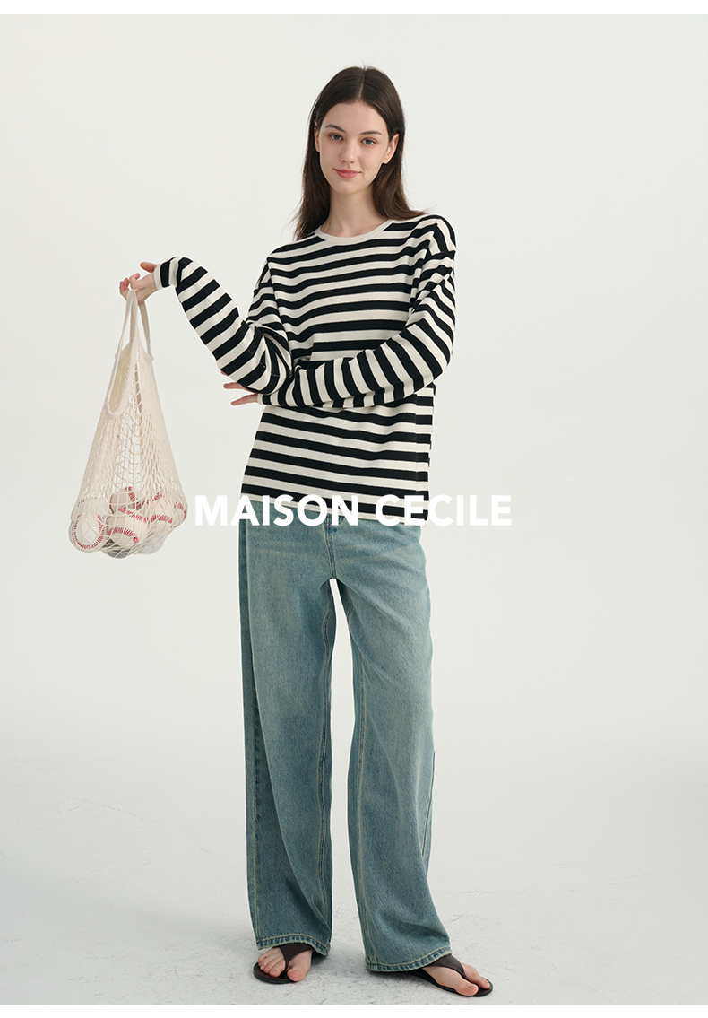 MAISON CECILE 真丝羊毛高紧实度卫衣男友风条纹针织衫