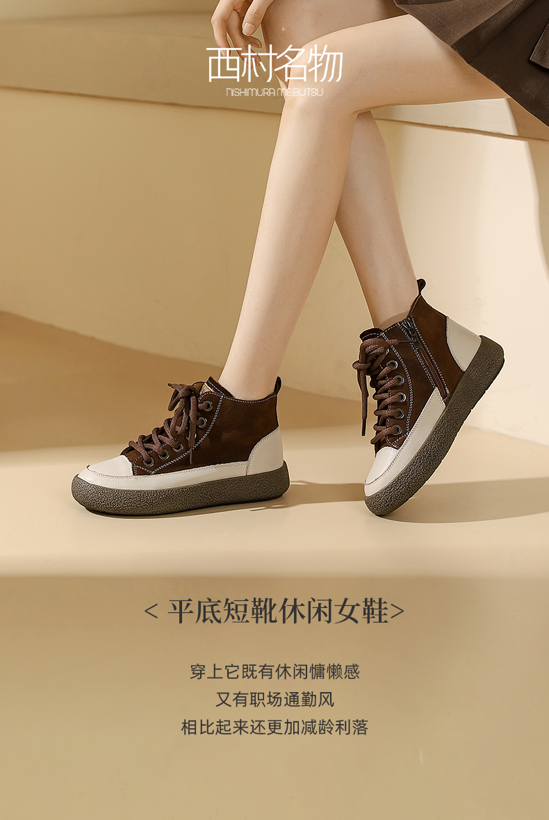 西村名品2023秋季新款平底短靴休闲女鞋英伦手工圆头侧拉链T23DS44171