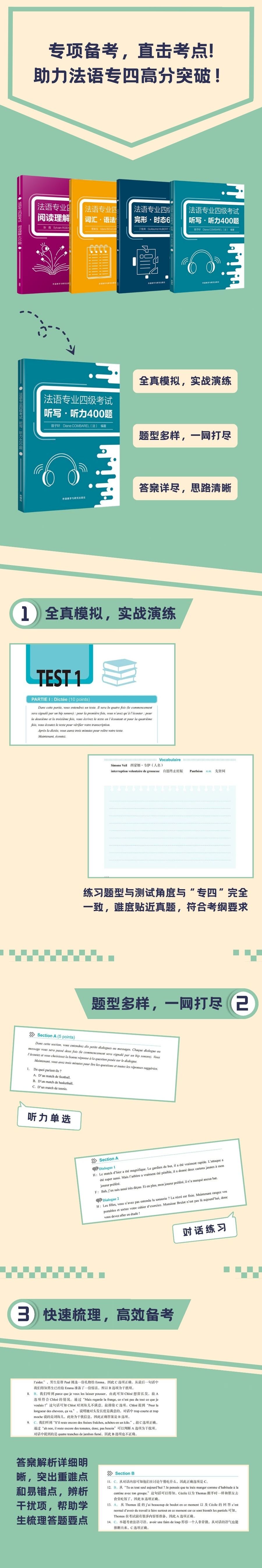 《法语专业四级考试听写•听力400题》是专为法语专业本科二年级学生备考“专四”编写的听力专项训练手册,全书分为模拟题、听力录音文字、答案与解析三部分,包括20套听写、听力全真模拟题,旨在通过大量练习帮助学生提高听写和听力能力。模拟题的题型与最新真题完全一致,包括一篇听写、十个短对话和一个长对话;听力素材贴近生活实际,使用大量法语口语中常用的地道表达,同时覆盖“专四”考生需要掌握的各种语法现象;题目设置大量干扰选项,具有区分度,能够锻炼学生抓住关键词句并全面理解对话内容的能力。答案解析部分思路清晰,内容详尽:听写的解析特别整理出需要注意的语音、语法、词汇以及拼写的难点和易错点,帮助学生落实相关考点;听力的解析侧重对话内容的梳理、干扰选项的辨析和相关词汇表达的总结,让学生在理解答题思路的同时,能够积累相关主题词汇及同义替换表达。