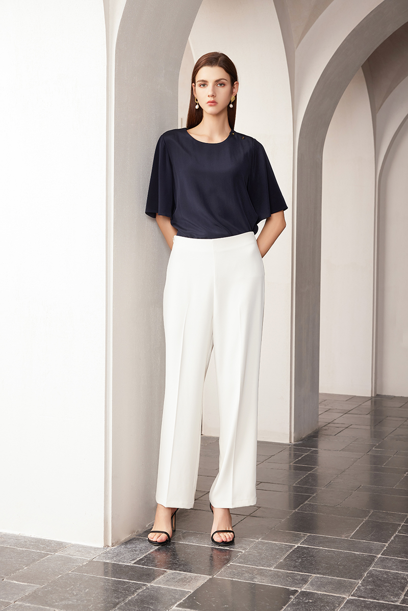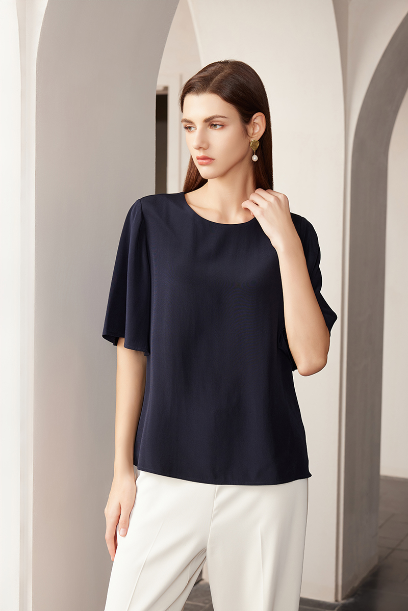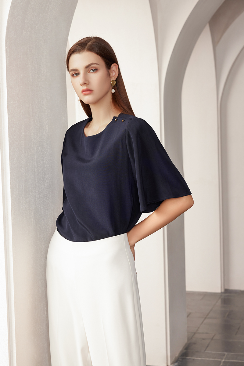 【五分袖桑蚕丝T恤】24年春夏新品女士上衣时尚纽扣装饰圆领直筒上衣