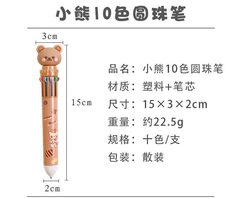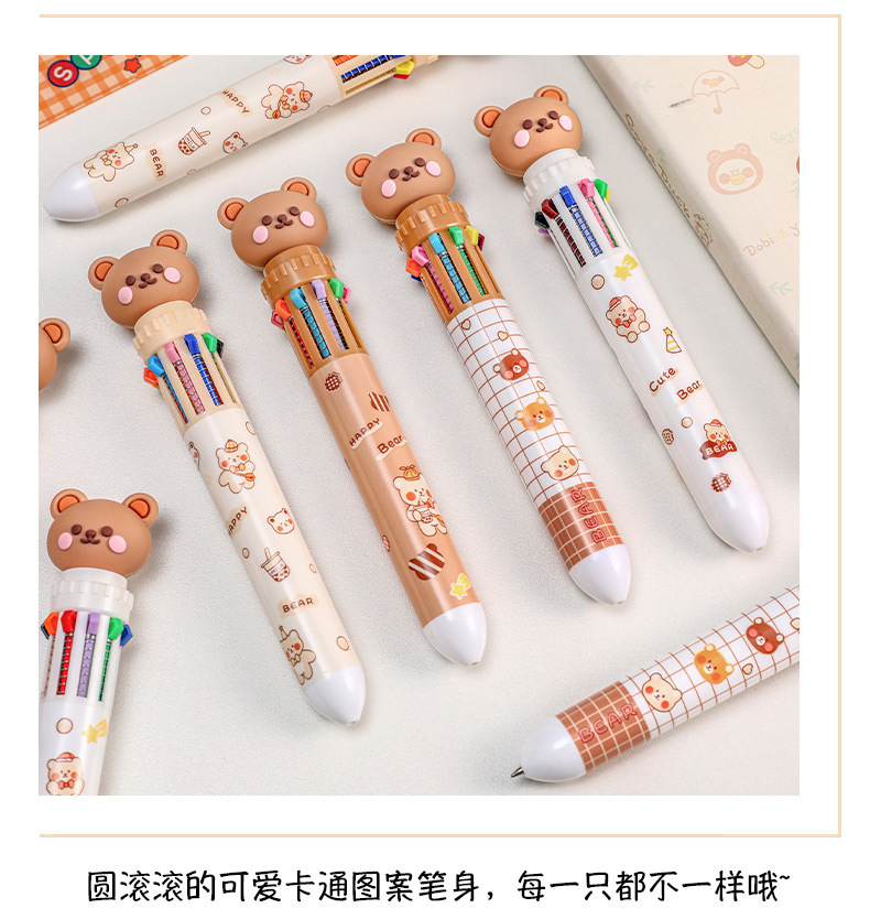 「拍1发2!9.9到手两支」奶油小熊十色圆珠笔 卡通可爱按压式多色彩色笔学生10色按动手账笔
