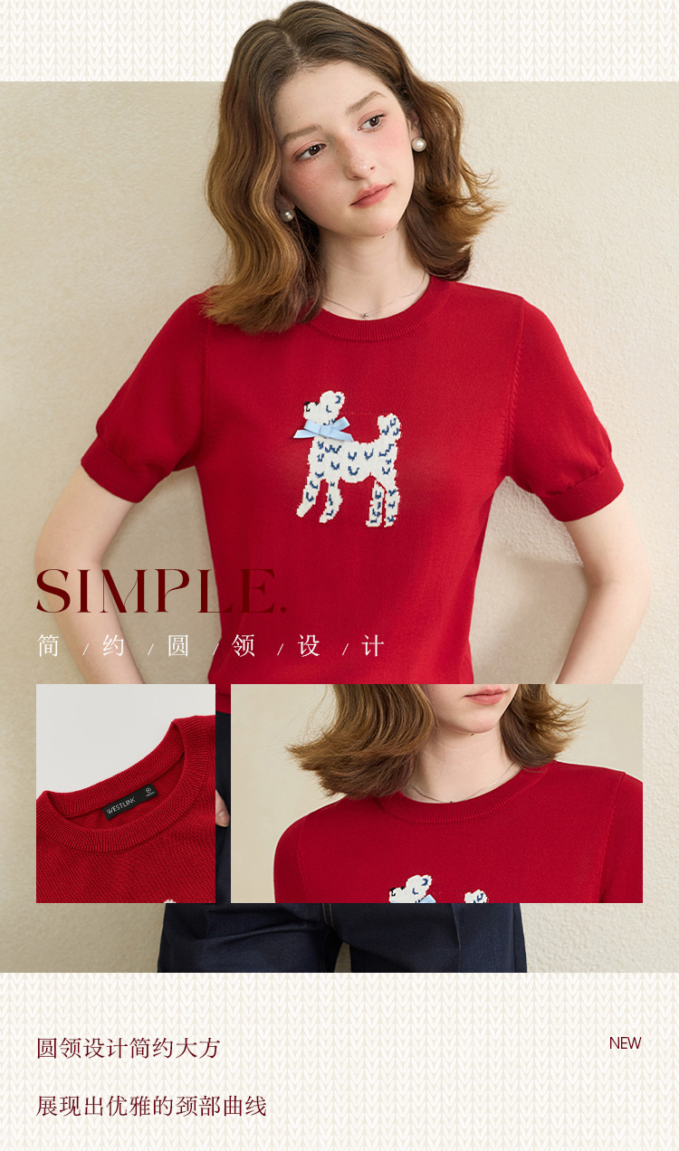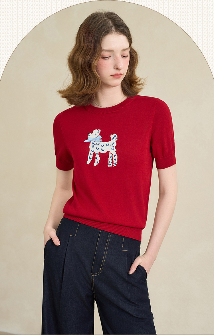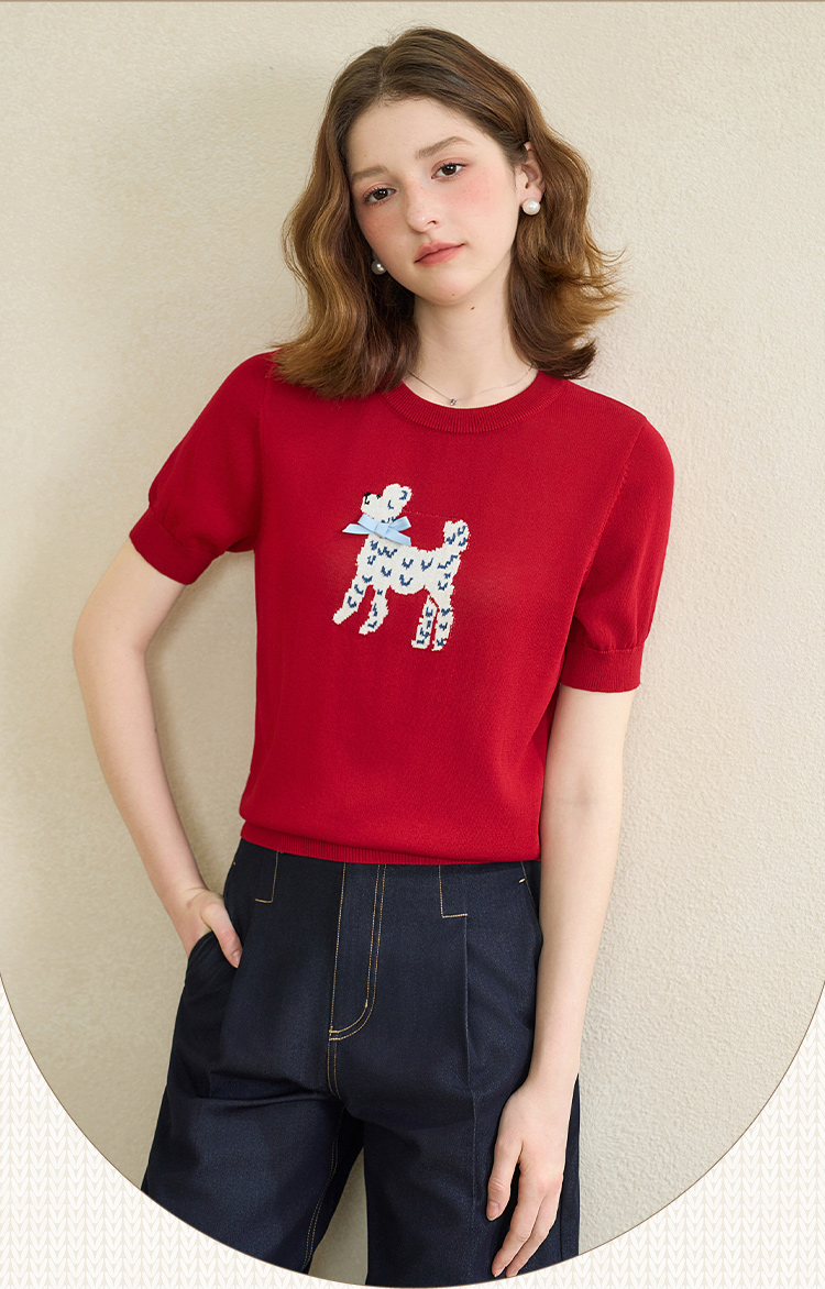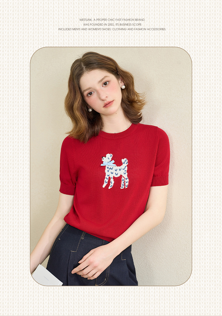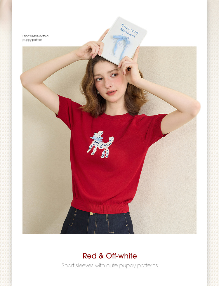 【限时秒杀】甜美可爱小狗图案短款针织衫女夏季简约百搭短袖上衣V0051035
