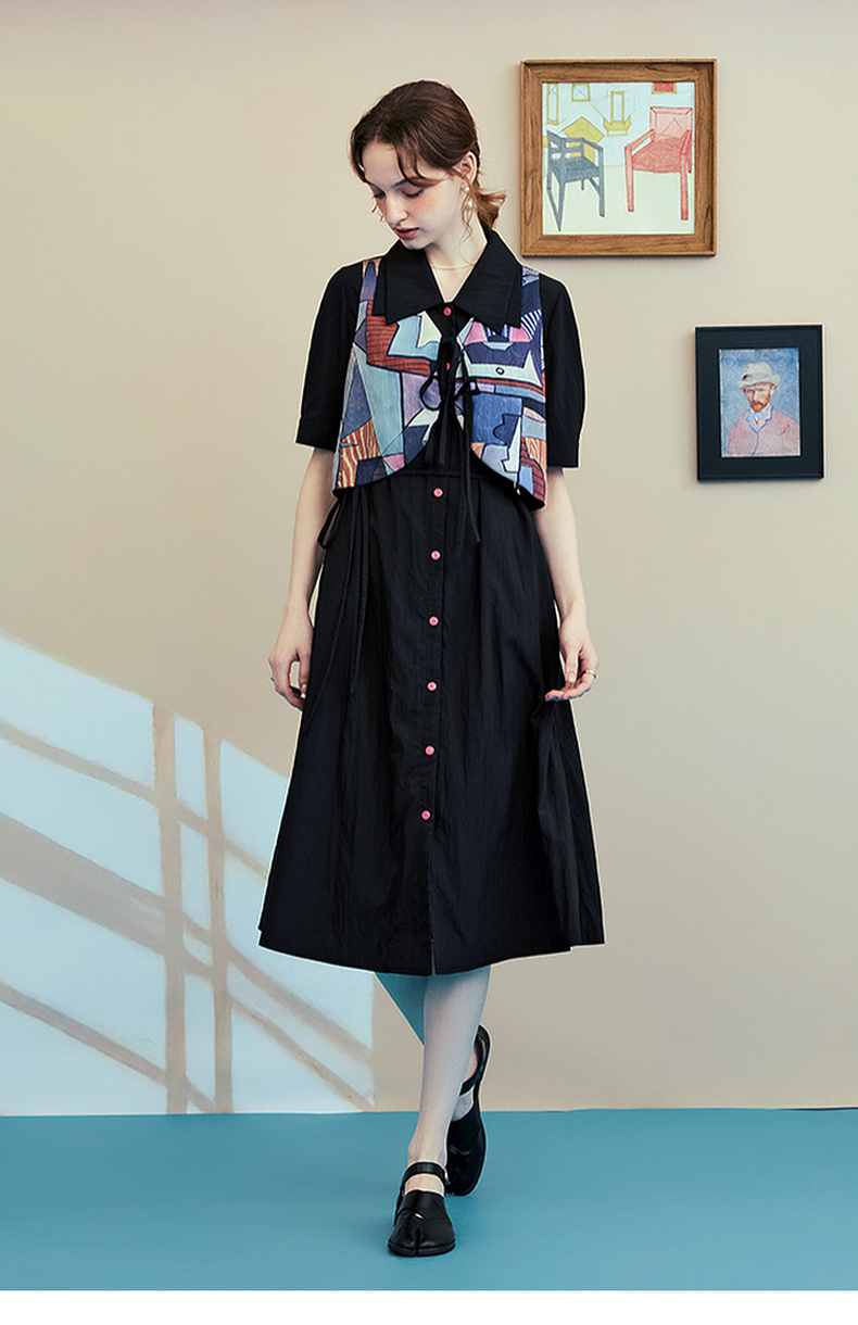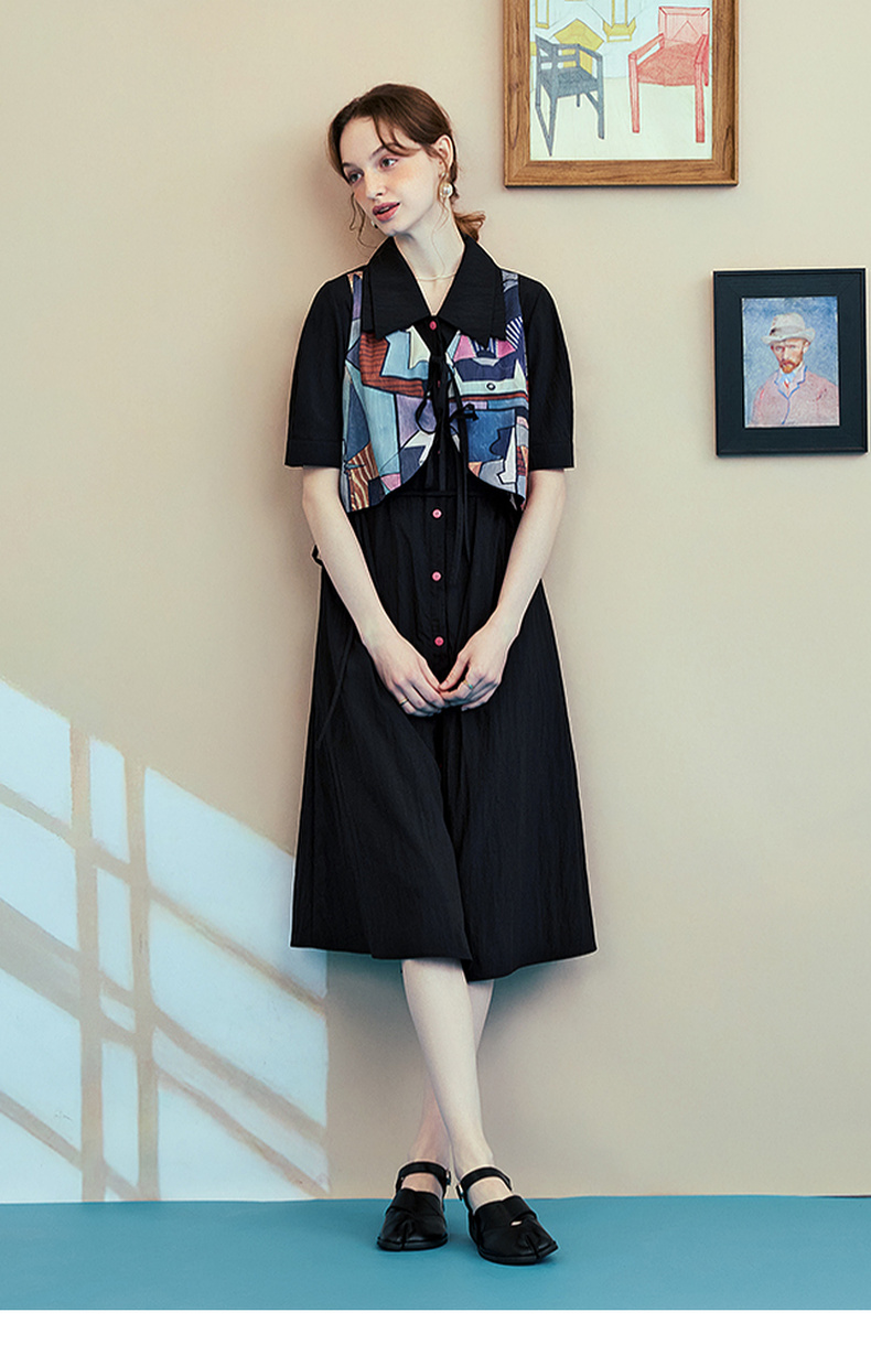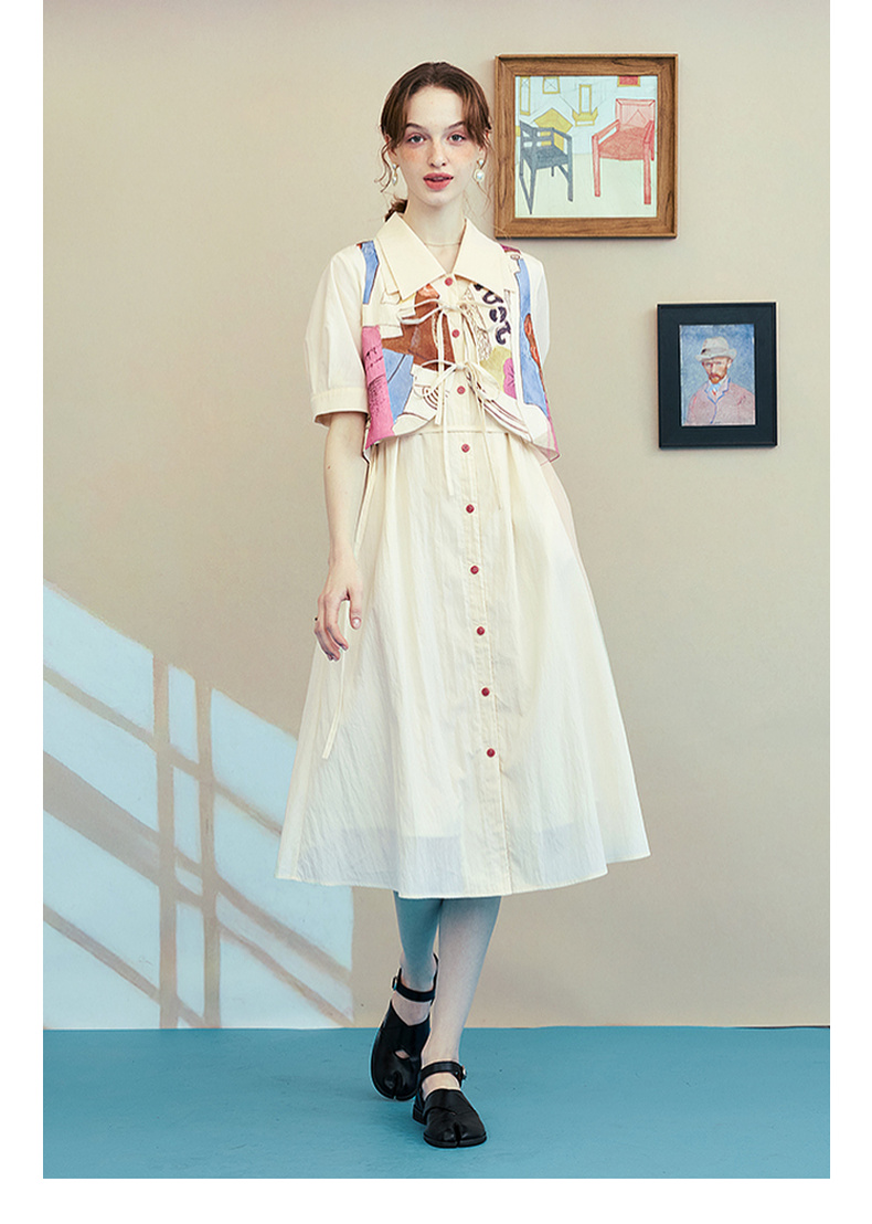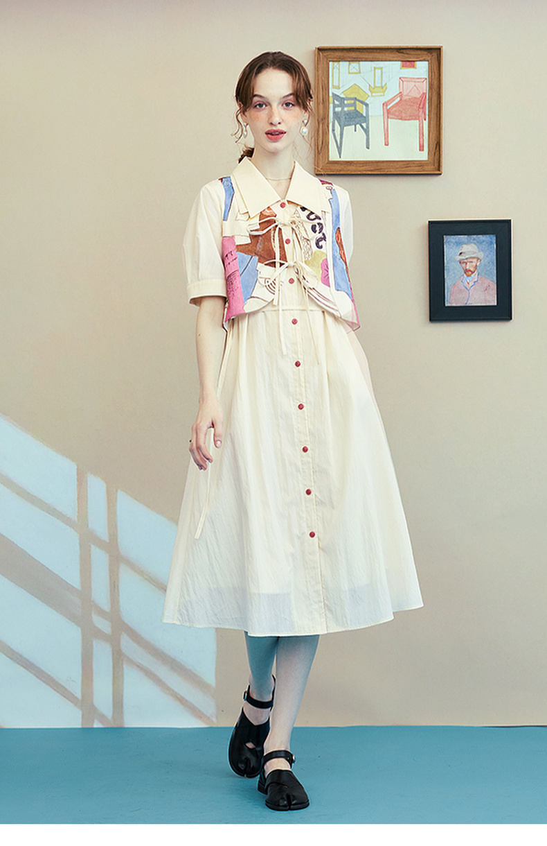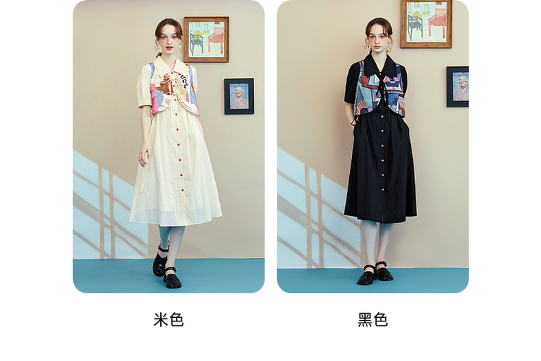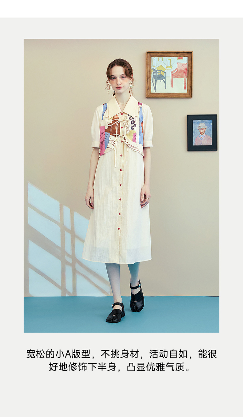 两三事 晨昏画意 2025夏季新款复古印花布拼接假两件连衣裙长裙