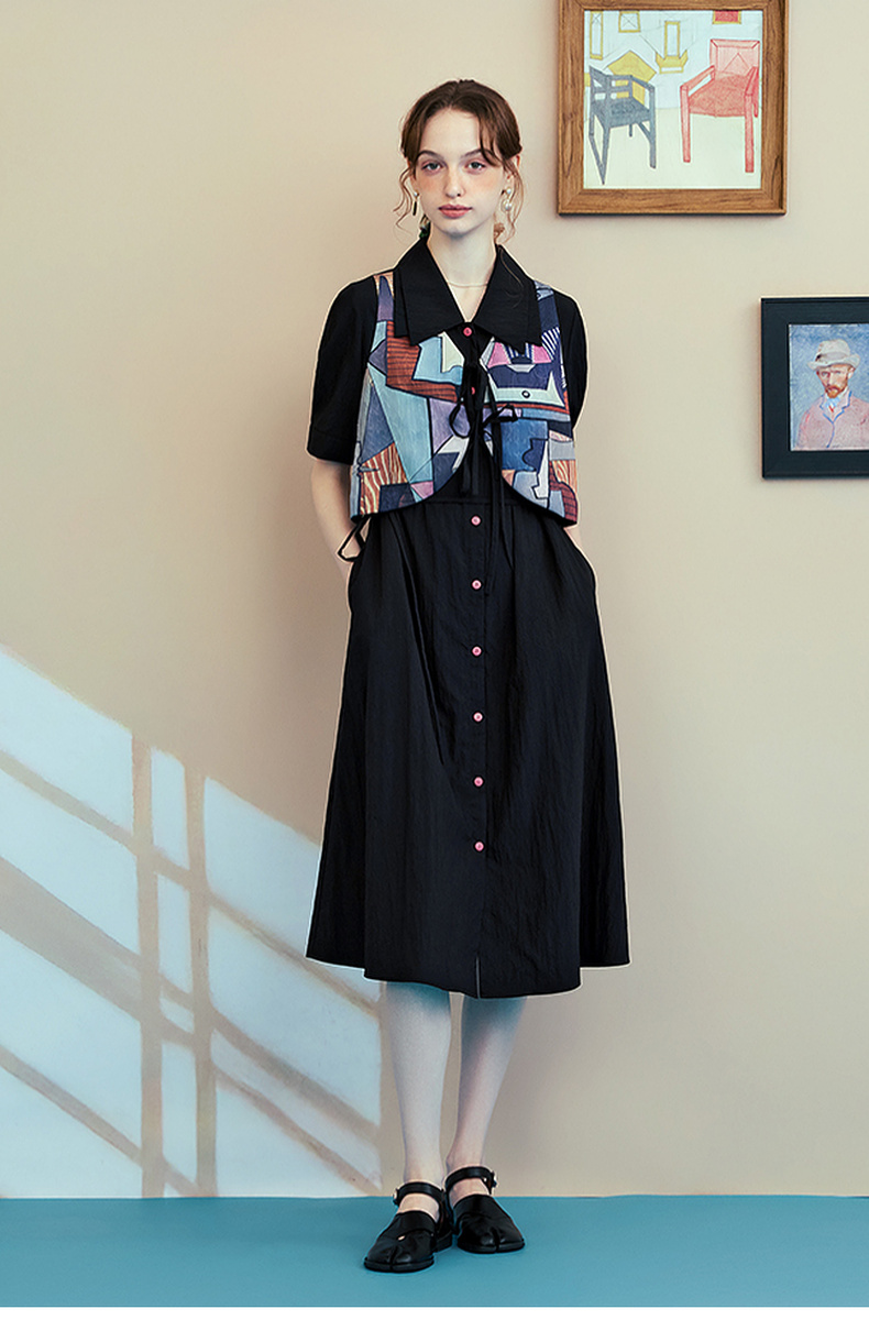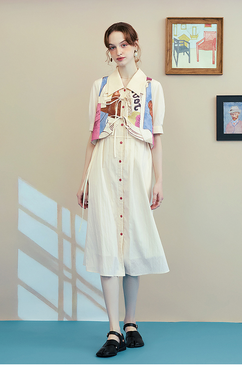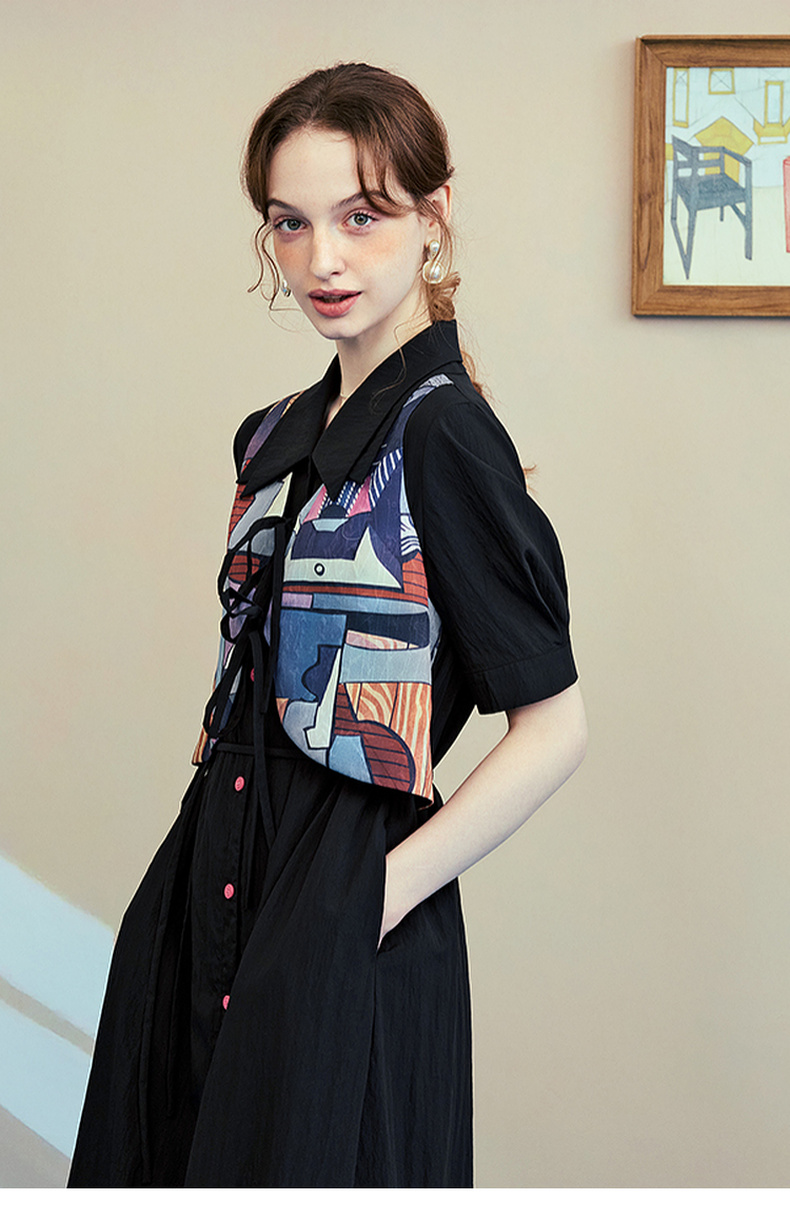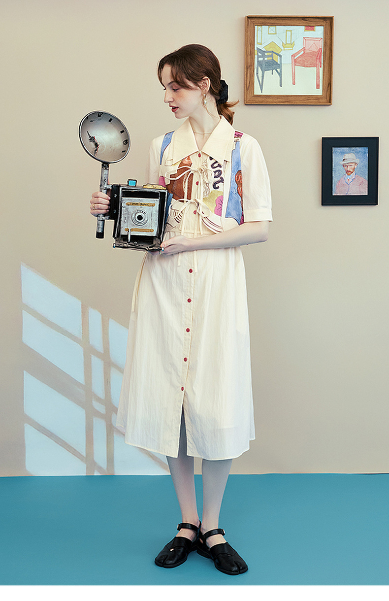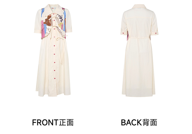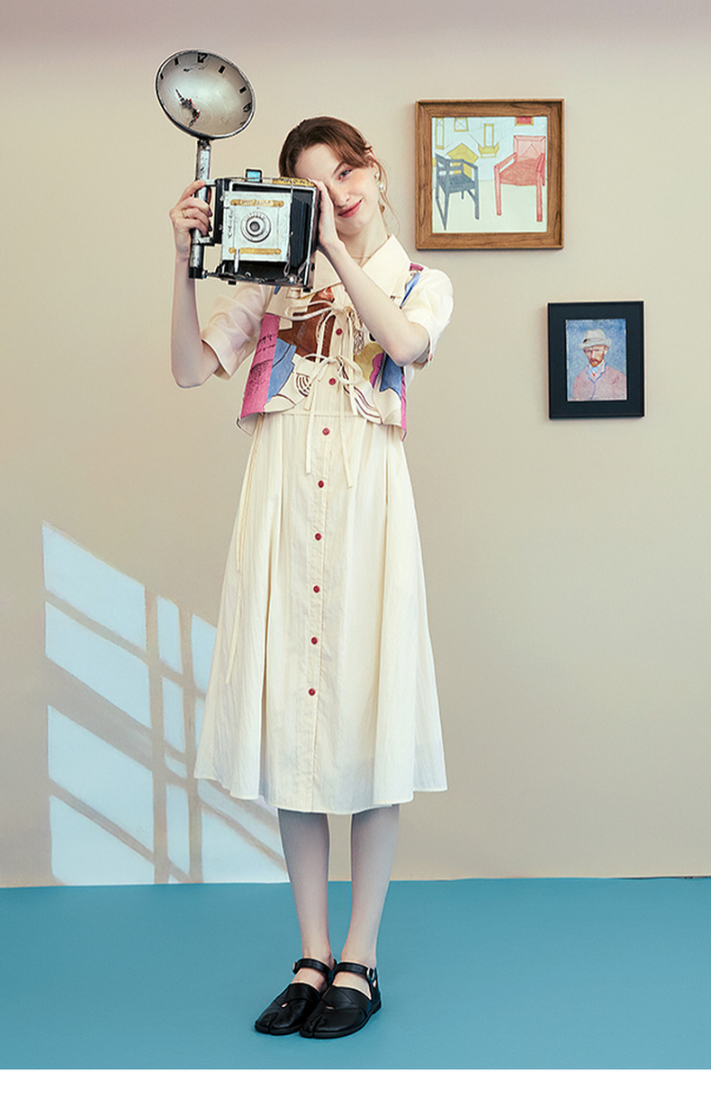 两三事 晨昏画意 2025夏季新款复古印花布拼接假两件连衣裙长裙