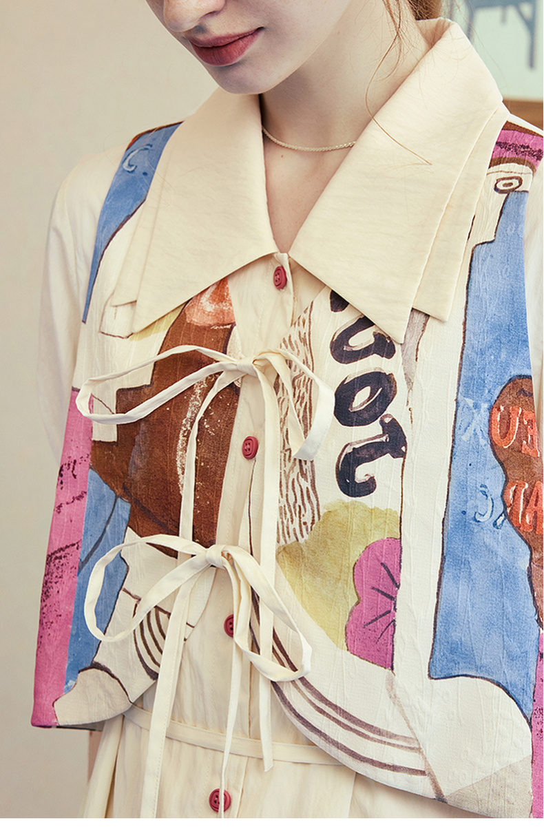 【暖冬内购】两三事梵高文艺莱茵河畔2025秋冬款印花拼接拼色海军领毛呢外套女
