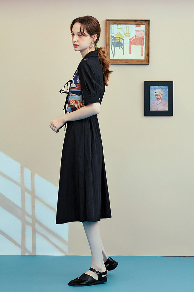 两三事梵高文艺 弦外智音 2025夏季新款彩绳绑带领印花短袖t恤女