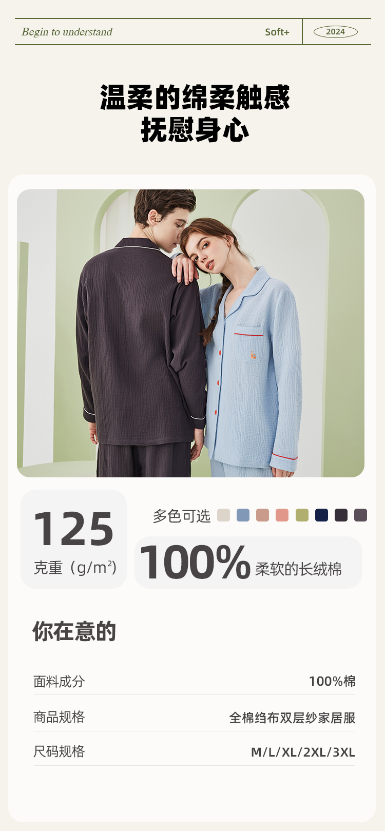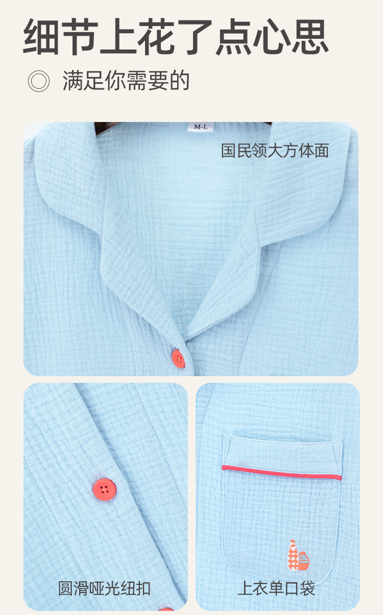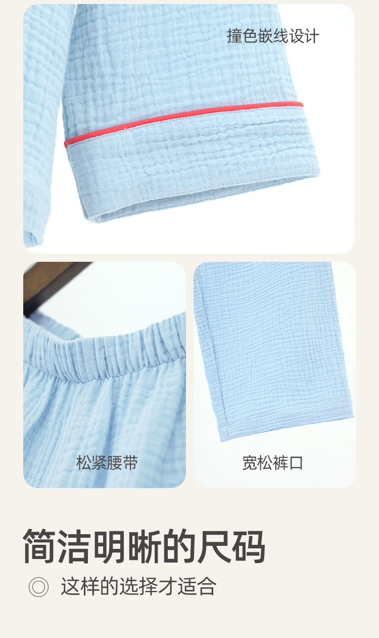 【A类婴儿级面料 全棉双层绉纱情侣款 家居服睡衣】100%新疆长绒棉 非常的软哦!穿上身像羽毛般轻柔,高透气高吸湿,这个春夏就穿他!
