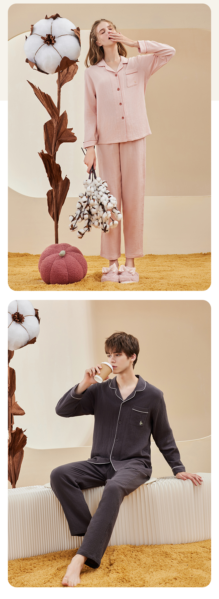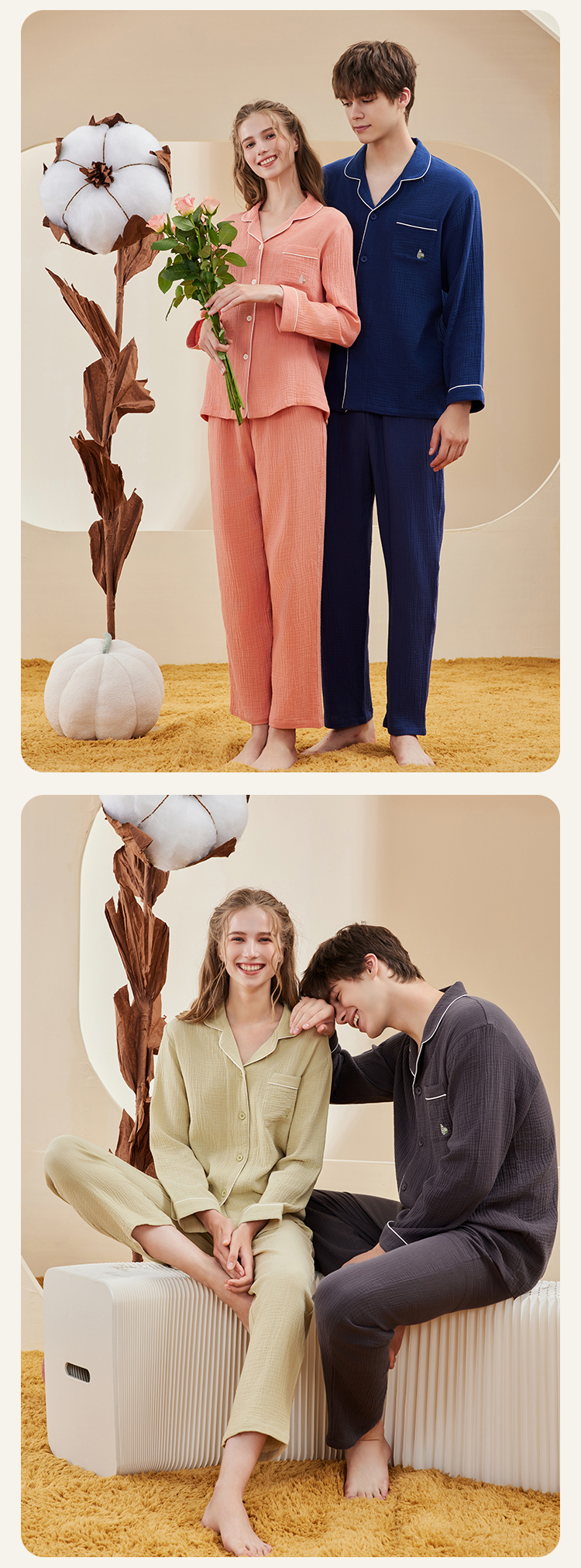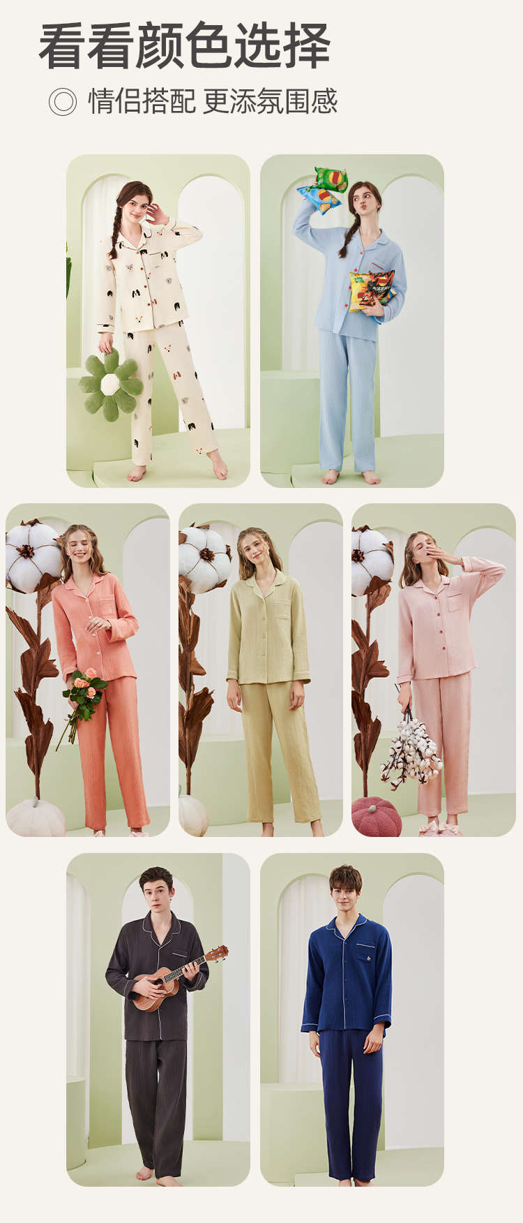 【A类婴儿级面料 全棉双层绉纱情侣款 家居服睡衣】100%新疆长绒棉 非常的软哦!穿上身像羽毛般轻柔,高透气高吸湿,这个春夏就穿他!
