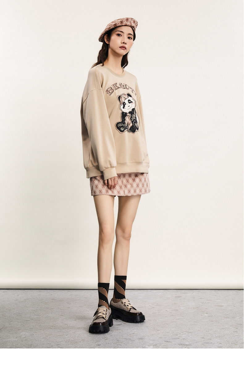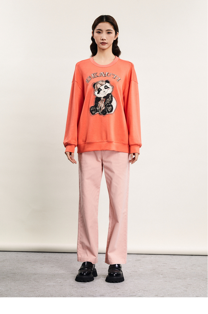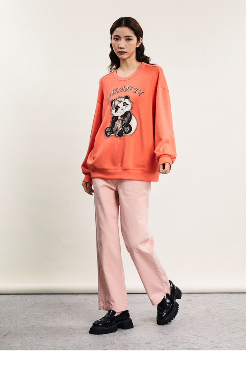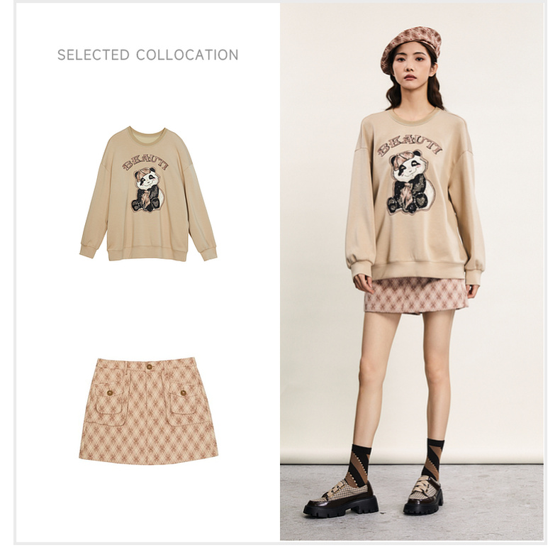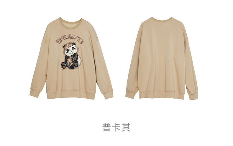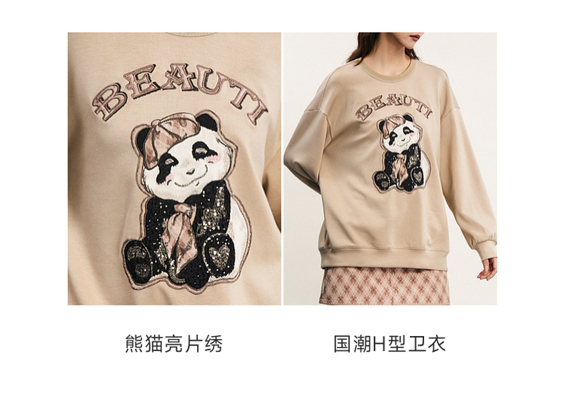 谜底中长款卫衣女2024春新款学院风大熊猫绣花圆领上衣241MV0074