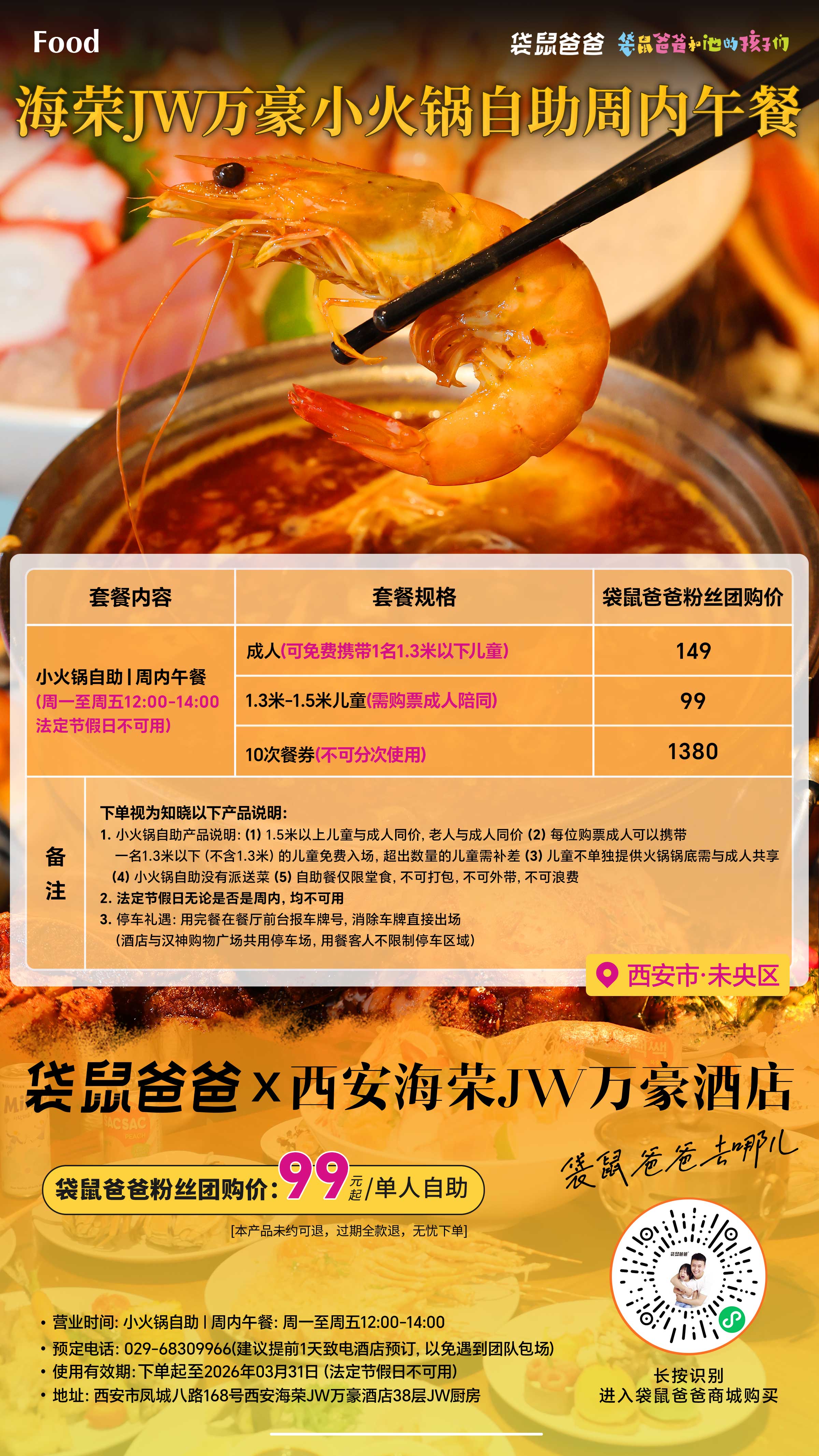 【袋鼠爸爸去哪儿 |西安海荣JW万豪酒店--小火锅自助周内午餐】位于酒店38层JW厨房,可俯瞰城市美景,视野开阔,食材种类优质丰富,多品类畅食,开启冬日沉浸式火锅用餐体验~