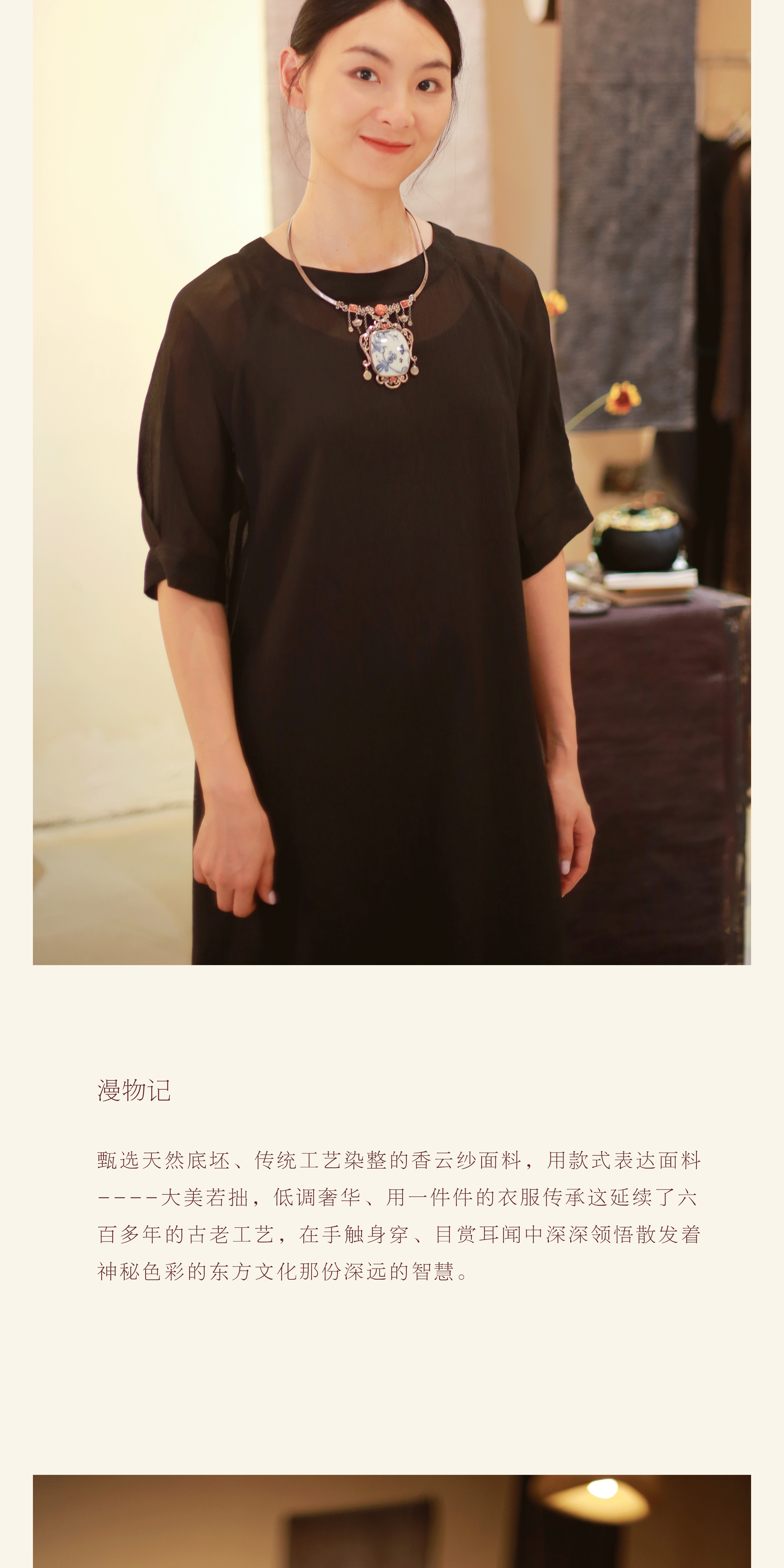漫物记顺行皱香云纱圆领中袖连衣裙XYS-W142