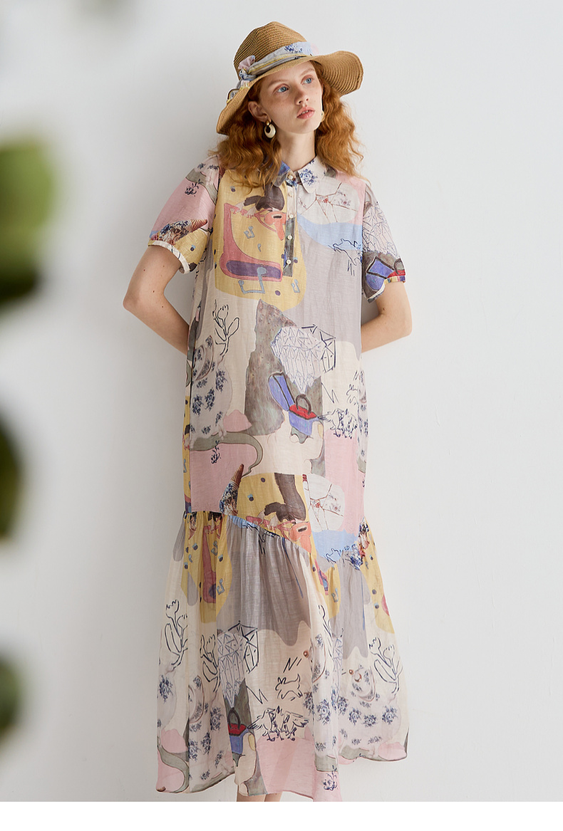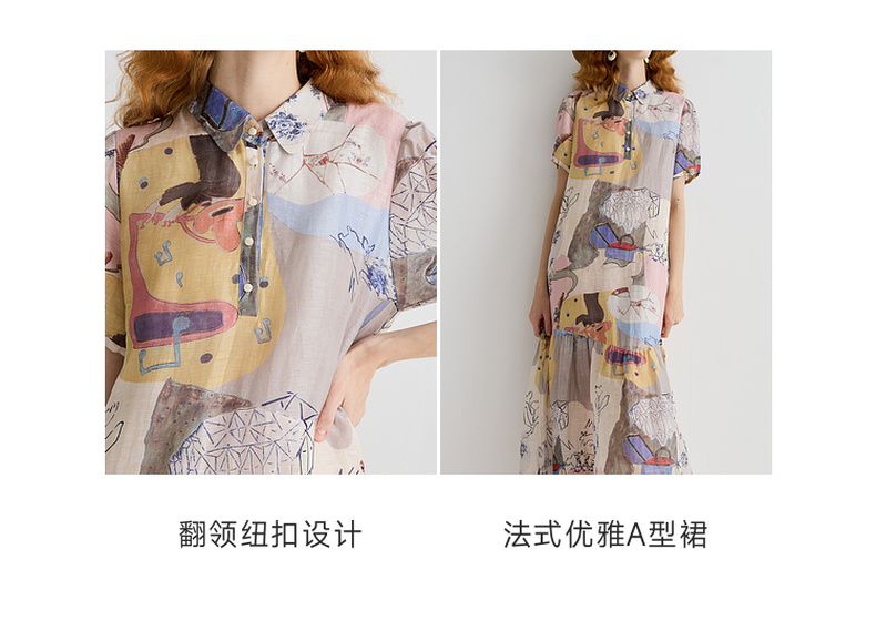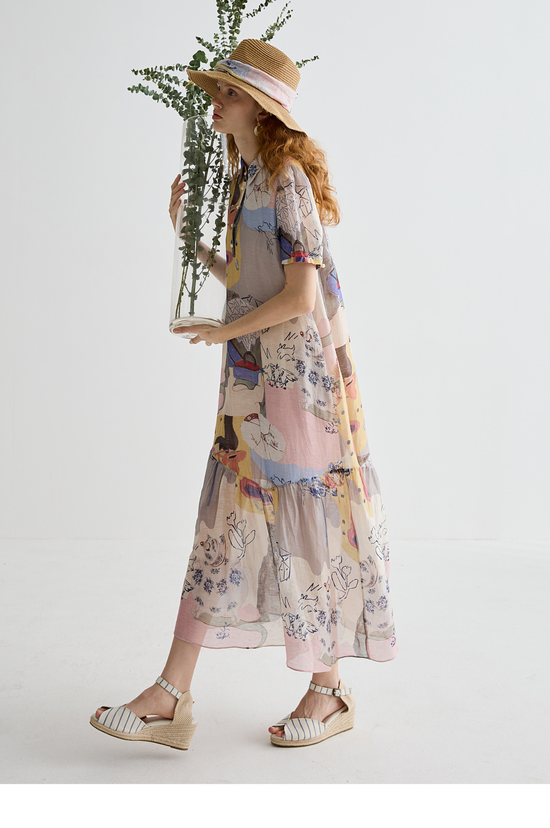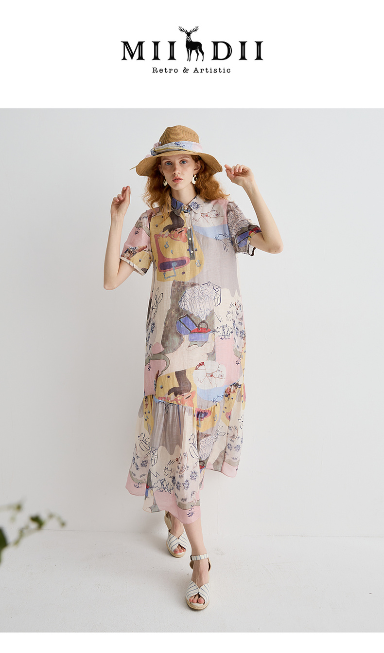 谜底连衣裙短袖女2025夏新品复古风度假印花宽松A型长裙252ML0697