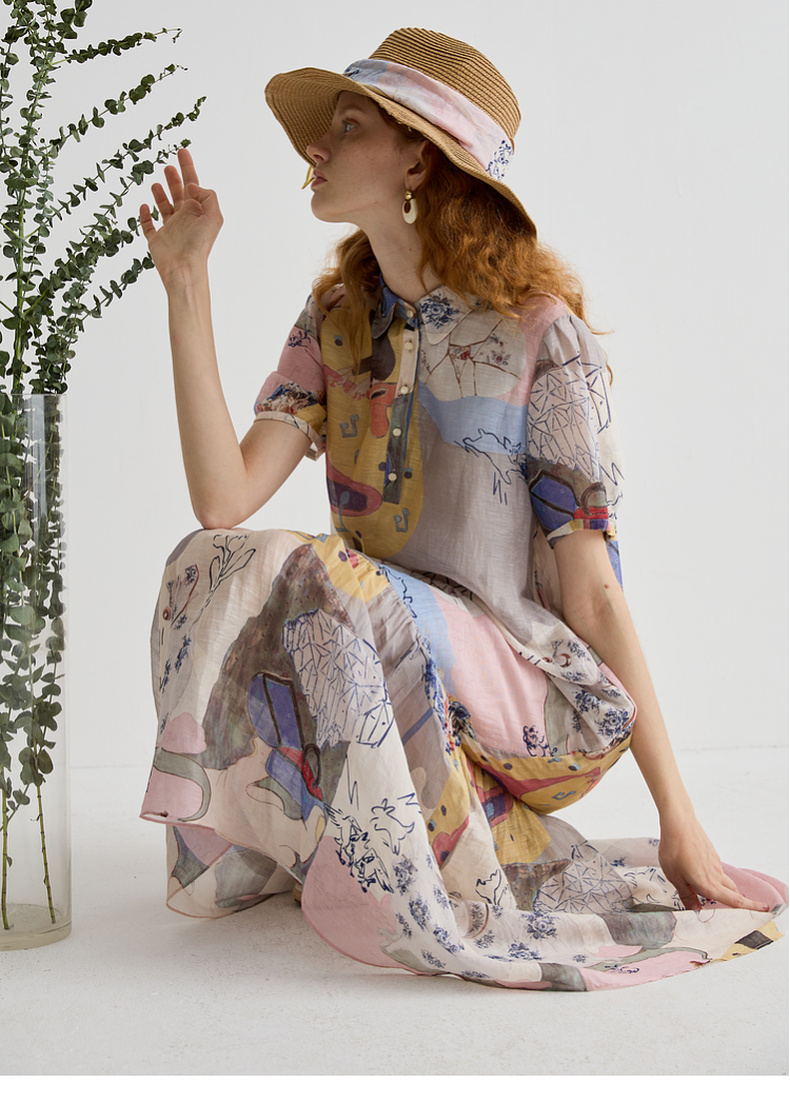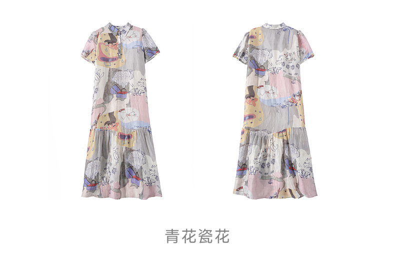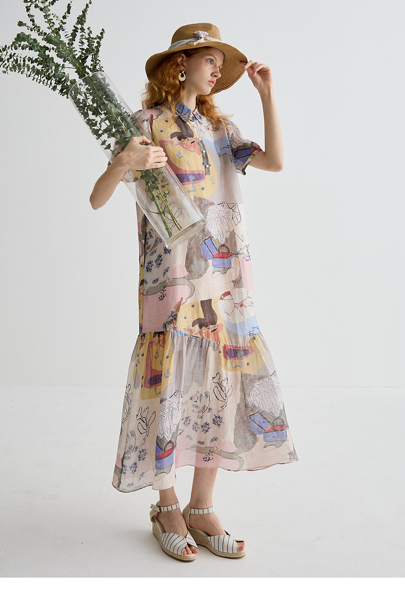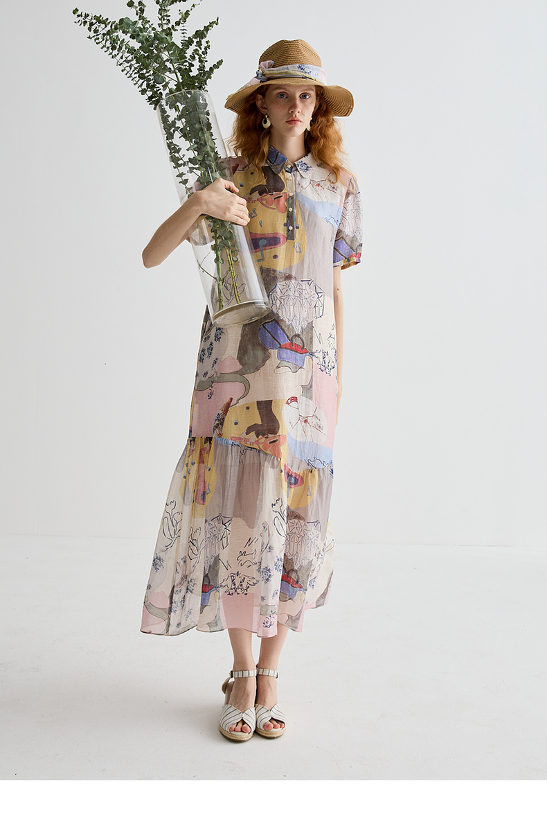 谜底连衣裙短袖女2025夏新品复古风度假印花宽松A型长裙252ML0697