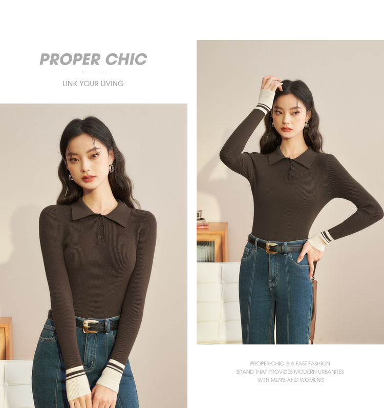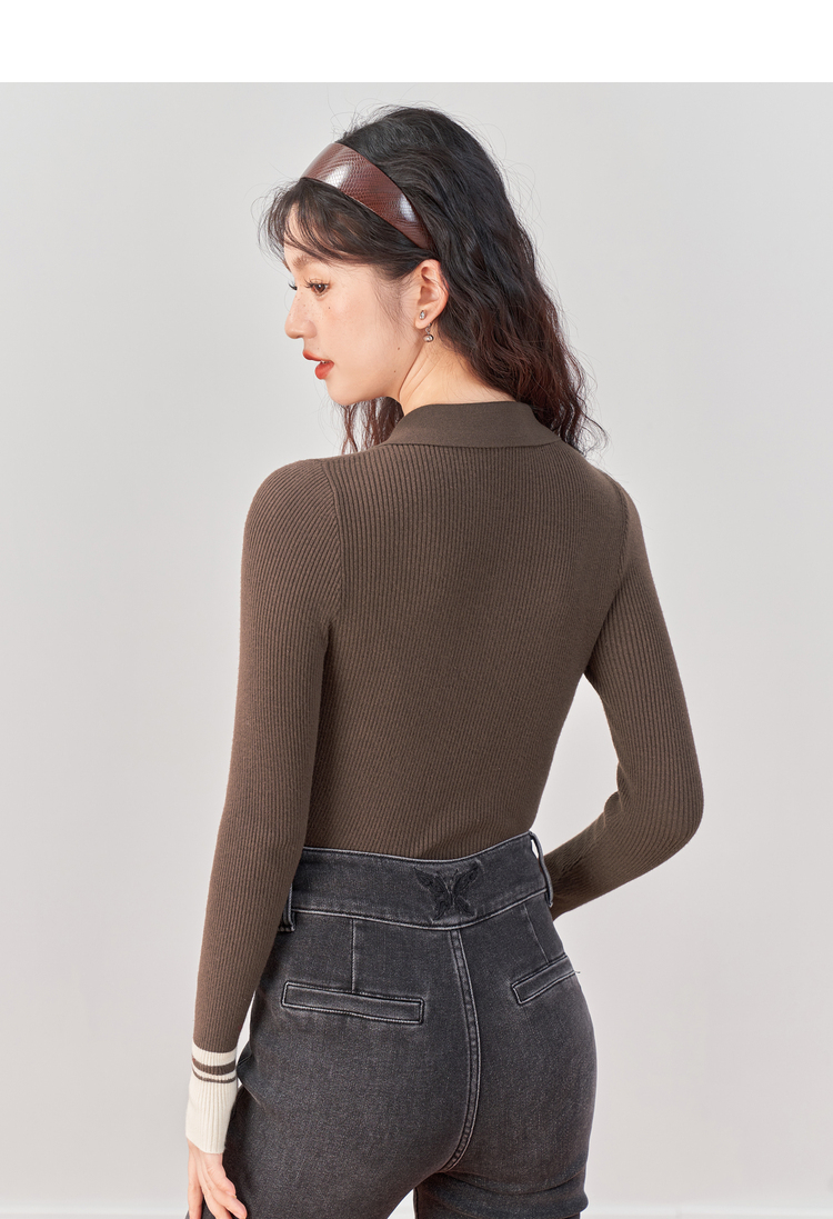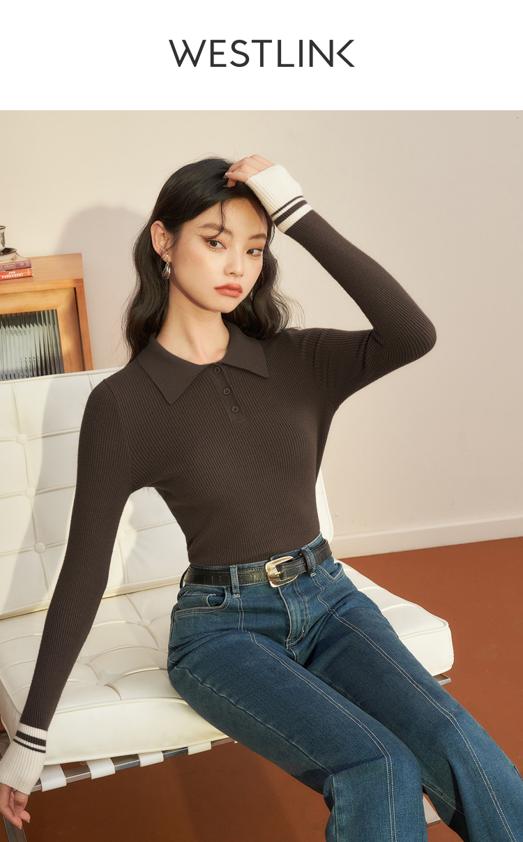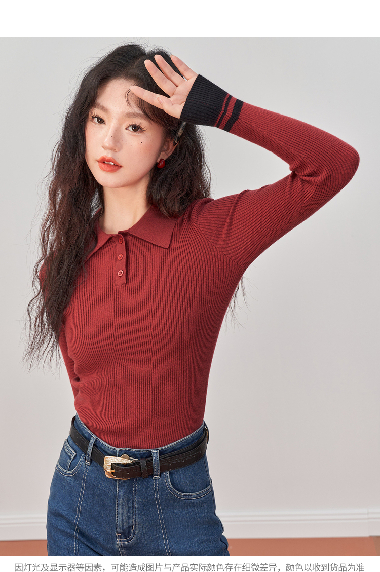 西遇POLO领针织衫女新款设计感小众红色短款毛衣上衣D1921591