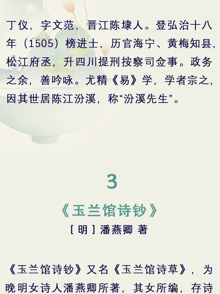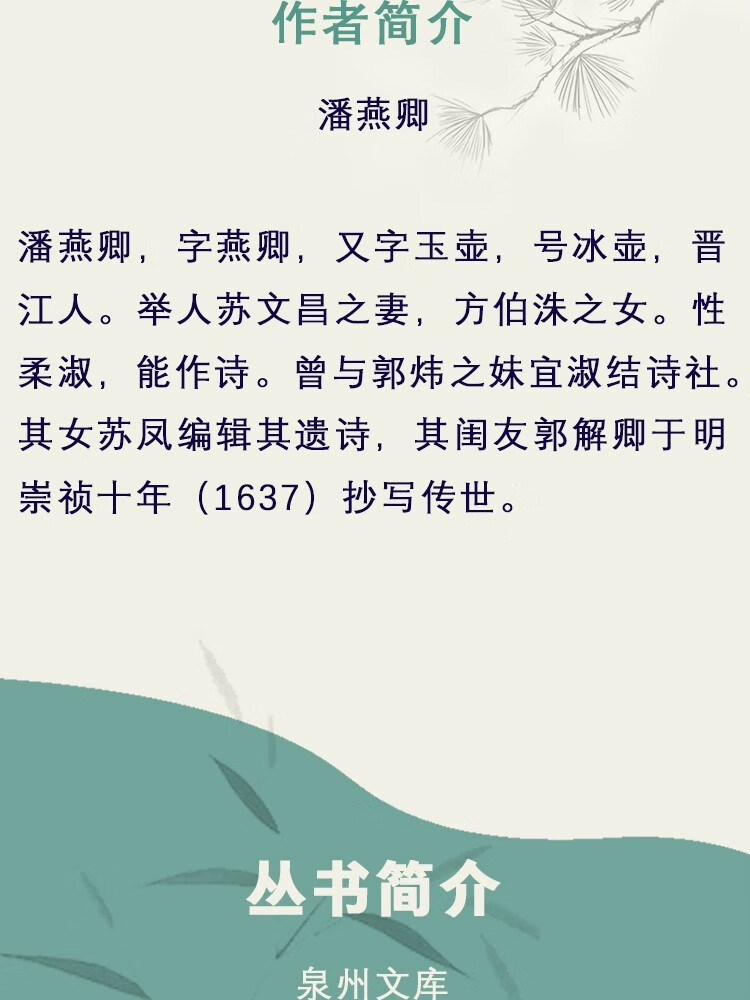 潘燕卿,字燕卿,又字玉壶,号冰壶,晋江人。举人苏文昌之妻,方伯洙之女。性柔淑,能作诗。曾与郭炜之妹宜淑结诗社。其女苏凤编辑其遗诗,其闺友郭解卿于明崇祯十年(1637)抄写传世。