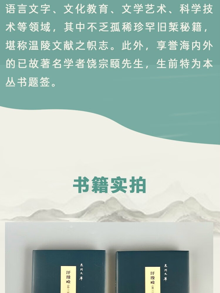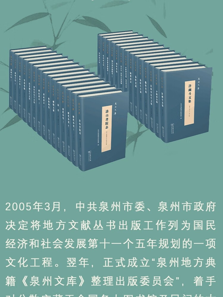 《泉州文库》始唐迄清,原著点校,收录标准着眼于学术性、科学性、文学性、地域性、原创性、权威性,具有全国重要影响和著名历史人物的代表作优先。所录著作涵盖泉州各县(市、区),包括金门县及历史上泉州府属同安县,曾在泉州任职、寄寓、活动过的非泉籍人氏的作品,则取其内容与泉州密切相关的专门著作。文库采用繁体字横排印刷,内容涉及政治、经济、历史、地理、哲学、宗教、军事、语言文字、文化教育、文学艺术、科学技术等领域,其中不乏孤稀珍罕旧椠秘籍,堪称温陵文献之帜志。