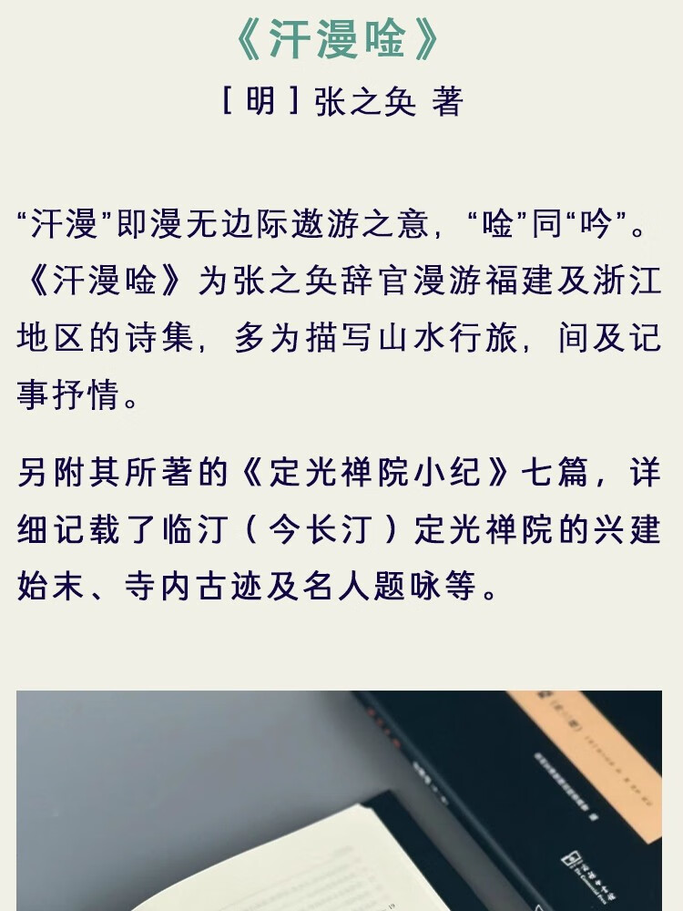 《汗漫唫》,明张之奂,陈炜点校著。“汗漫”即漫无边际遨游之意,“唫”同“吟”。凡八集,初集作于福建延平、建宁二府,二集作于漳州,三集作于北游延平、建宁和浙江时,四集作于嘉兴平湖,五集作于湖州,六集作于杭州及从浙回闽图中,七集作于游历福建兴化、福州、福宁、建宁等地,八集作于长汀。多为描写山水行旅,间及记事抒情,与地方诗人多有酬酢。另附其所著的《定光禅院小纪》七篇,详细记载了临汀(今长汀)定光禅院的兴建始末、寺内古迹及名人题咏等。《归囊遗稿》,明丁仪著,丁金潮点校。是书初刊于明嘉靖间,清光绪二十二年(1896)重刊。丁仪诗作古雅清正,沉郁大气,卓然名家。今点校再刊,相信对于弘扬诗教,啓迪后学,尤其对研究泉州少数民族文化、历史应多有裨益。《玉兰馆诗钞》,又名《玉兰馆诗草》,存诗词一百二十多首,明潘燕卿著,陈忠义、林兴中点校。该书由潘氏之女苏凤编辑,闺友郭解卿(宜淑)校阅并作序,于明崇祯十年(1637)抄写传世。内容多为吟风弄月,闺友唱和、抒怀寄意等,诗风温柔敦厚,清新自然,语言晓畅,情意深挚。
