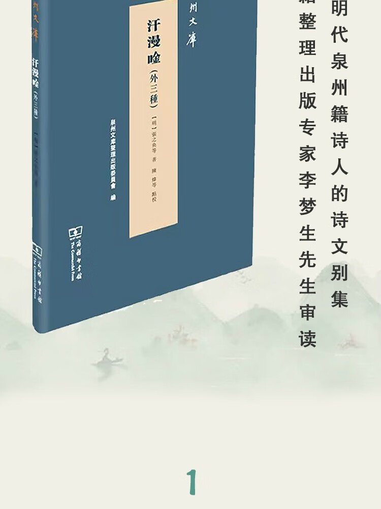 本书主要收录了明代泉州籍诗人的诗文别集。张之奂所著《汗漫唫》为其辞官漫游福建及浙江地区的诗集,多为描写山水行旅,间及记事抒情。又附《定光禅院小纪》,为第一部关于临汀(今长汀)定光禅院的寺志。丁仪所著《归囊遗稿》不分卷,曾先后两次刊刻传世。丁仪诗作古雅清正,沉郁大气,卓然名家,对研究泉州少数民族历史、文化应多有裨益。而《玉兰馆诗钞》为晚明女诗人潘燕卿所著,其女所编,内容多为吟风弄月,闺友唱和、抒怀寄意等。著名古籍整理出版专家李梦生先生做了审读。