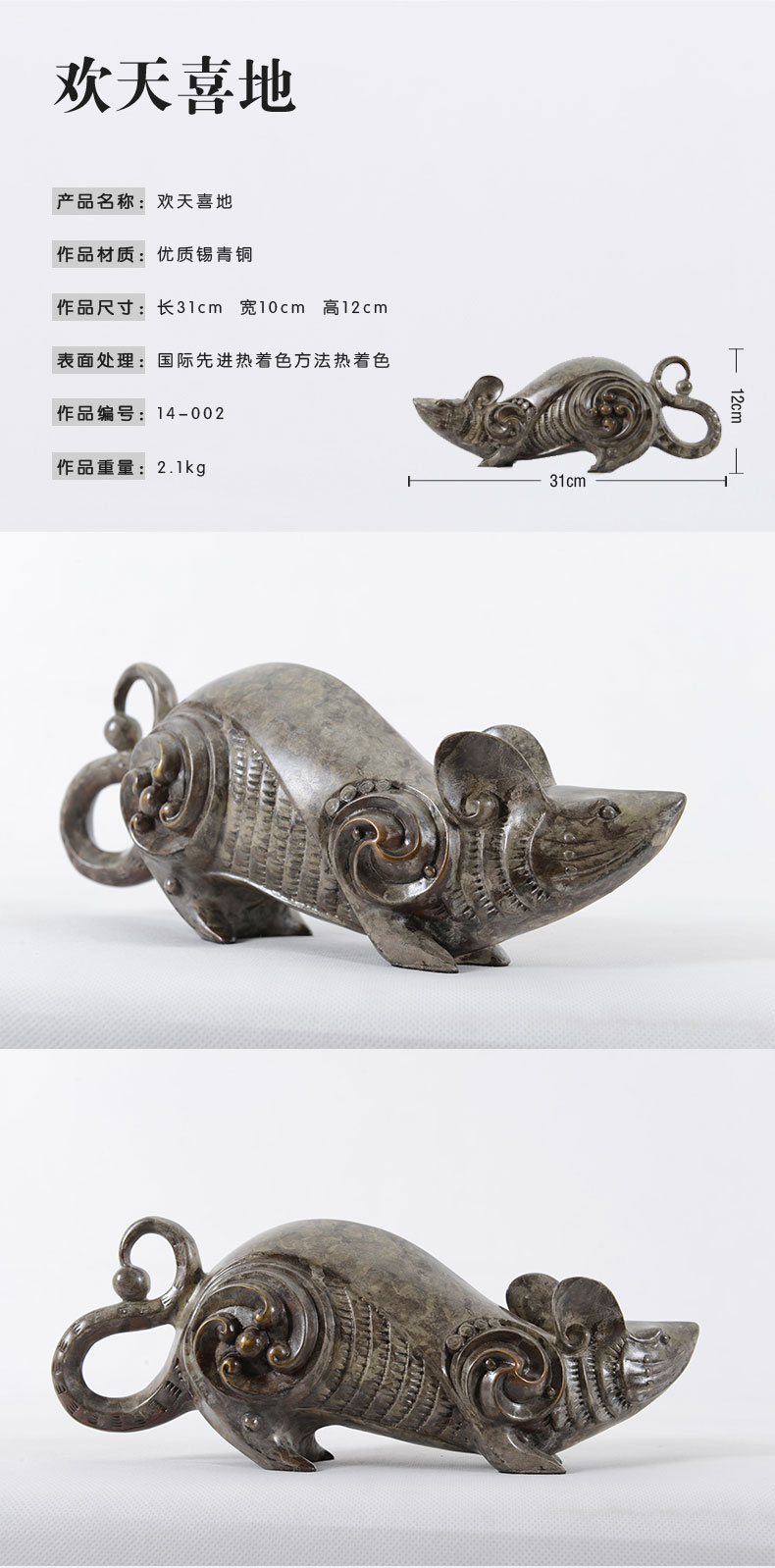 宇达青铜全铜鼠摆件《欢天喜地》鼠年 家居 艺术装饰摆件 高12cm