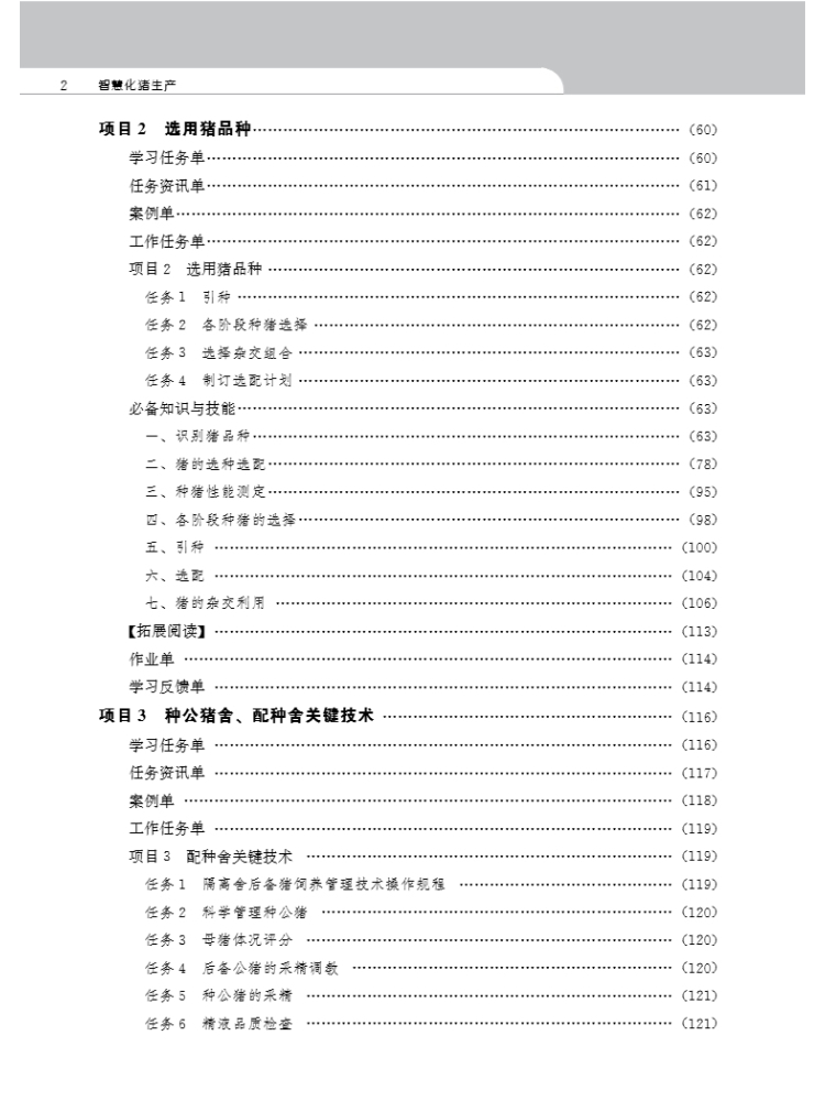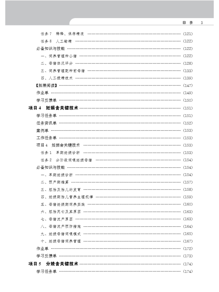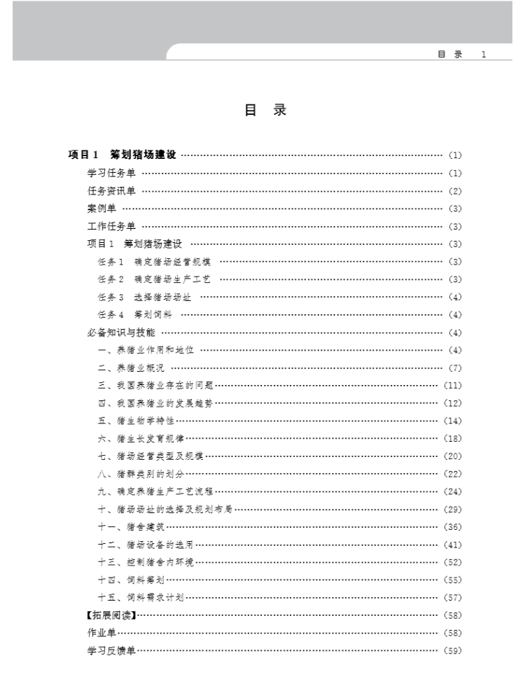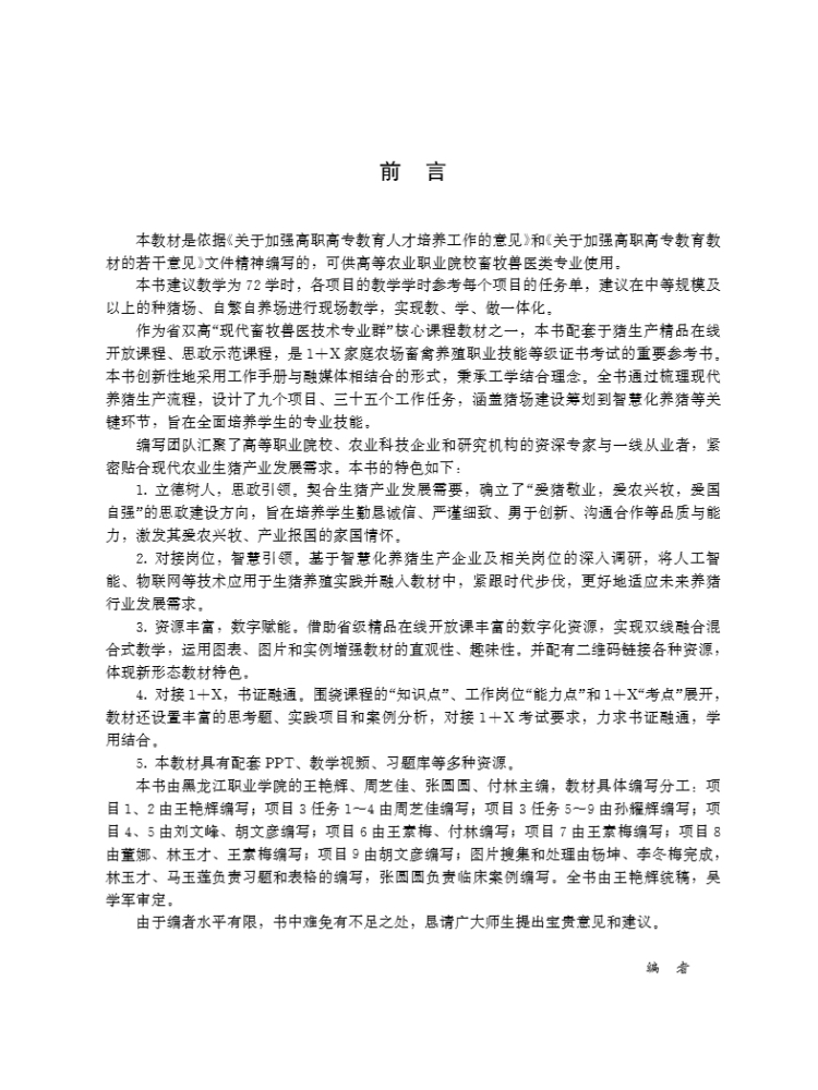 本教材是黑龙江职业学院重点建设专业———畜牧兽医专业的工作手册式融媒体教材,教 材围绕高等职业教育培养目标,贯彻“以素质培养为主线,以就业岗位为依据,以工作流程为 导向”的指导思想,依据认知规律、职业成长规律和知识的包容性关系,采用“项目导向、任 务驱动”模式,对教学内容进行归并、梳理、设计和序化。全书包括九个项目,即筹划猪场建 设、选用猪种、种公猪舍及配种舍关键技术、妊娠舍关键技术、分娩舍关键技术、保育舍关 键技术、生长育肥舍关键技术、管理猪场和智慧化养猪。每个项目由学习任务单、任务资讯 单、相关信息单、计划单、决策实施单、作业单、效果检查单和评价反馈单八部分组成,在 相关信息单中设置了若干个能力训练项目和必备知识,将知识学习融于技能训练。