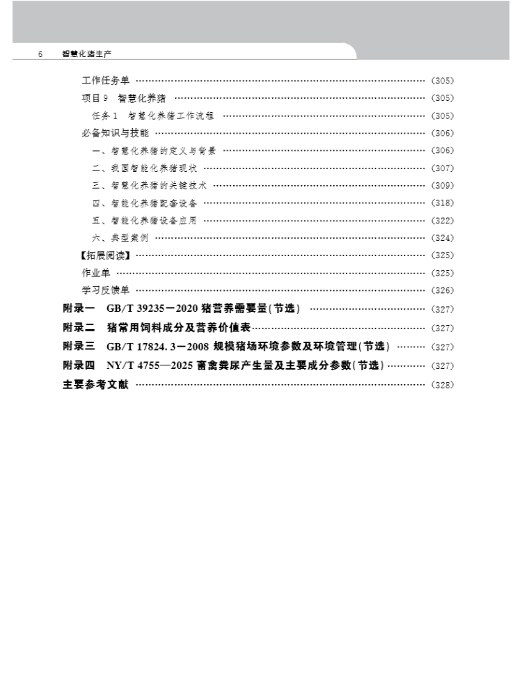 通过本教材的学习,学生能建猪场、备猪料、饲养管理各类猪群、管理猪场和应用人工 智能、物联网等技术设备进行智慧化养猪生产,为学习猪病防治,顶岗实习,毕业后从事养 猪生产奠定知识和技能基础。本教材也可为养猪相关技术人员提供借鉴与参考。