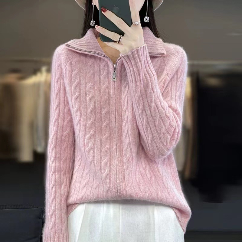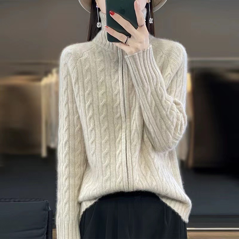 韩版翻领麻花纯色针织开衫女2024秋冬新款宽松双拉链气质毛衣外套