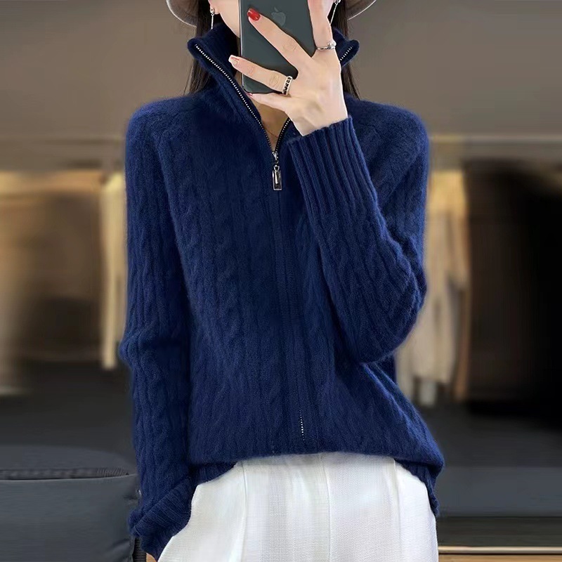 韩版翻领麻花纯色针织开衫女2024秋冬新款宽松双拉链气质毛衣外套 商品图1