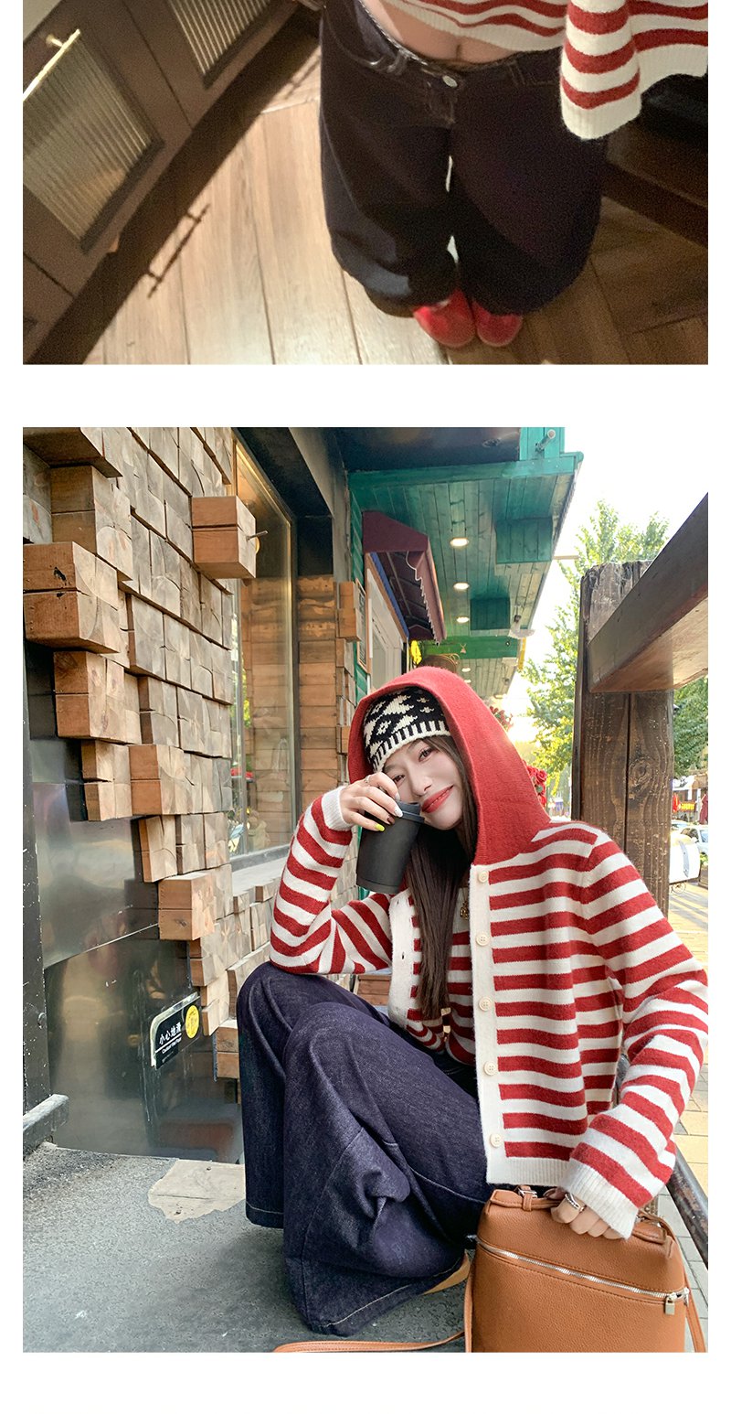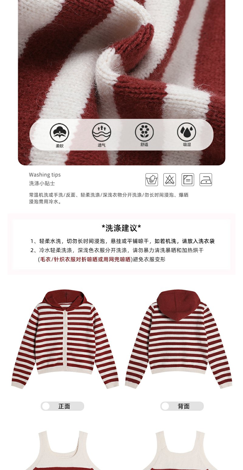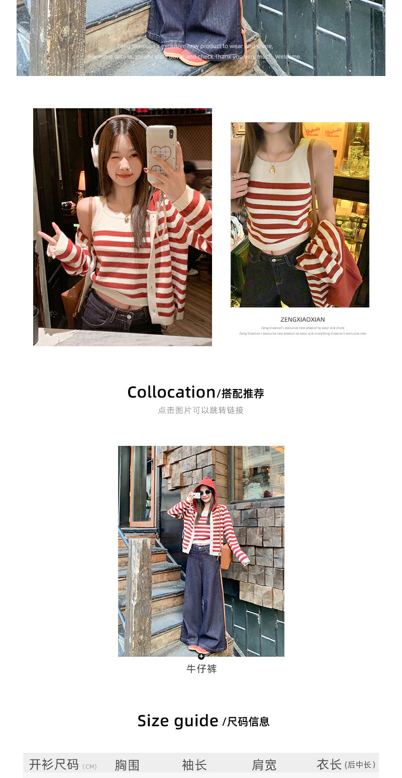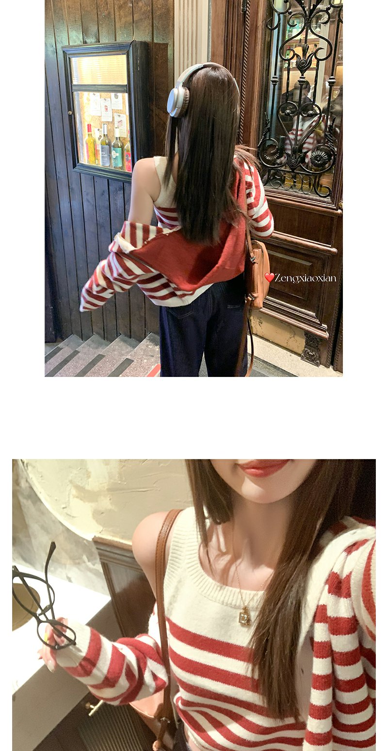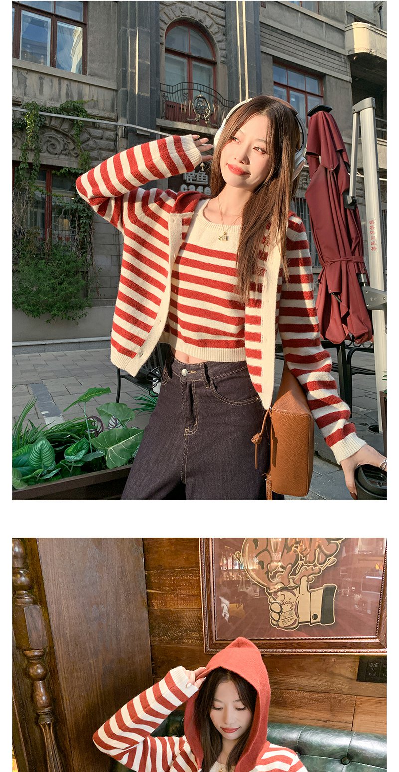 <曾小咸推荐>韩系红色条纹针织开衫女秋冬连帽毛衣修身内搭背心上衣套装
