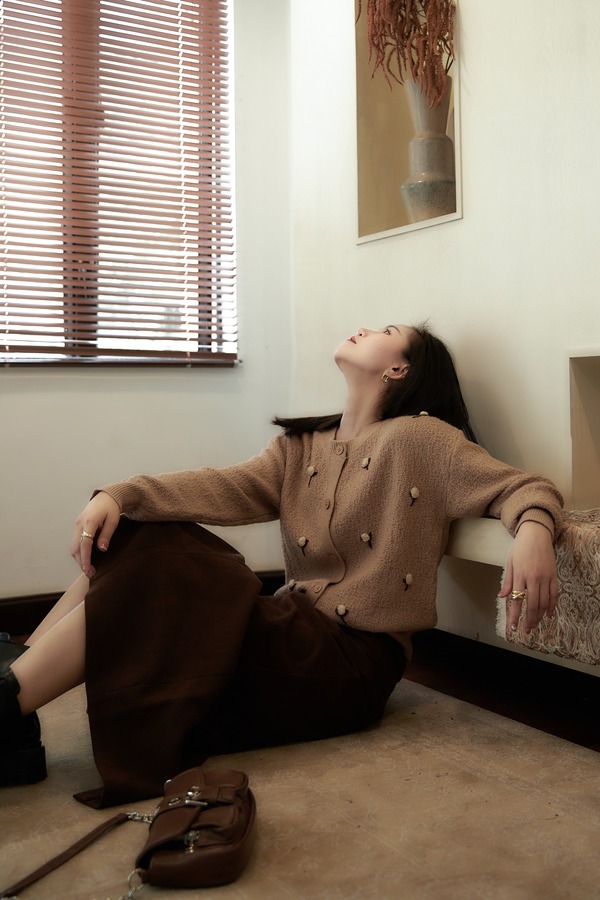 Stay2Weeks 咖色温柔知性花朵针织开衫 19037