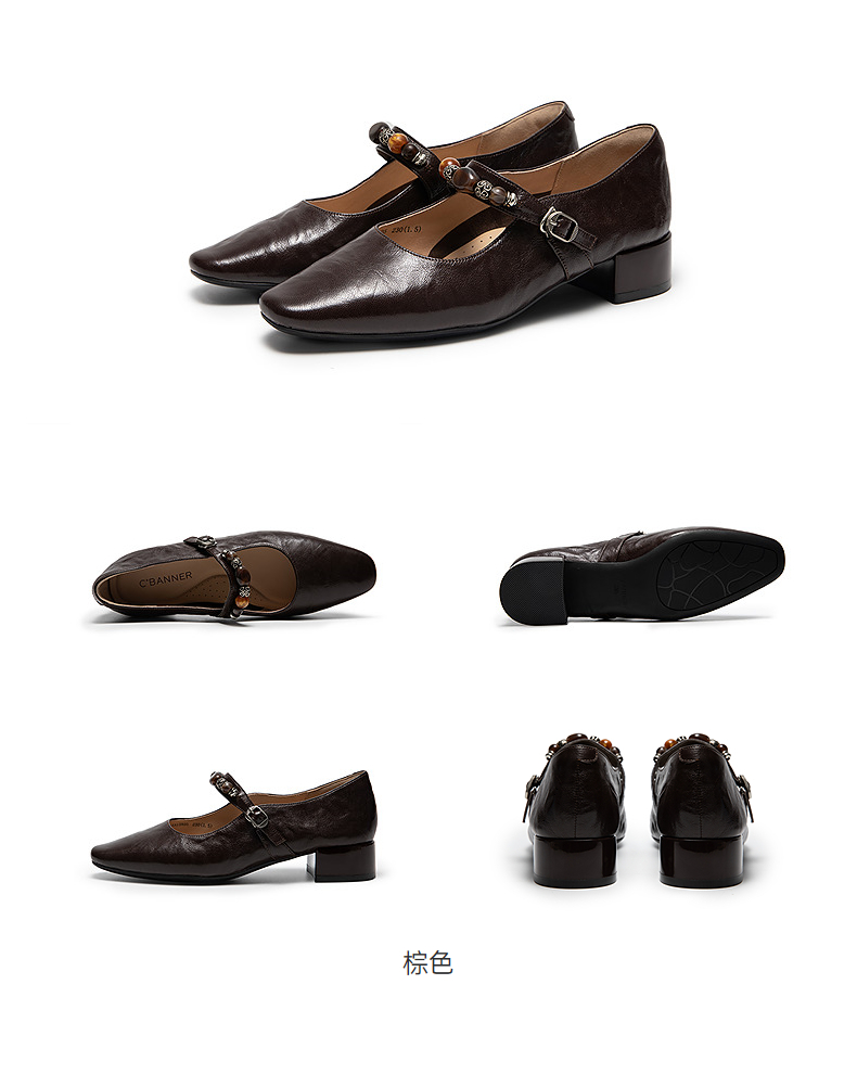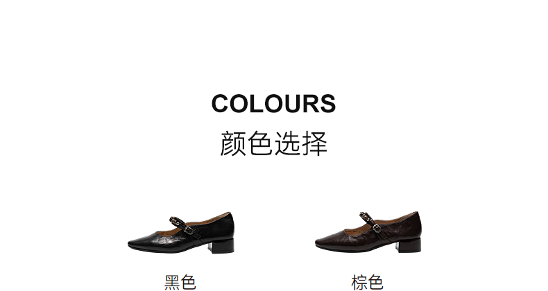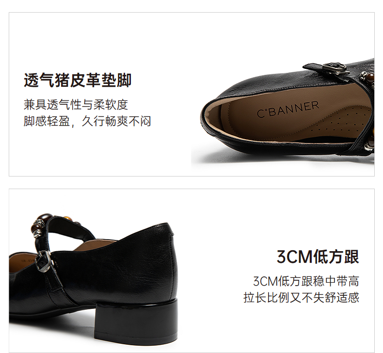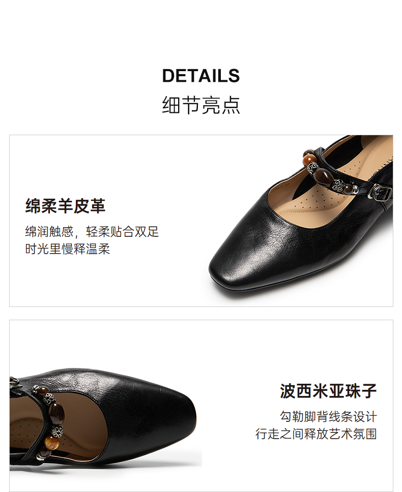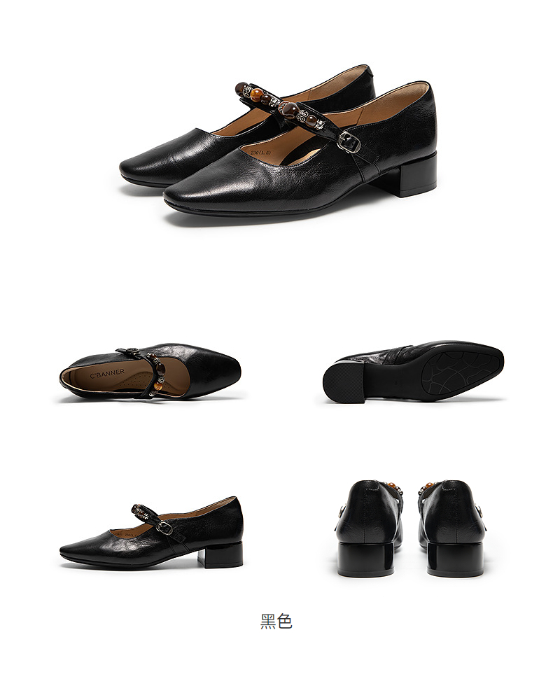 千百度复古羊皮玛丽珍鞋女通勤粗中跟浅口黑色单鞋A25453313