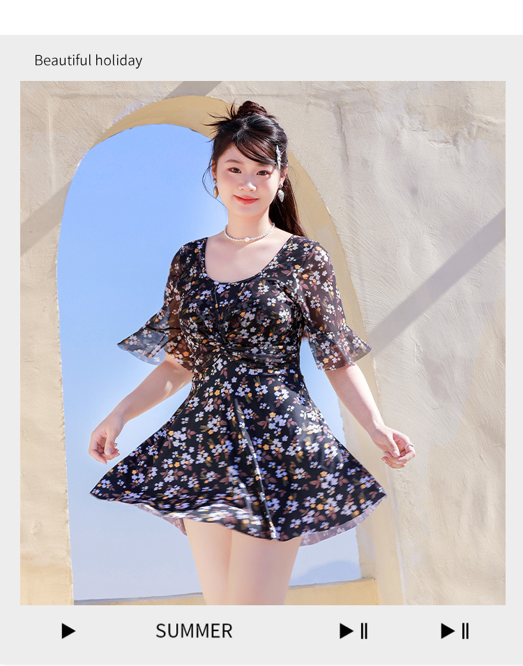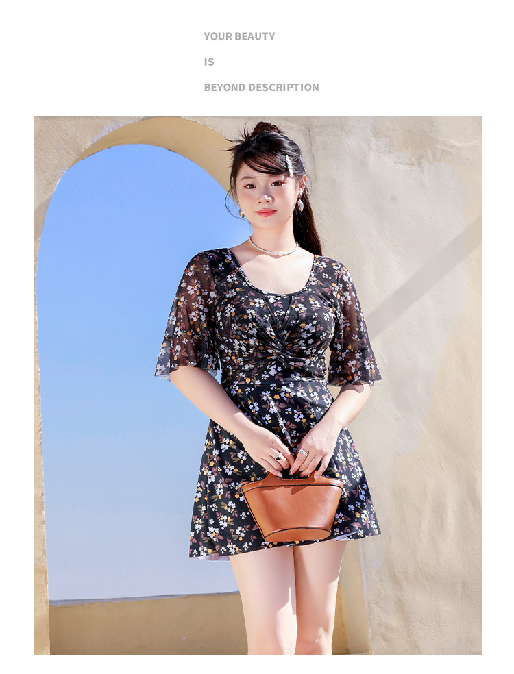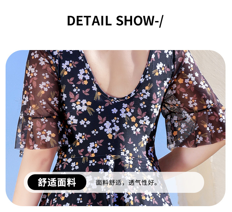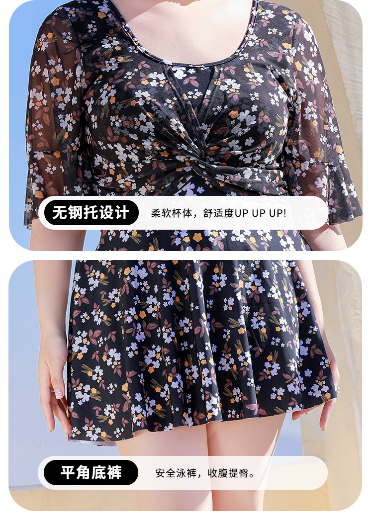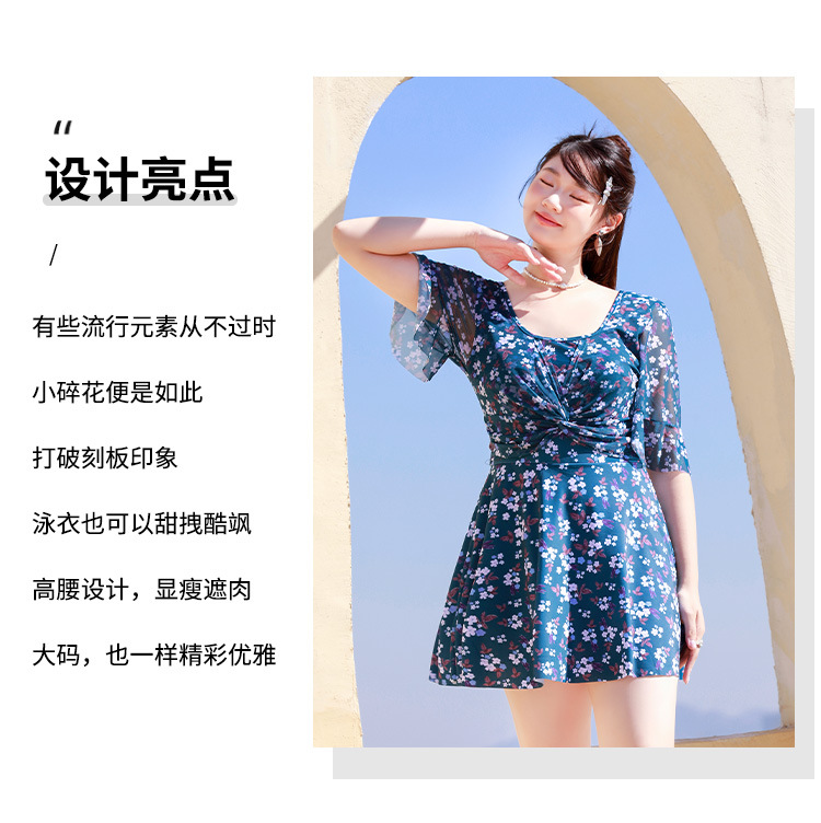 大码泳衣女中老年妈妈款 时尚连体碎花裙 保守泳衣显瘦加肥平角度假泳装