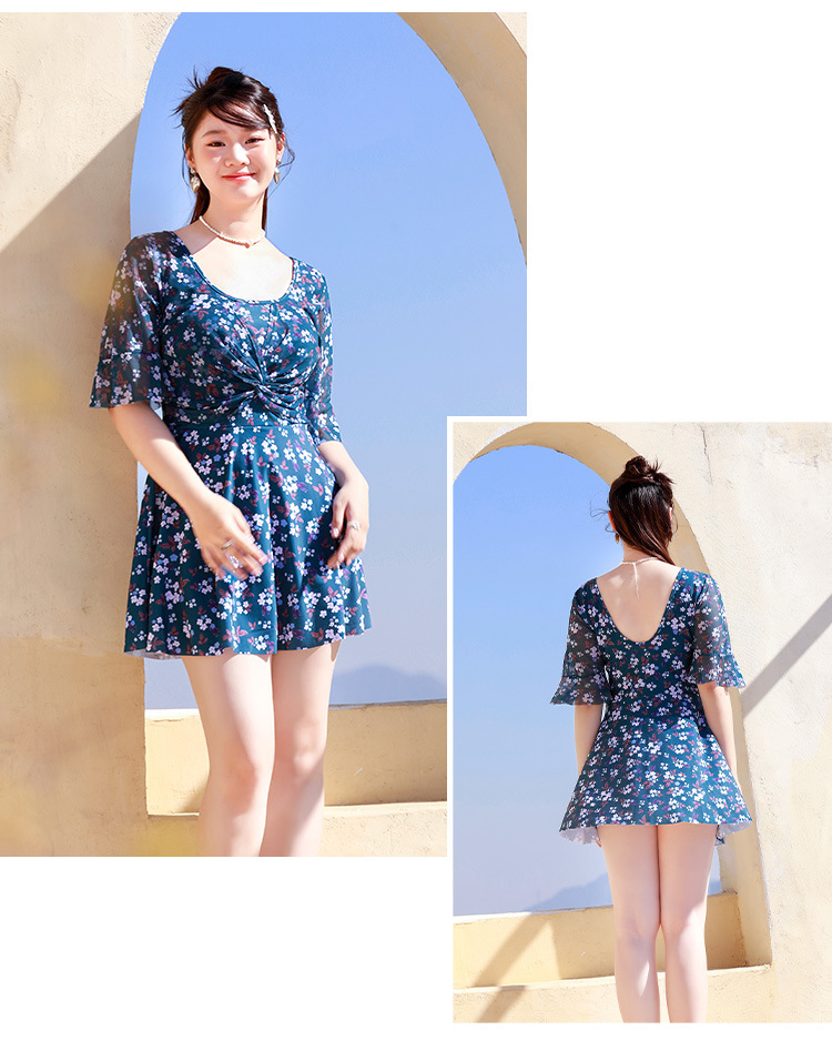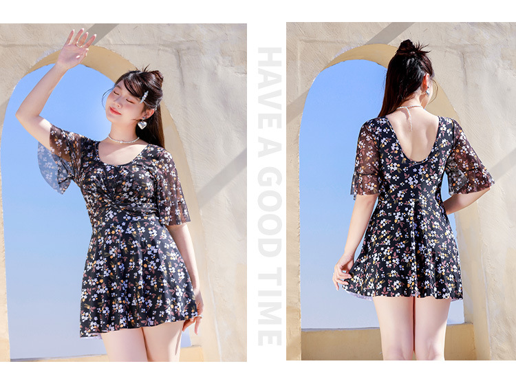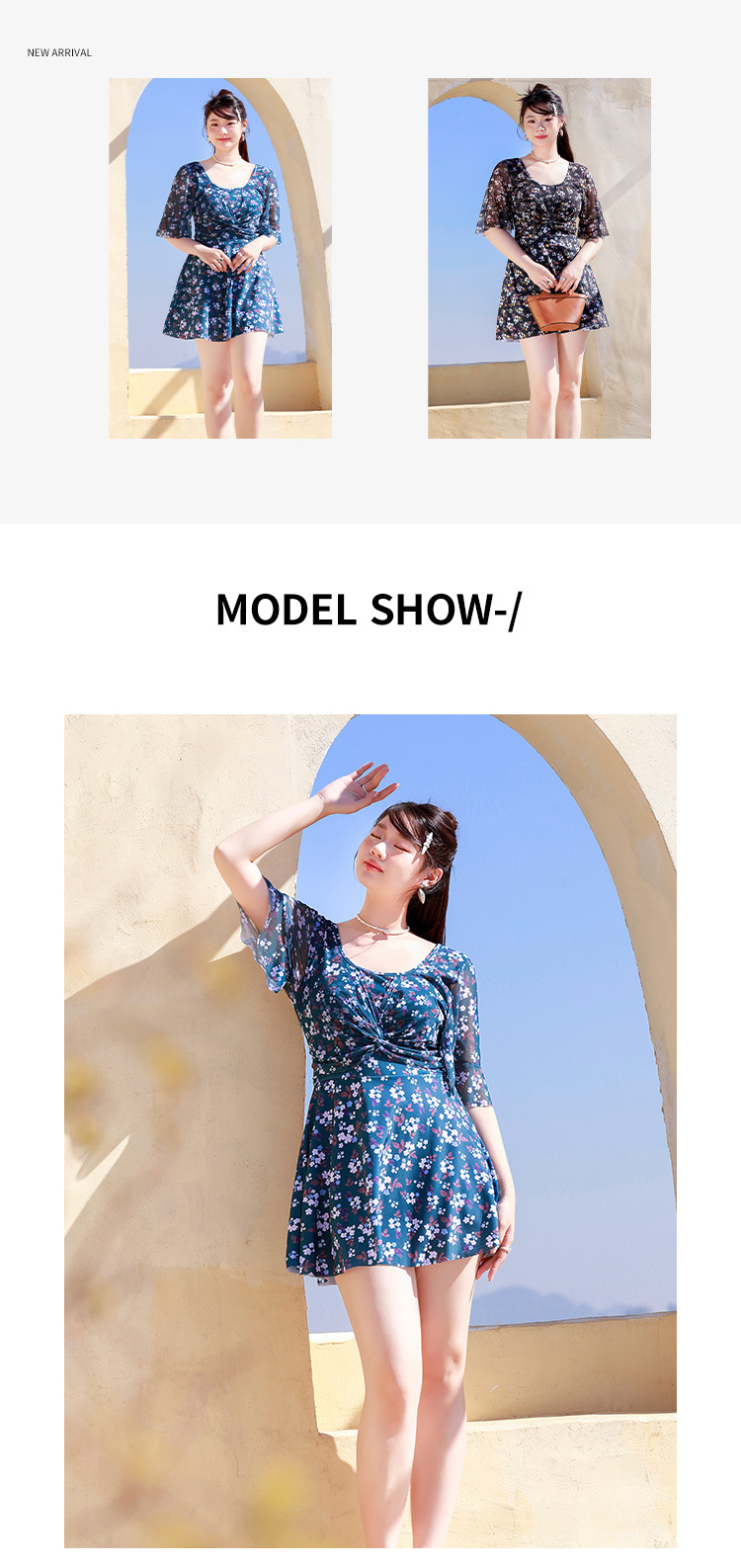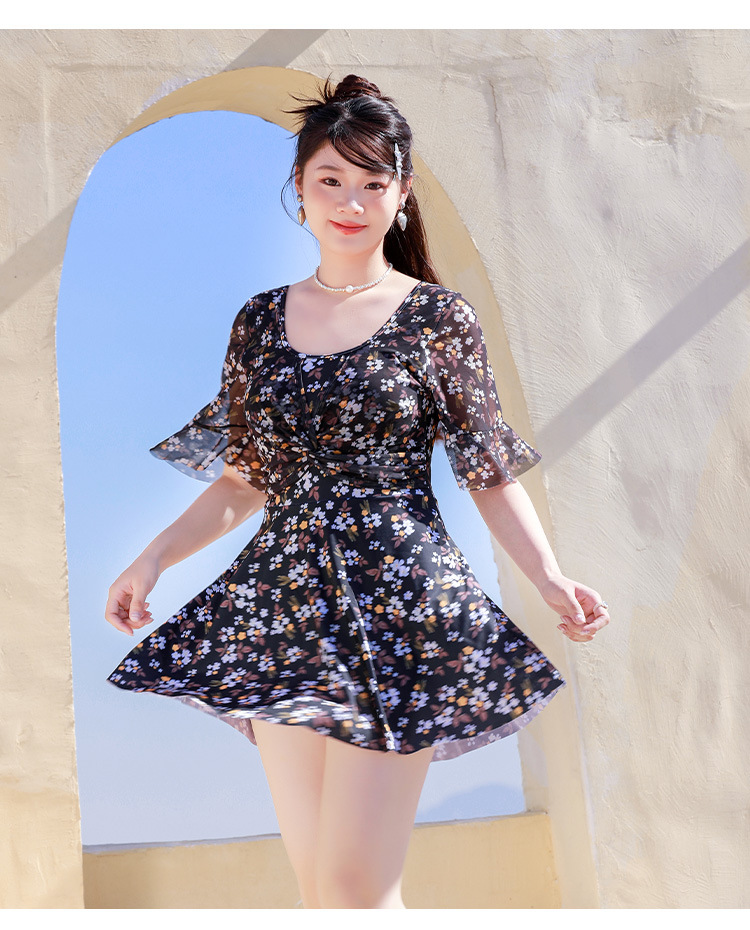 大码泳衣女中老年妈妈款 时尚连体碎花裙 保守泳衣显瘦加肥平角度假泳装