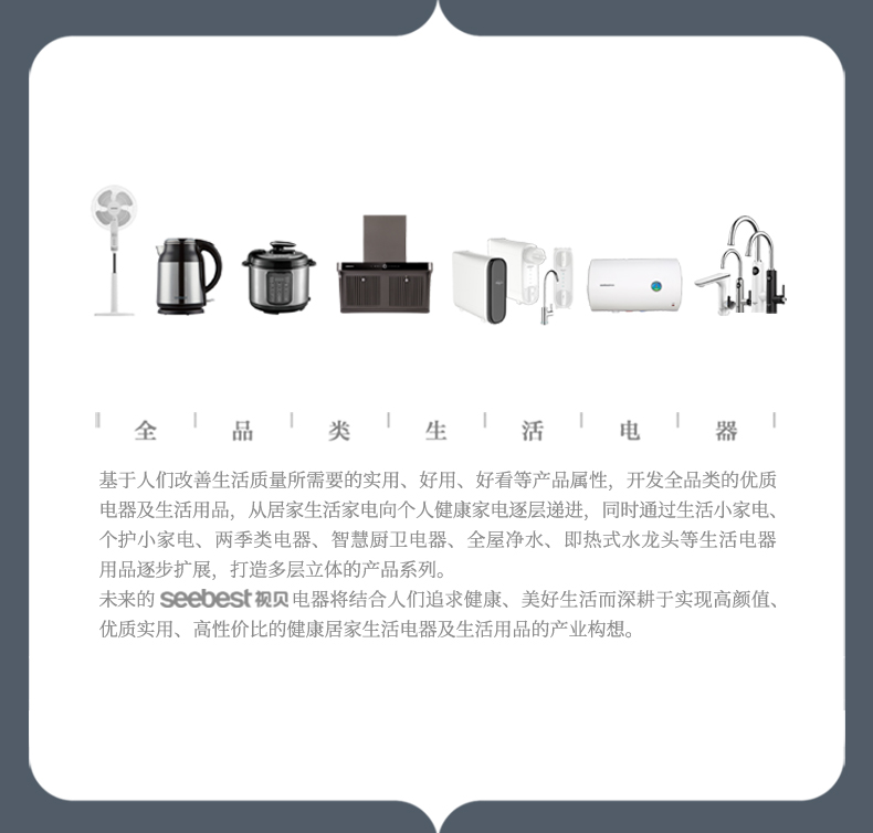 厦门视贝科技有限公司是集产品自主设计,研发,生产,销售于一体的高科技企业。拥有80000平方米的制造厂房,核心员工2000多人。产品线涵盖照明、电工,卫浴,线路,集成风暖等领域。