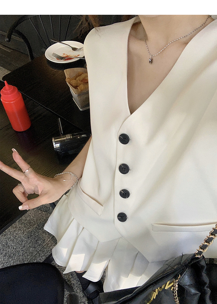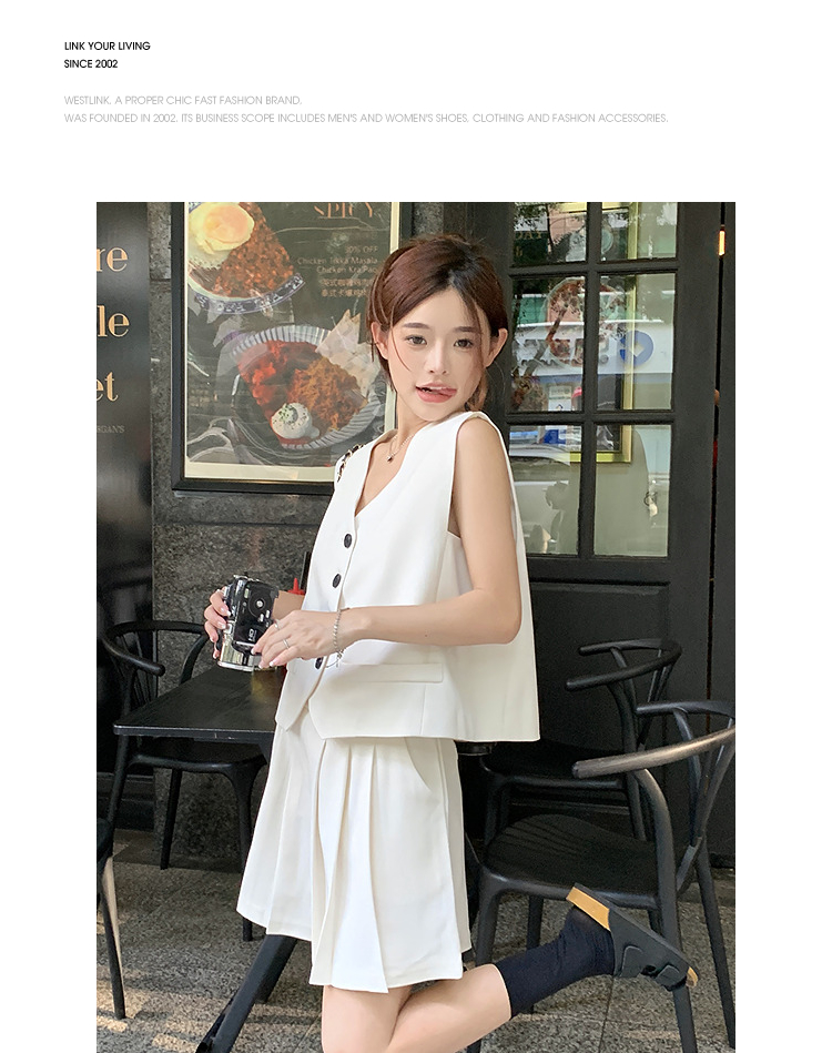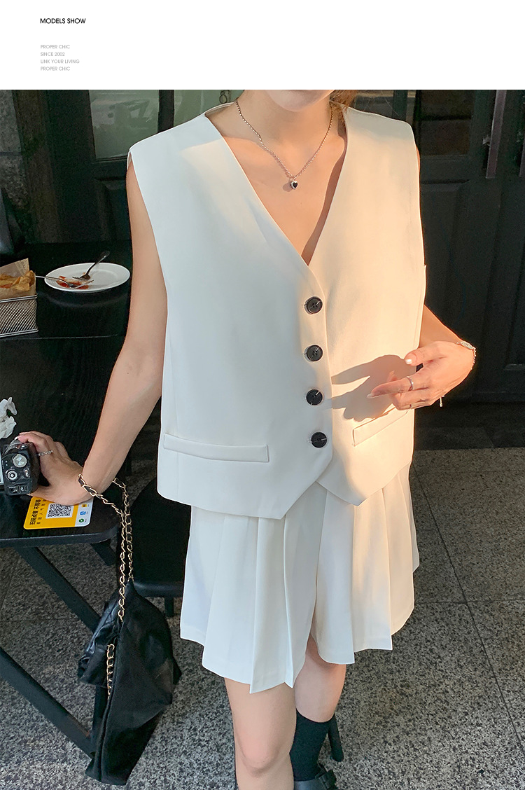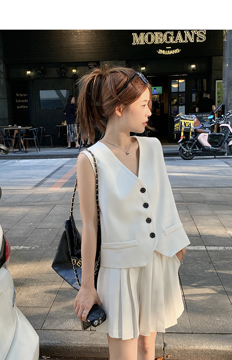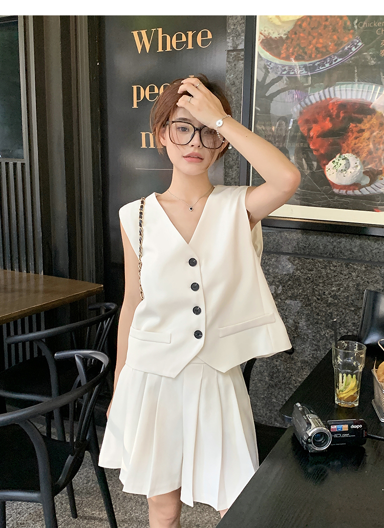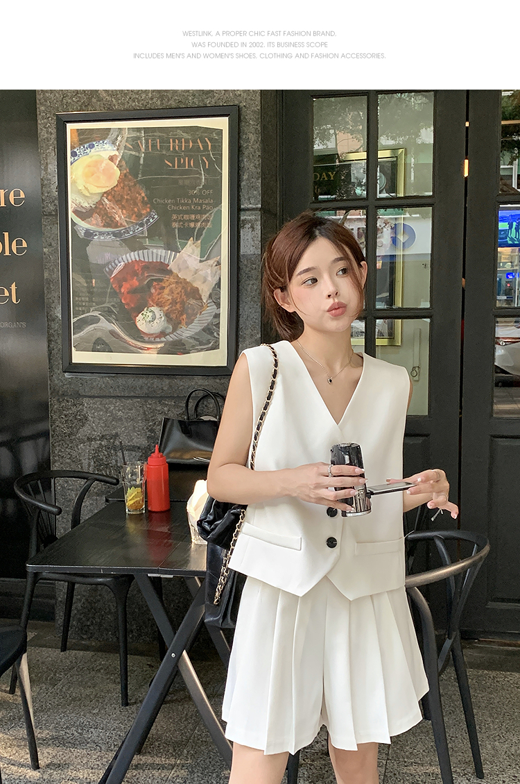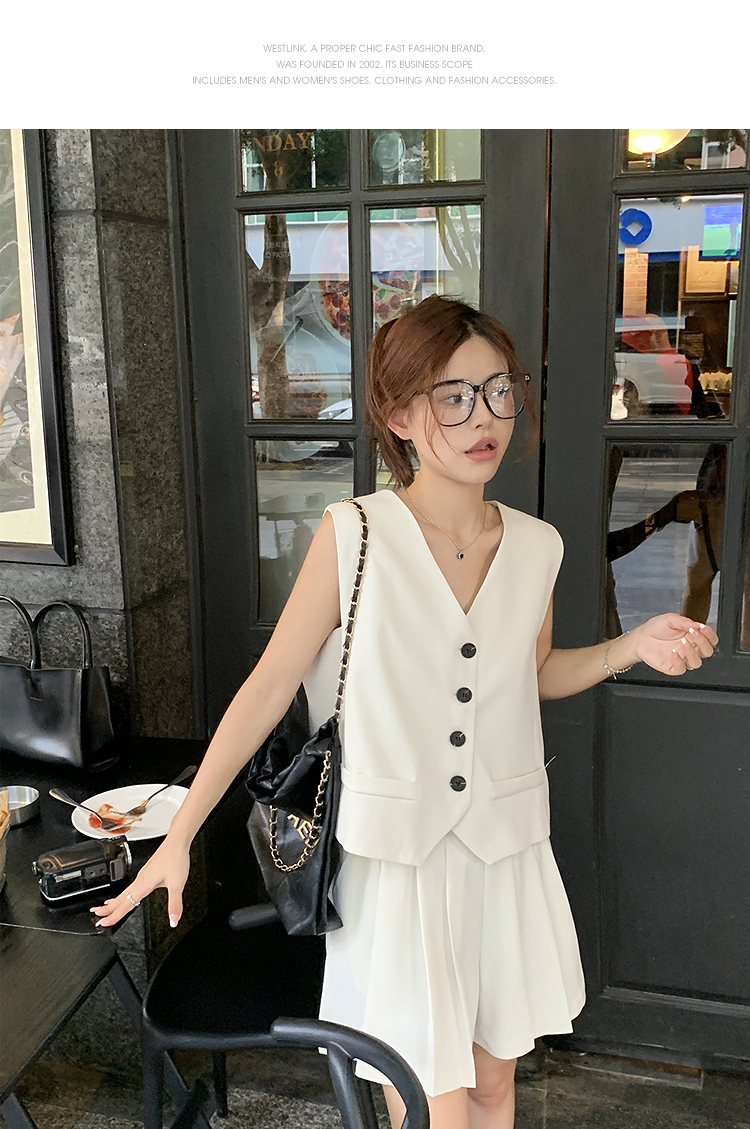 西遇马甲背心套装女夏季新款白色高腰A字百褶裤裙两件套SS050507/SS050508