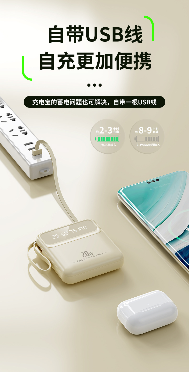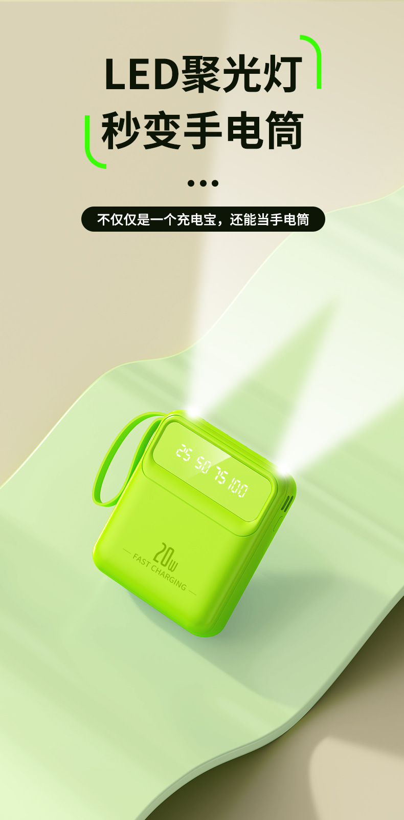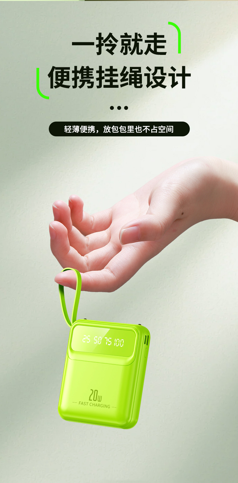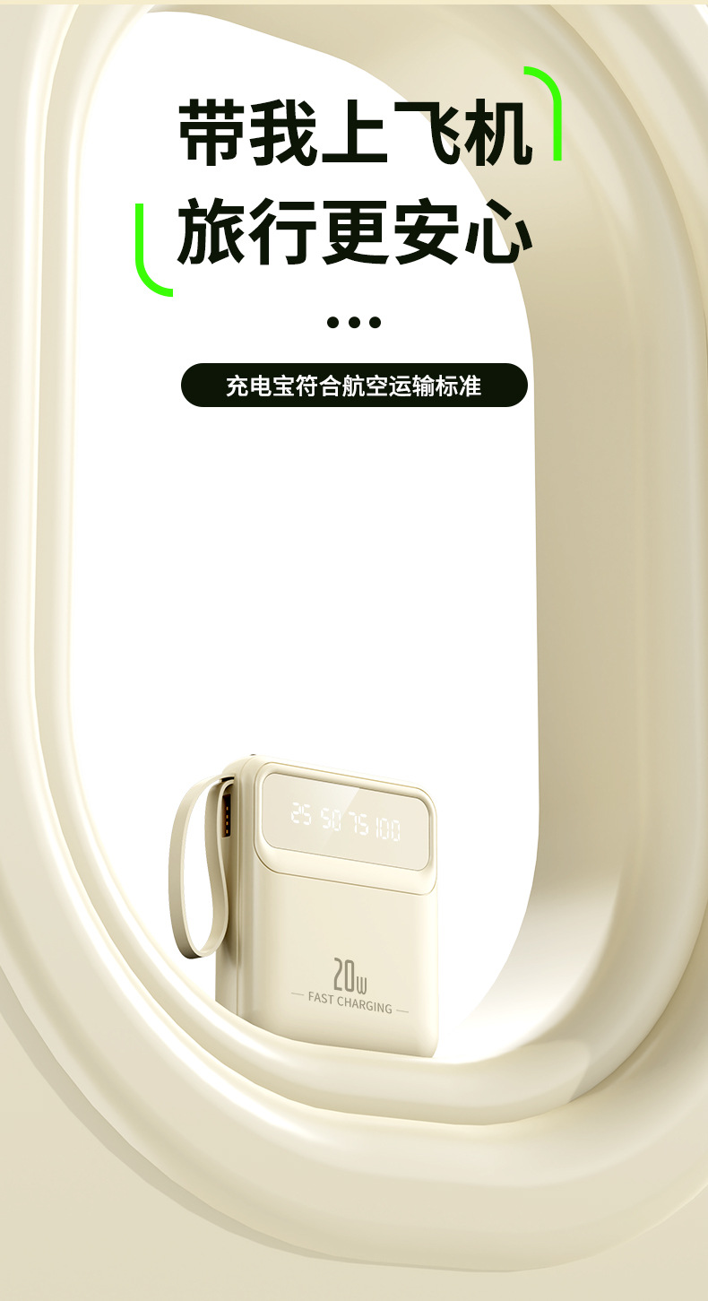 【随身“小法宝”】新款便携自带线充,灯亮常伴你左右。20000mAh大容量,便携挂绳,镜面光芒颜值高。手机保驾护航,旅行必备良伴。