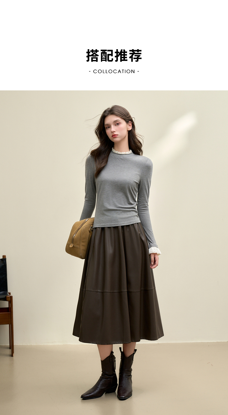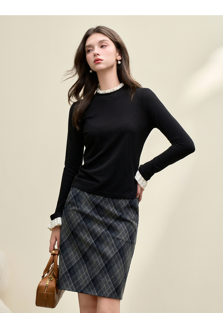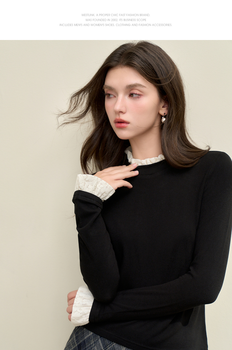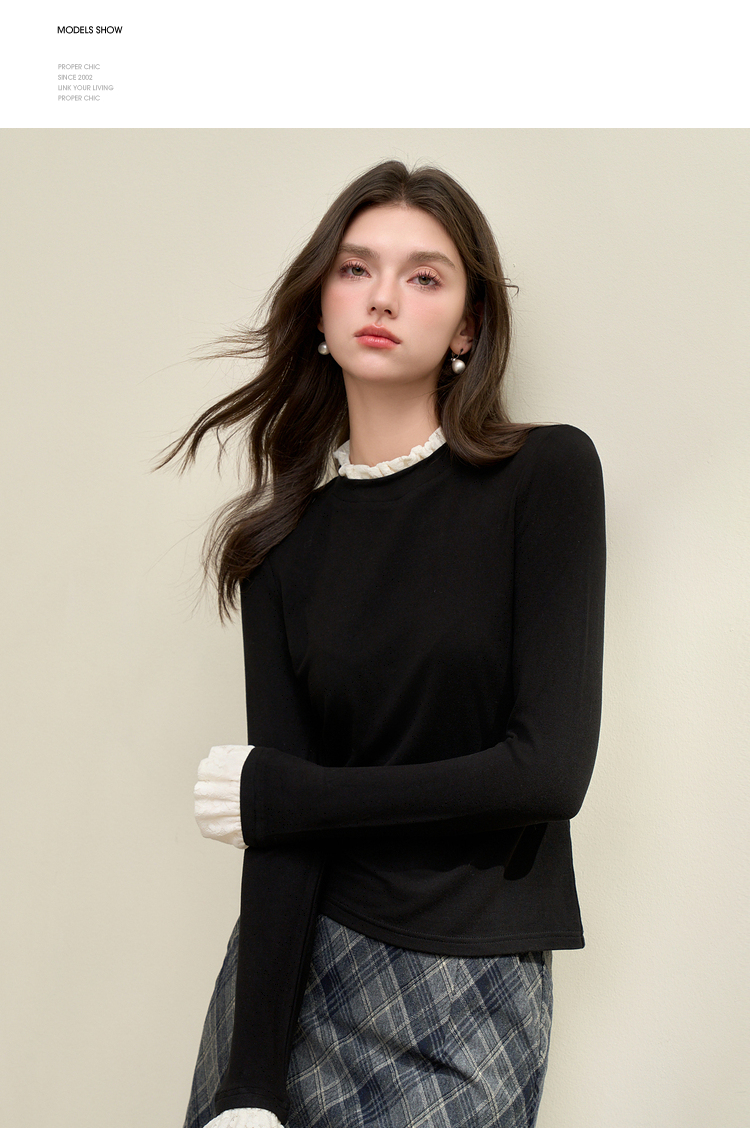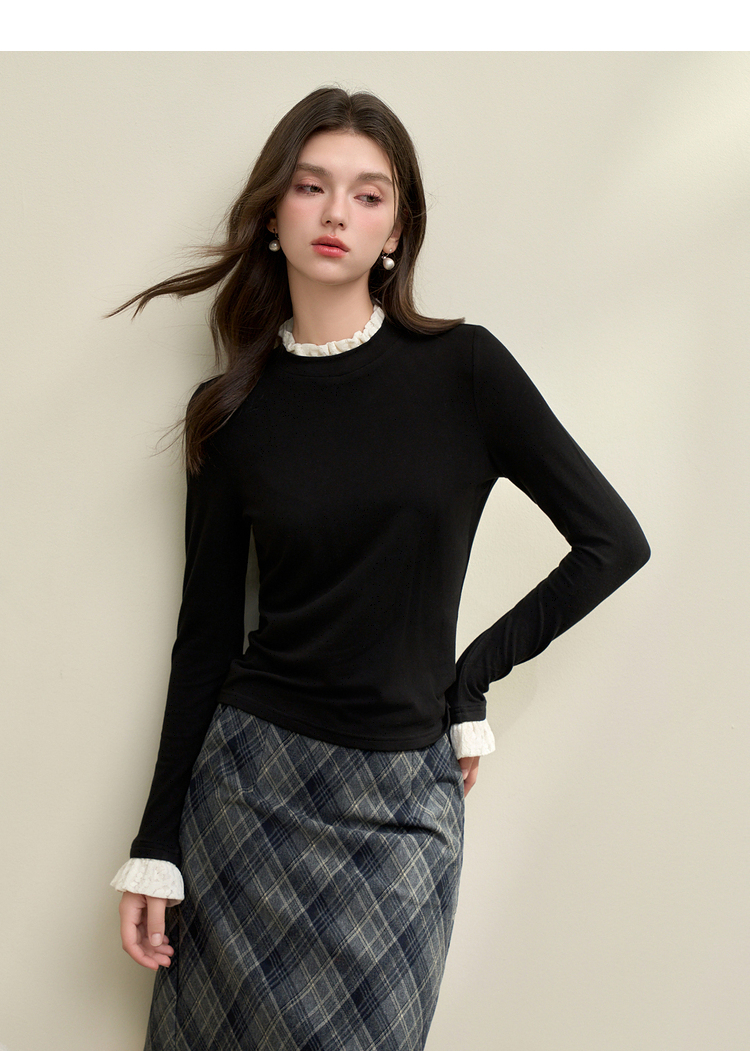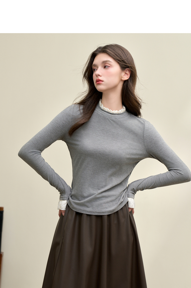德绒保暖假两件设计简约木耳边长袖T恤女修身打底衫V3942677