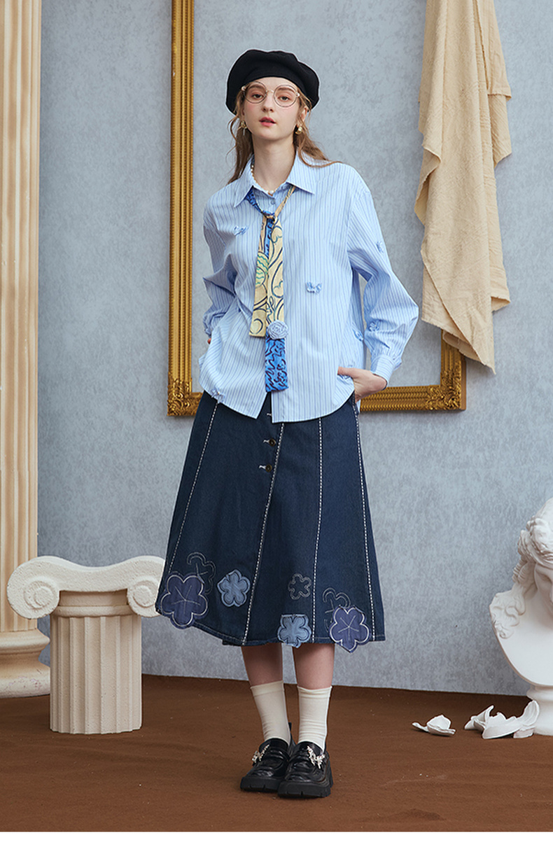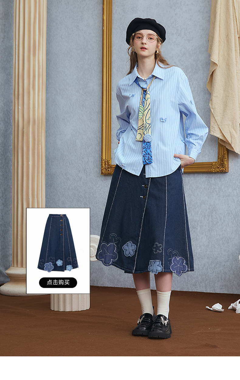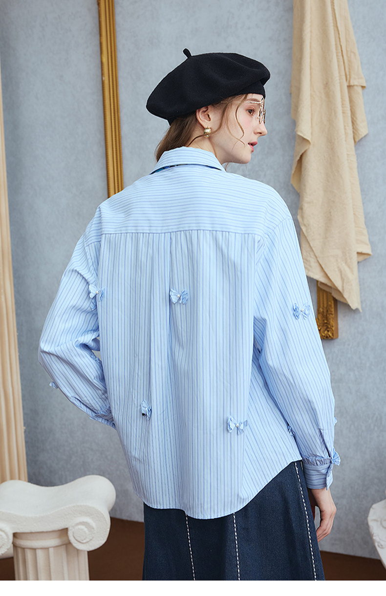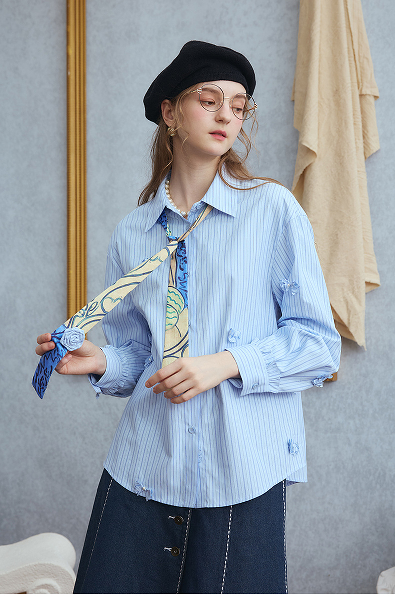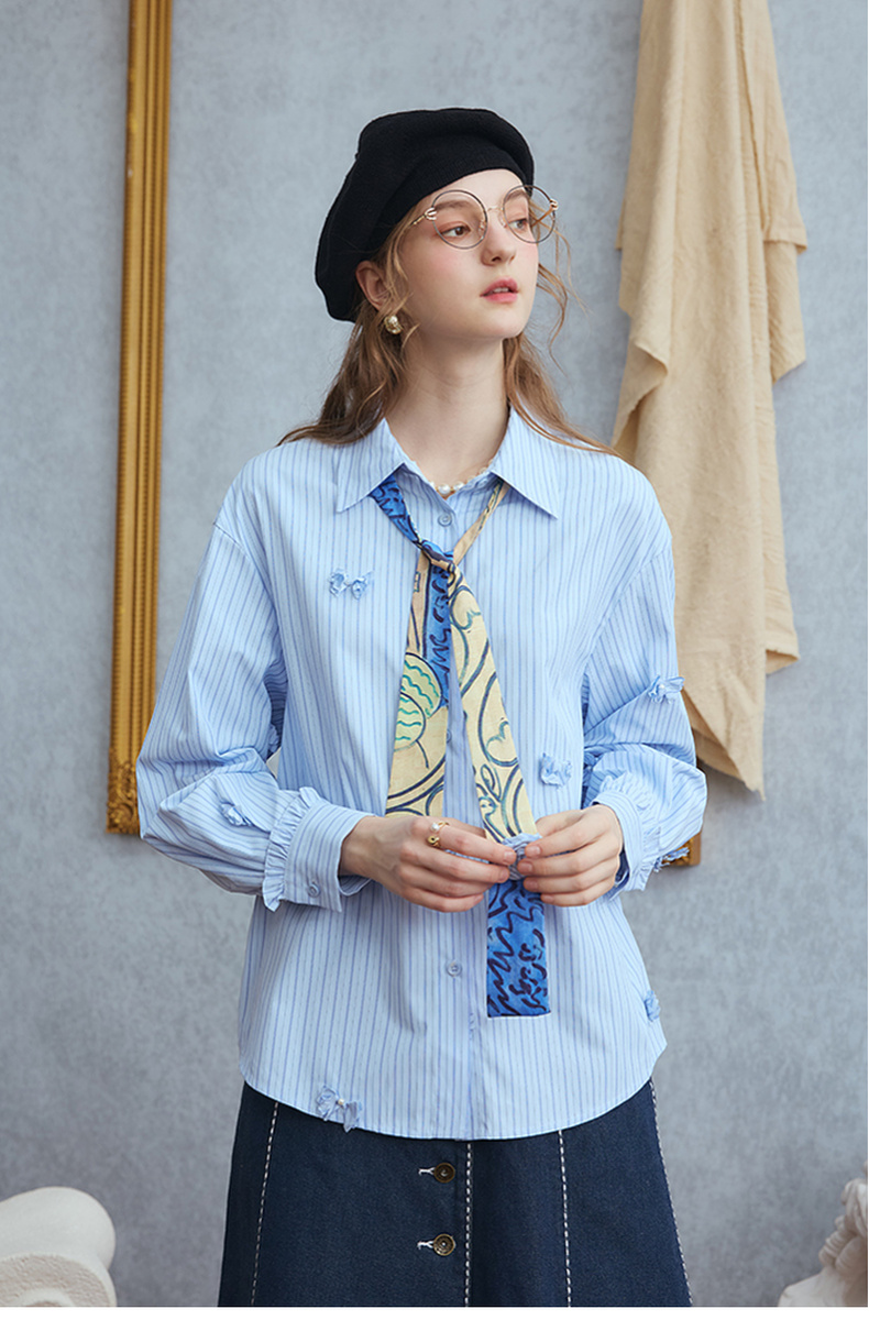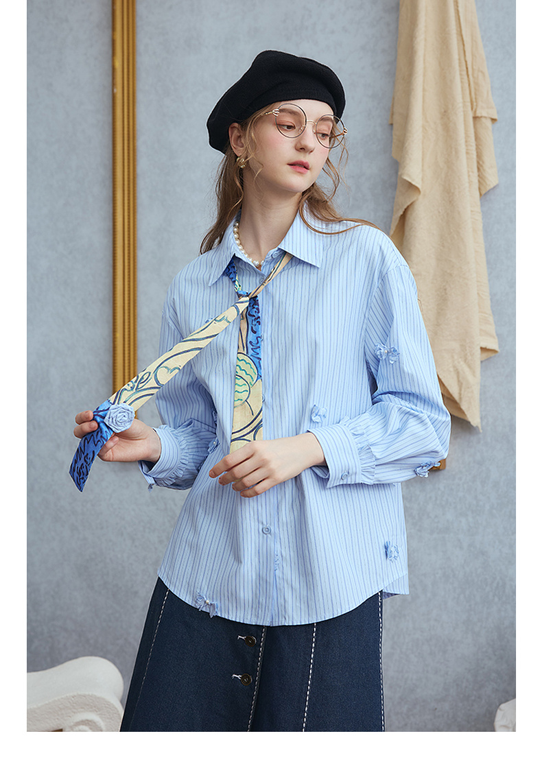 两三事不拘心迹小清新印花领带v领长袖衬衫女宽松衬衣