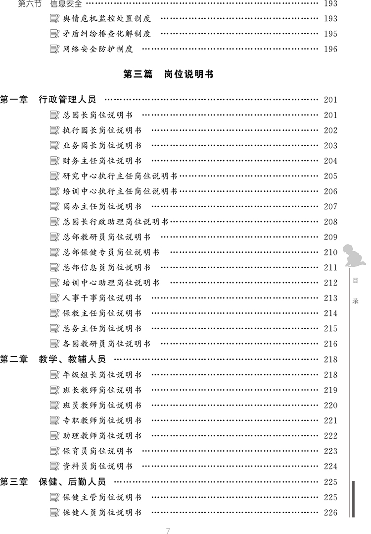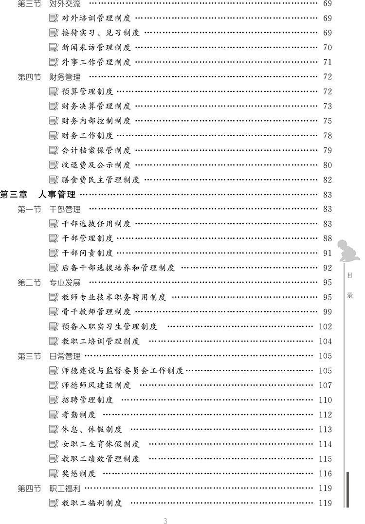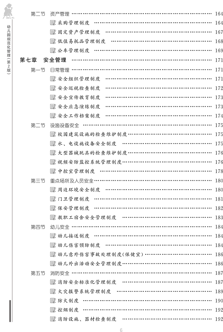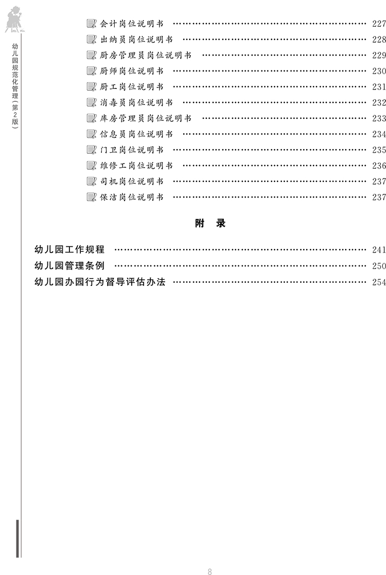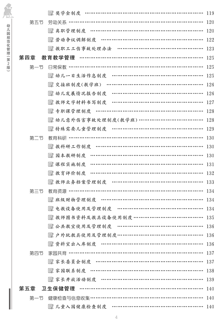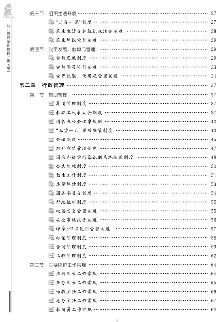 北京师范大学实验幼儿园在逾百年的办园历程中,不断积累管理经验,跟随我国法制化进程,反复修订完善有利于园所规范化管理的规章制度等,形成了系统、科学、合理的管理制度体系。全书从促进规范化园所管理出发,精选符合园所实际的各类规范化管理工具,主要包含园所文化、规章制度和岗位说明书三大部分。微观方面分别从规章制度和岗位说明书两方面呈现,包含党组织工作、行政管理、人事管理、教育教学管理、卫生保健管理、后勤管理、安全管理八个方面共147项规章制度和行政管理人员,教学、教辅人员,保健、后勤人员三大类共37个岗位说明书。其中规章制度配备了相应的数字资源表单,方便读者参考和使用。第2版在第1版的基础上,进行了更新和完善,并删除合并了部分制度,使其更贴合当前的教育环境,实用性更强,可为幼儿园管理者、一线教师、保健及后勤人员的具体工作提供参照标准。
