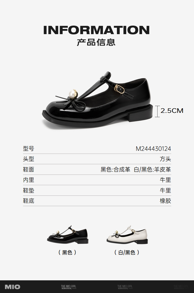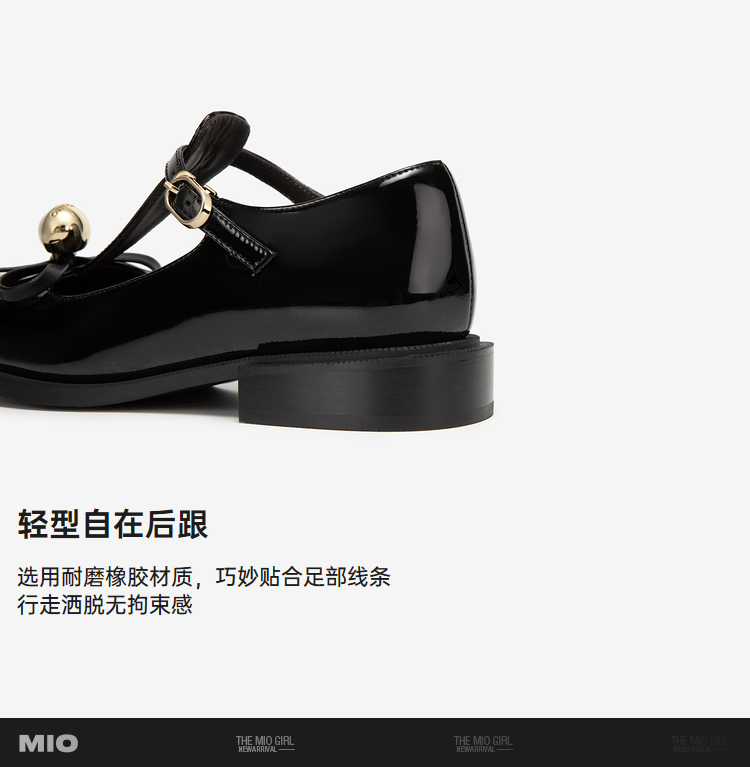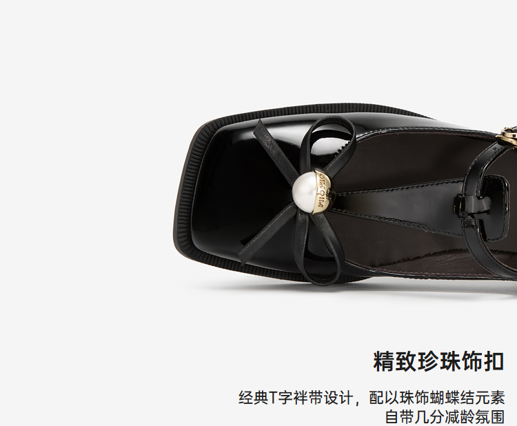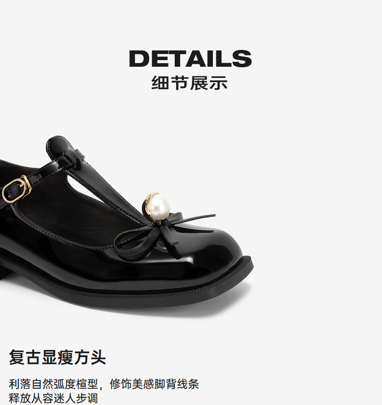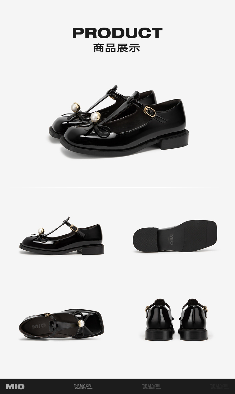 MIO米奥秋季显瘦方头低跟女鞋T字袢带珍珠饰扣减龄玛丽珍女M244430124
