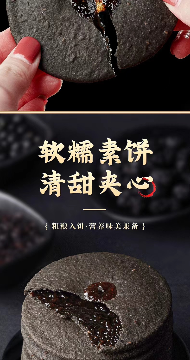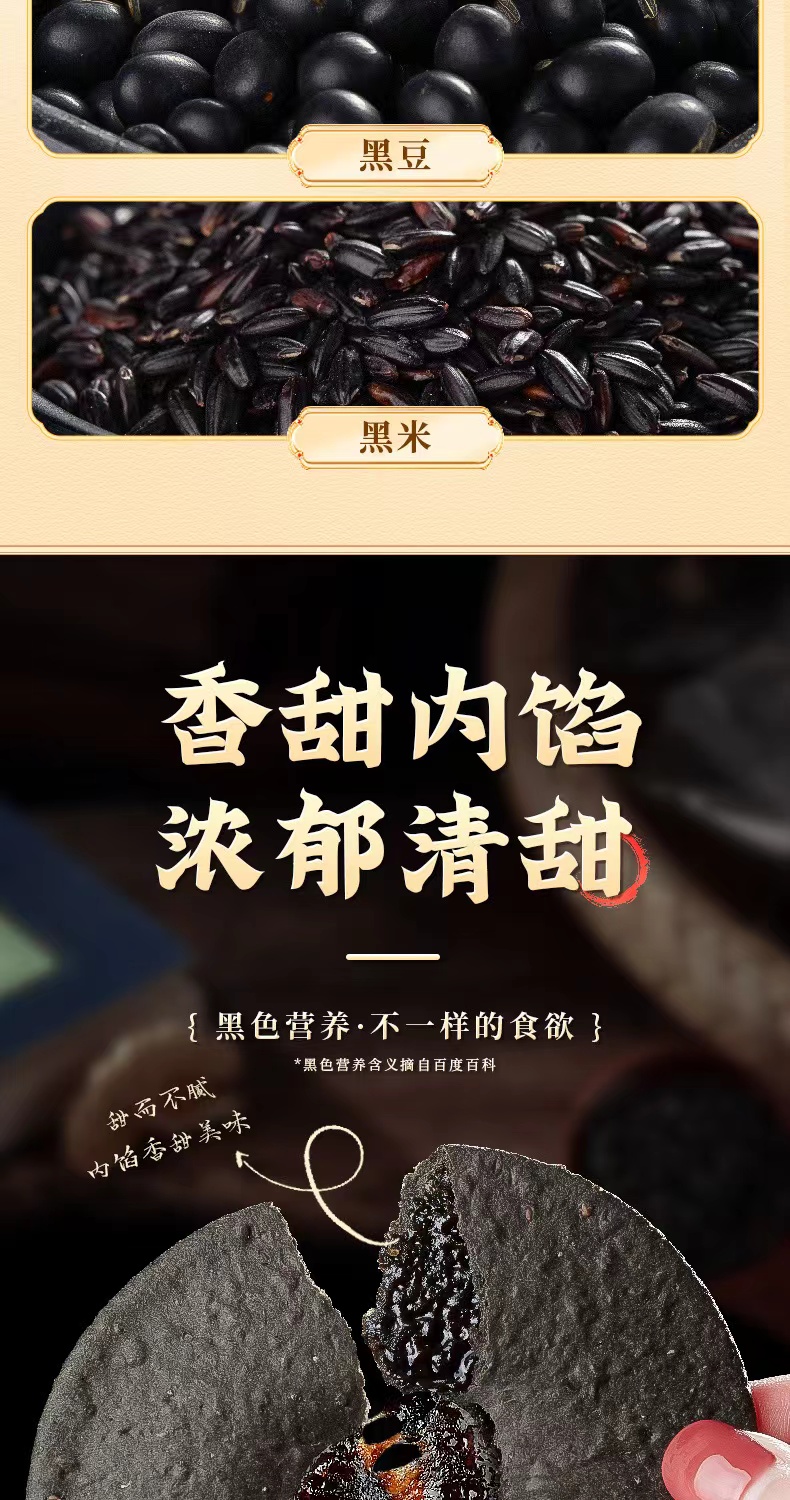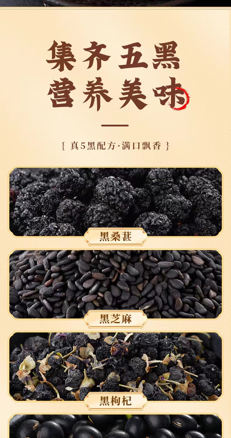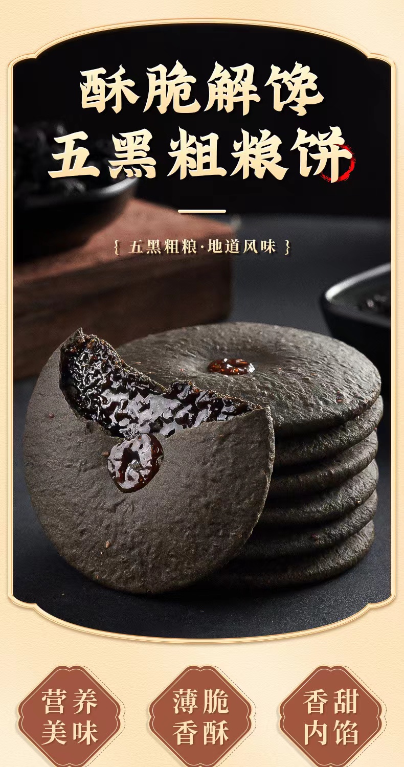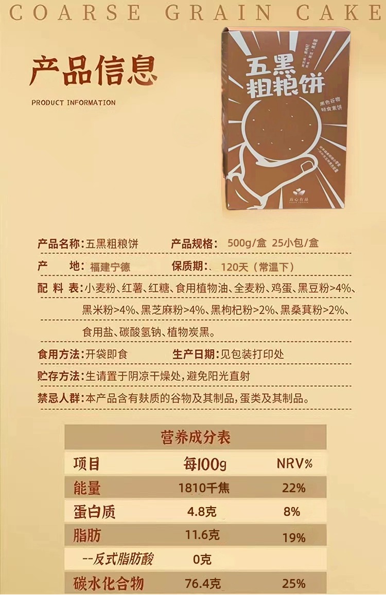 配料表:小麦粉、红薯、红糖、食用植物油、全麦粉、鸡蛋、黑豆粉≥4%、黑米粉≥4%、黑芝麻粉≥4%、黑枸杞粉≥2%、黑桑葚粉≥2%、食用盐、碳酸氢钠、植物